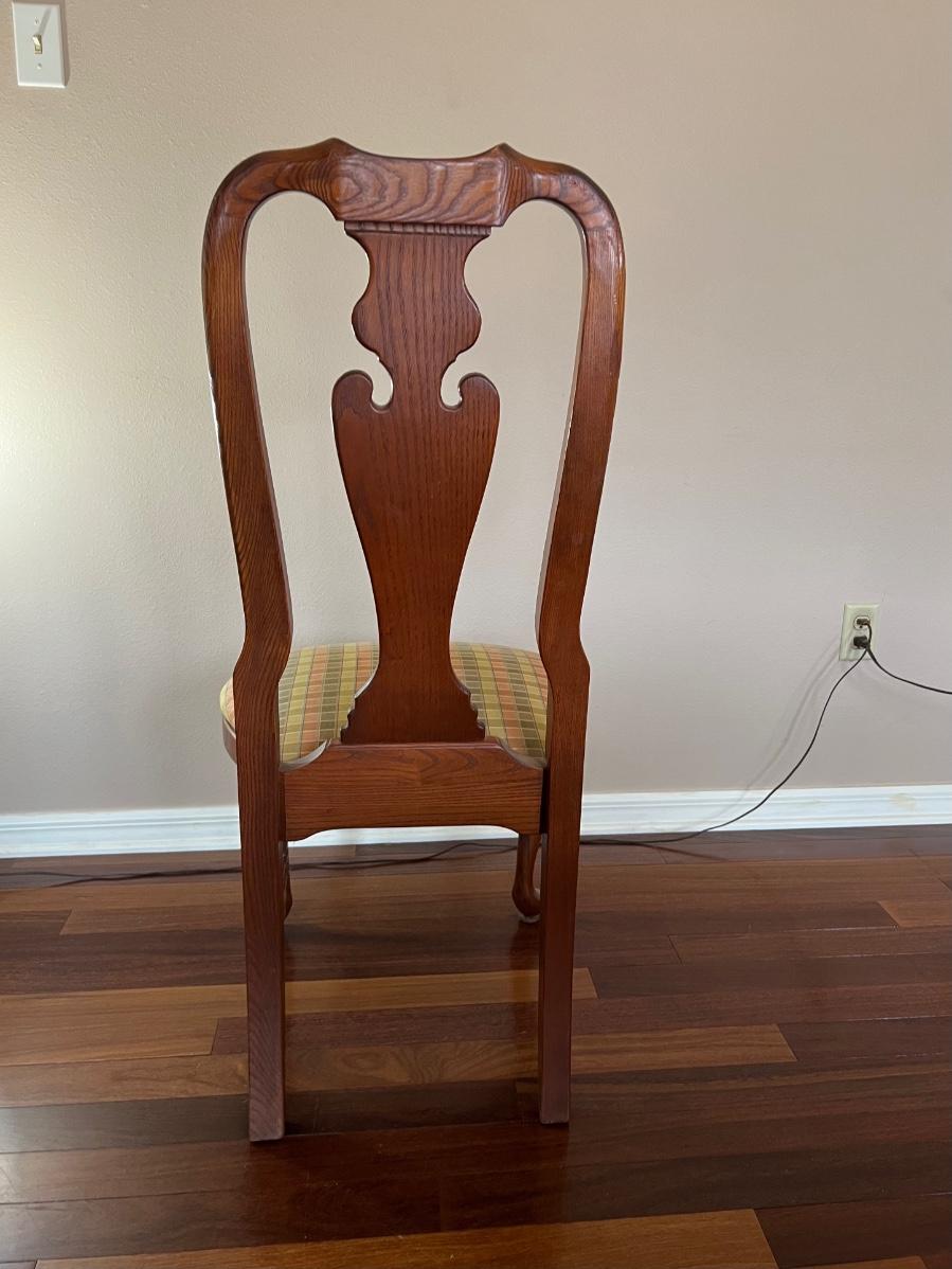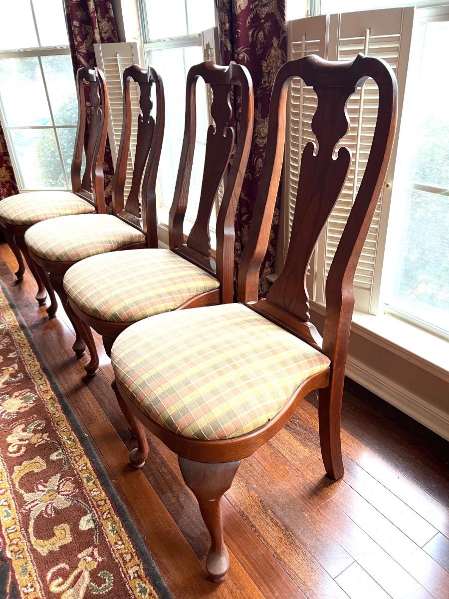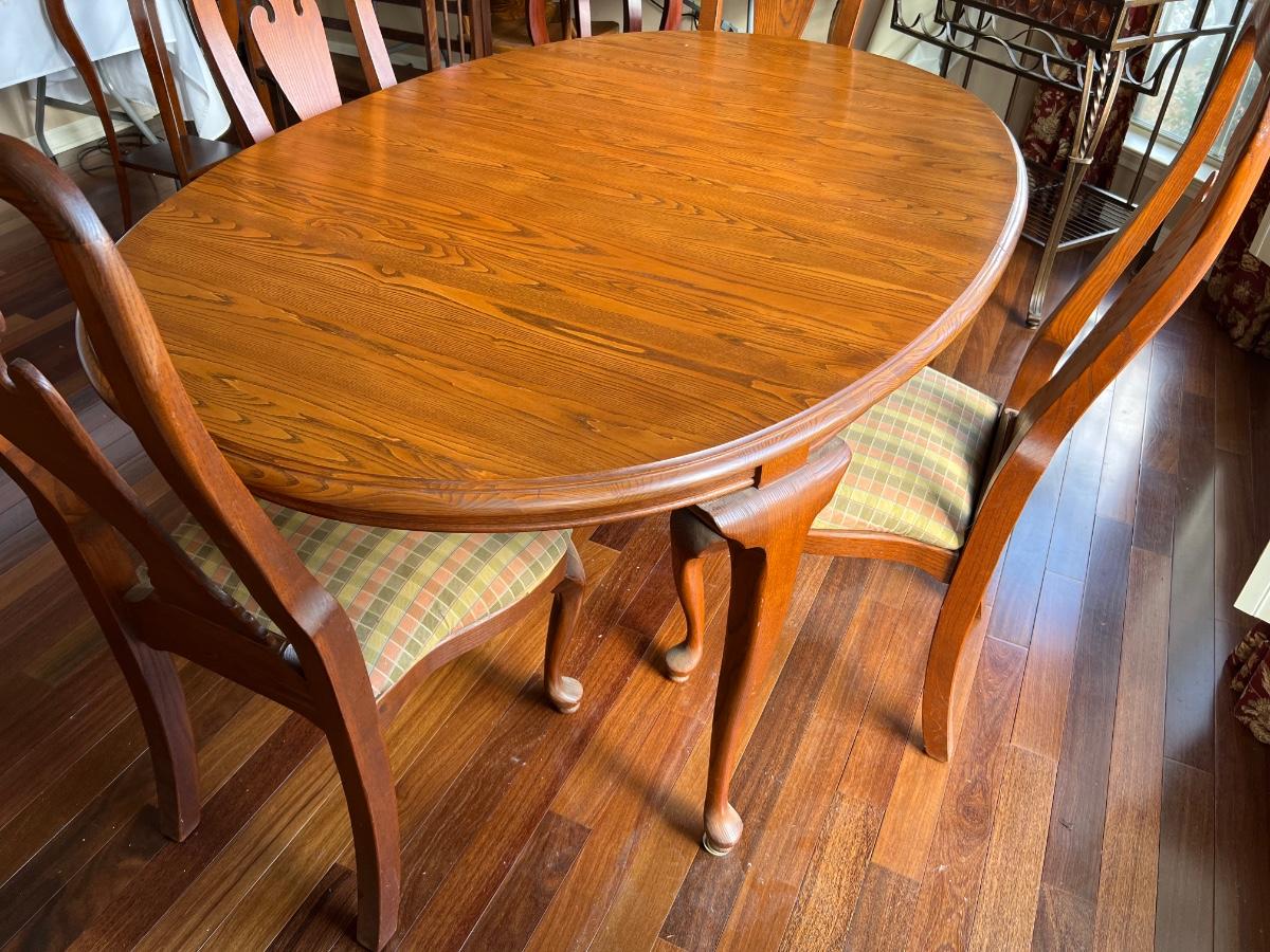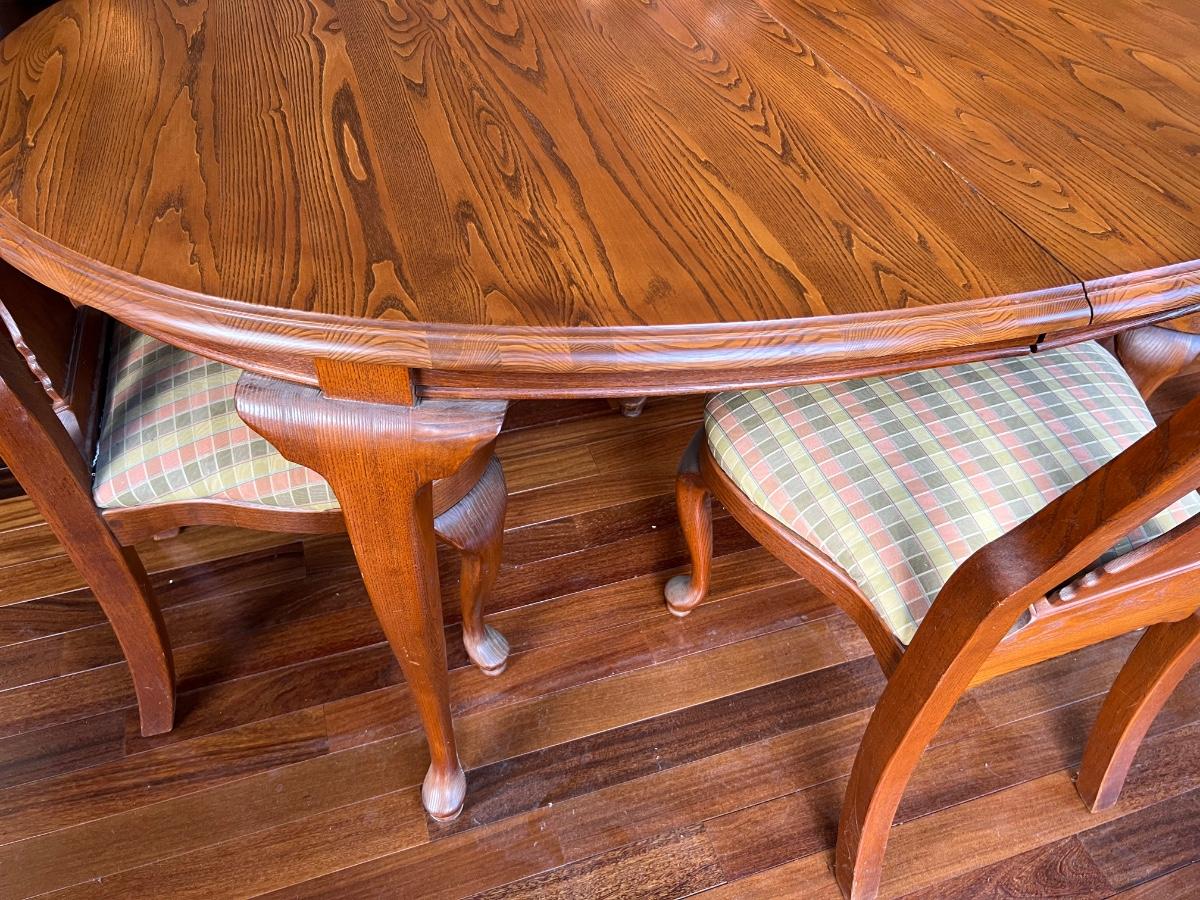 Solid wood Table with 4 chairs measures 66 inches long, 43 inches wide as pictured. Table has two additional leaves measuring 12 Inches each. Table can potentially be 90 inches long. Chairs measure 18 inches from the floor to seat.