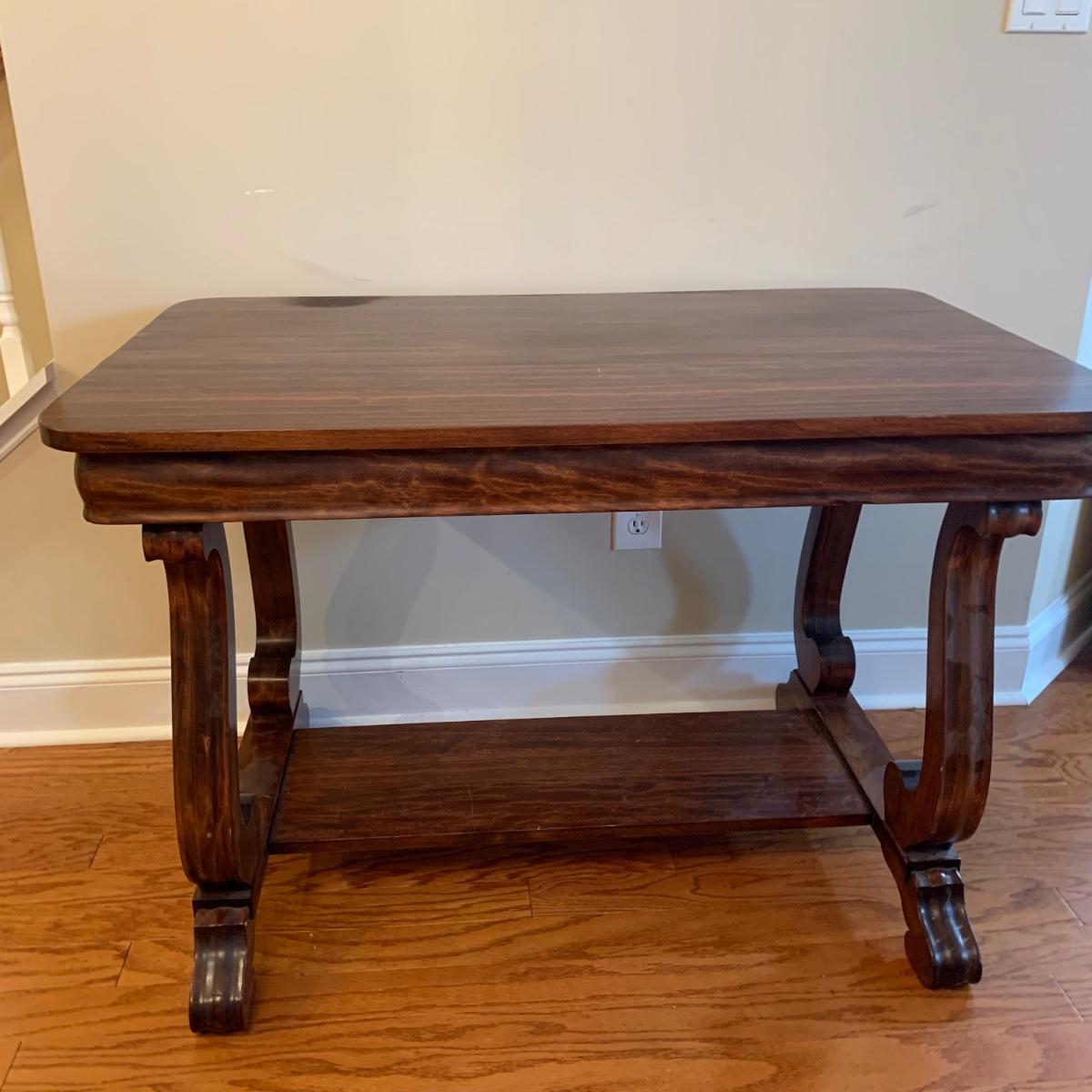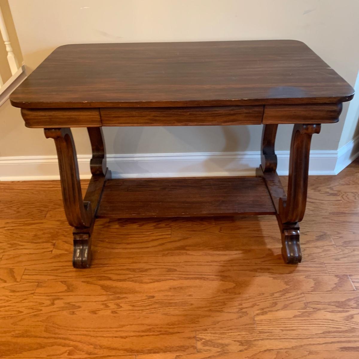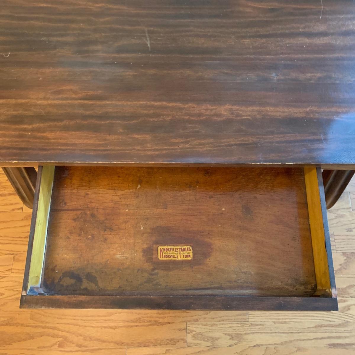 Solid wood table by Knoxville Tables Table and Chair Company. Table has a single dovetailed drawer. Table measures 42” x 26.5” x 28.5”H. It has some scuffs and nicks; see photos.