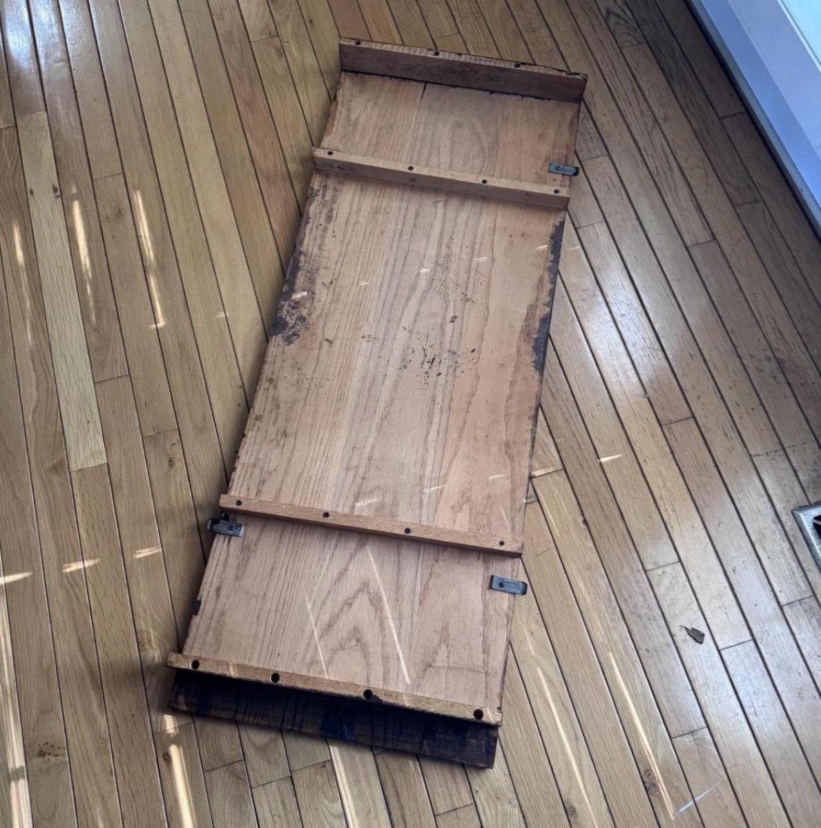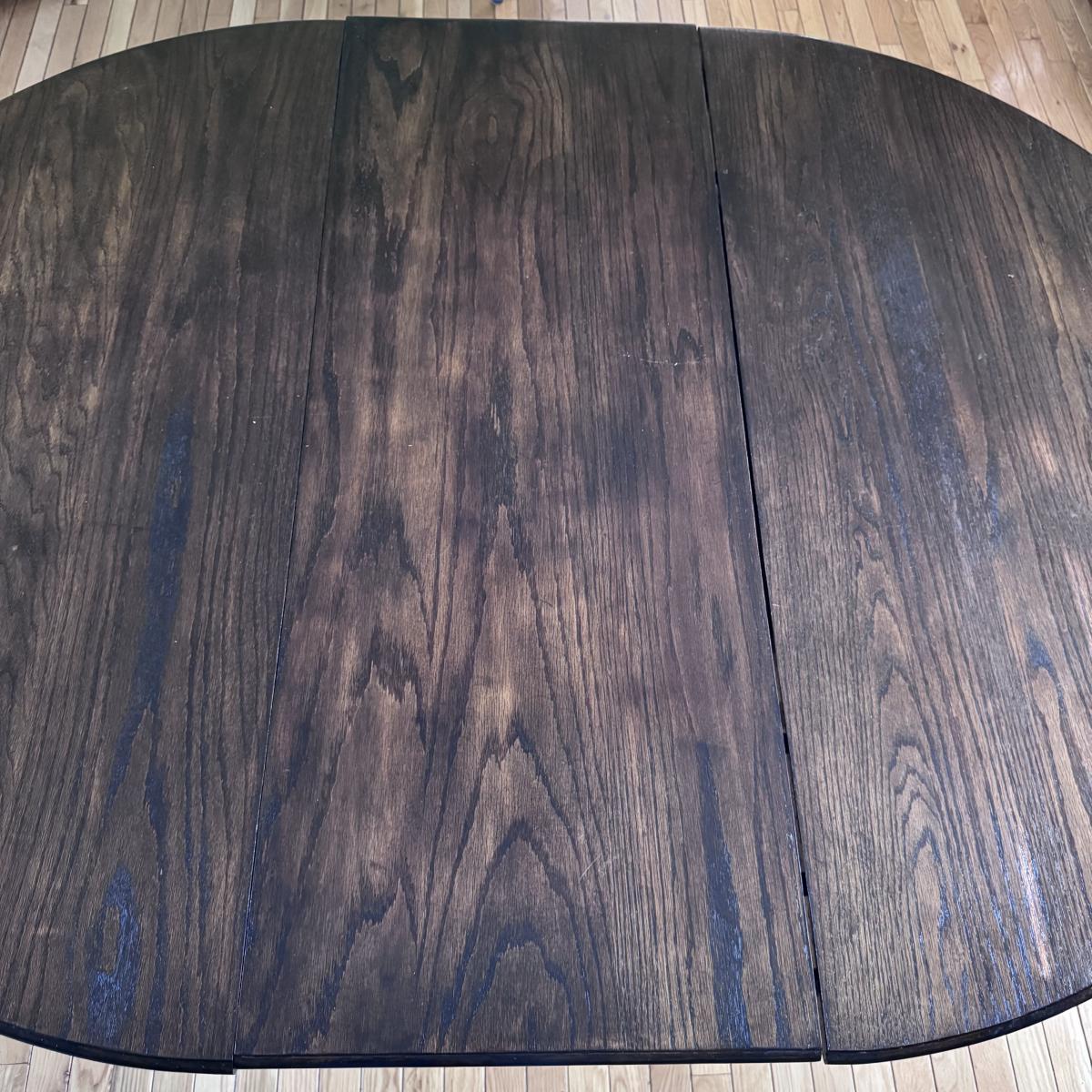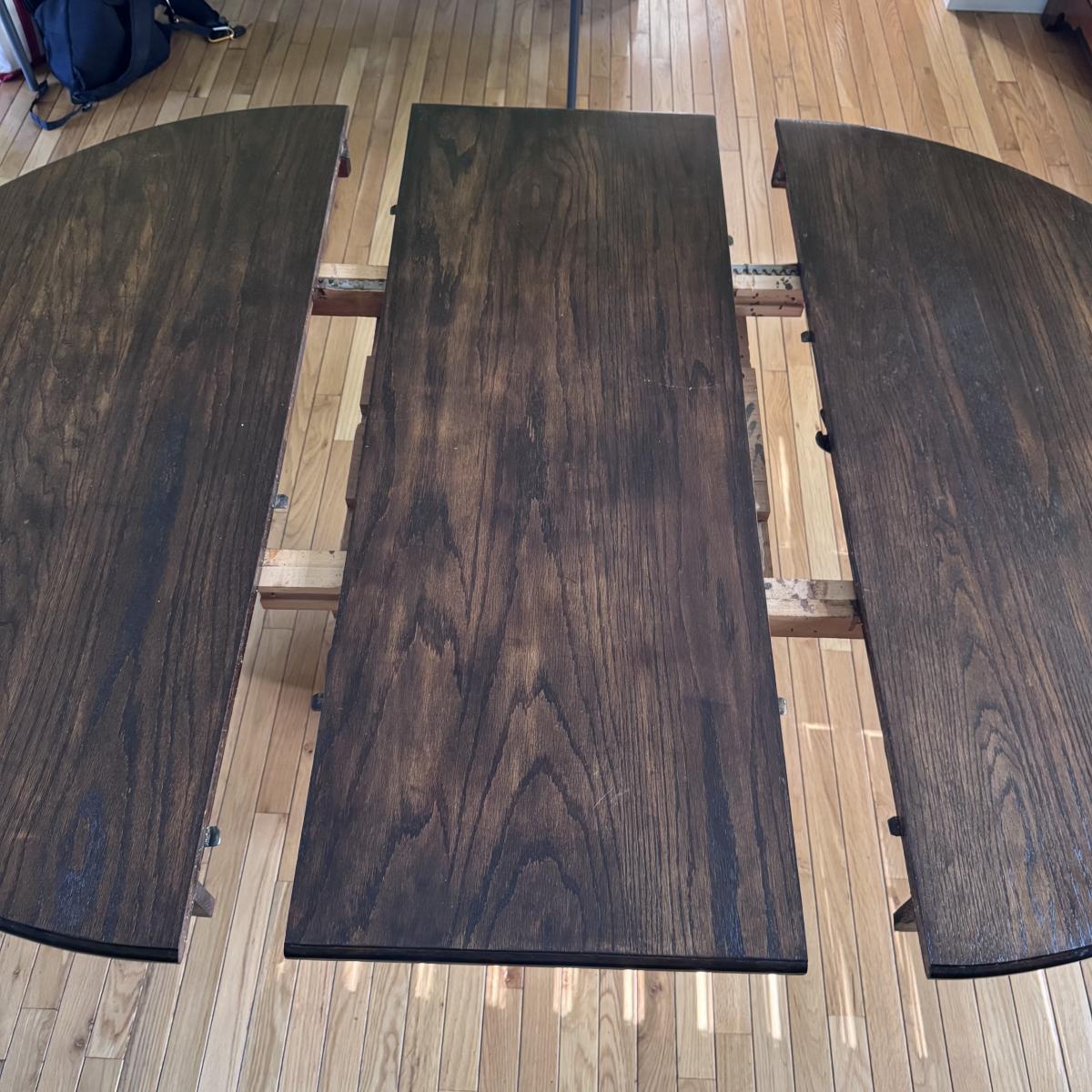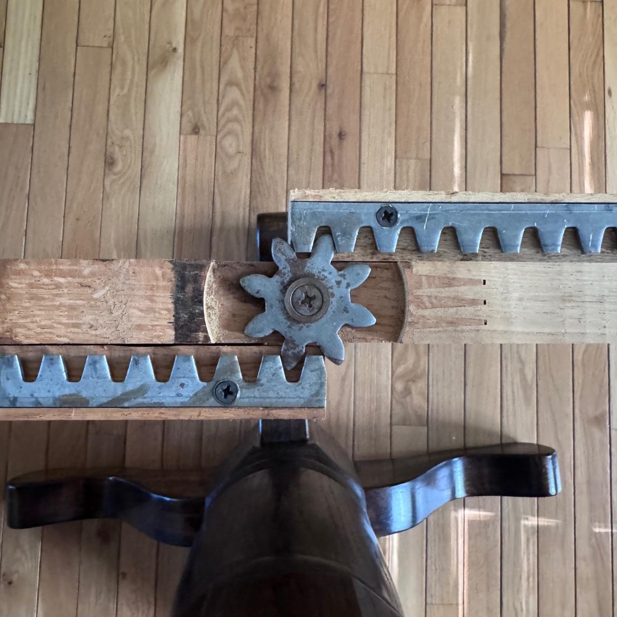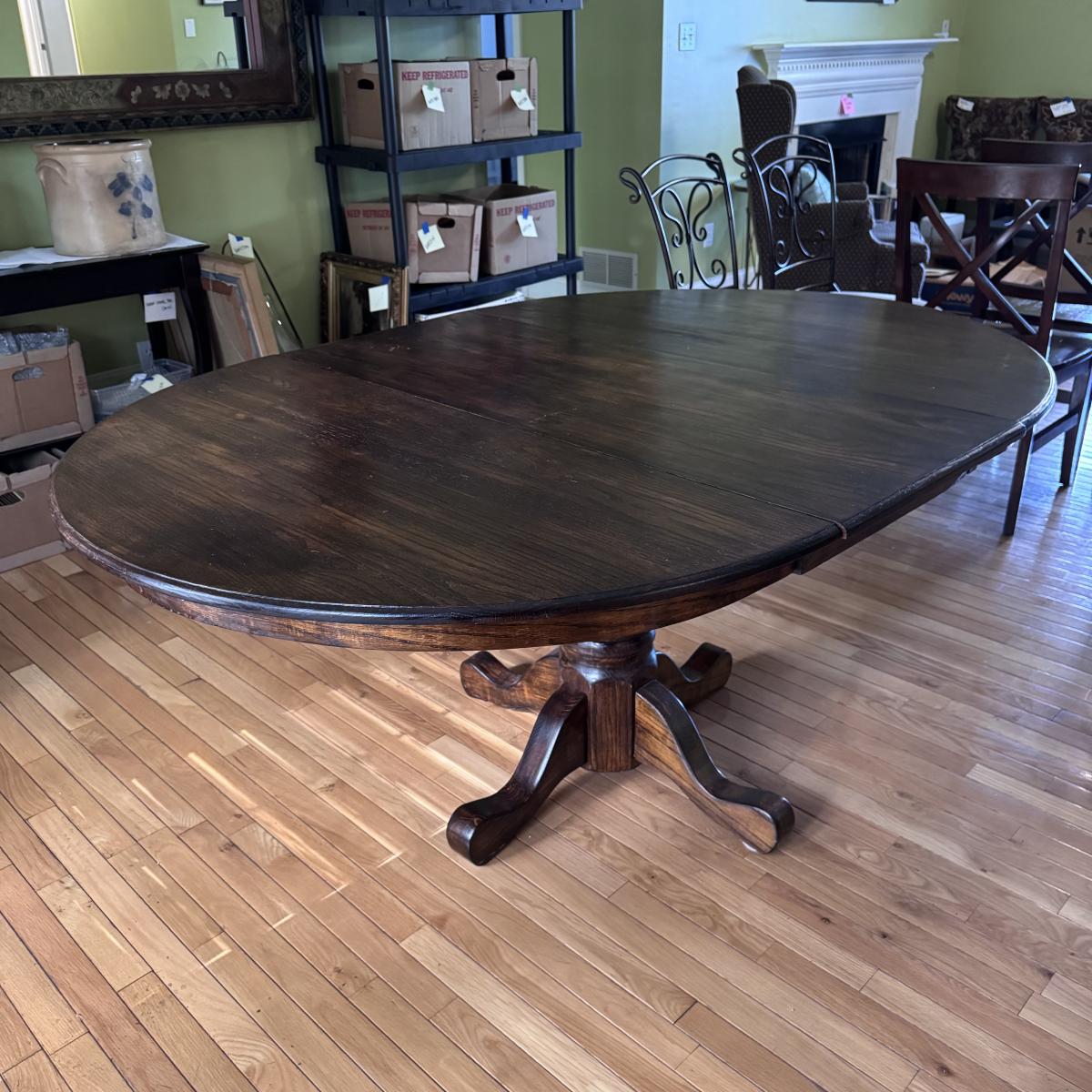 Lot includes one very sturdy wooden table with a removable leaf. The table features a gear and toothed metal tracks set into a wooden frame, allowing it to expand easily. The table measures 65” x 38” x 30”H. Without the leaf it measures 47” x 38” x 30”H. This item is located on the ground floor with two steps down from the porch. Local pickup only. Winning bidder must bring assistance to help move and load this item due to its weight and/or size.