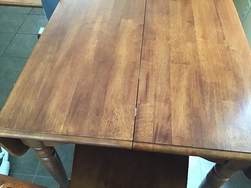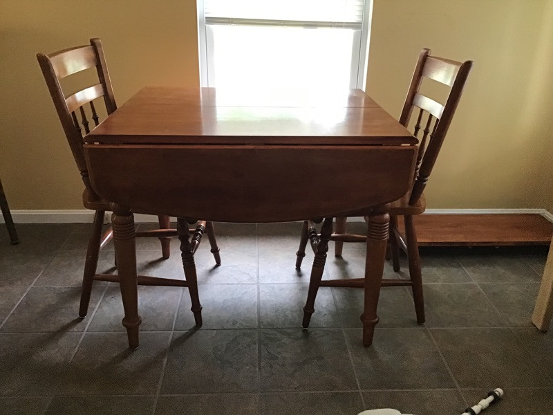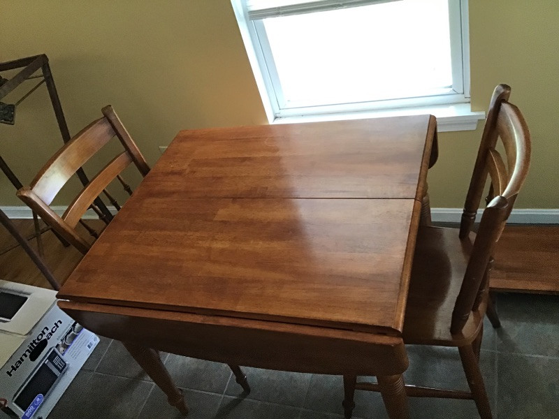 Beautiful in great condition-Solid wood table with two chairs. 30 inch wide without flaps and insert. 62 inches total with flaps and insert leaf.