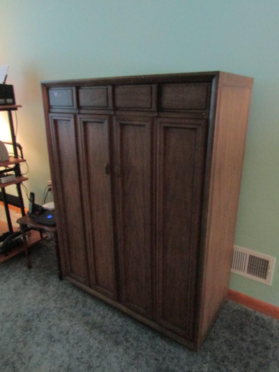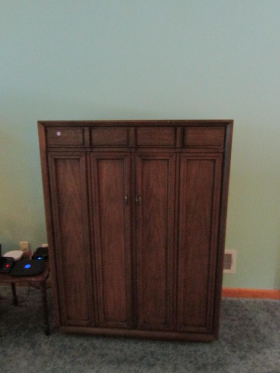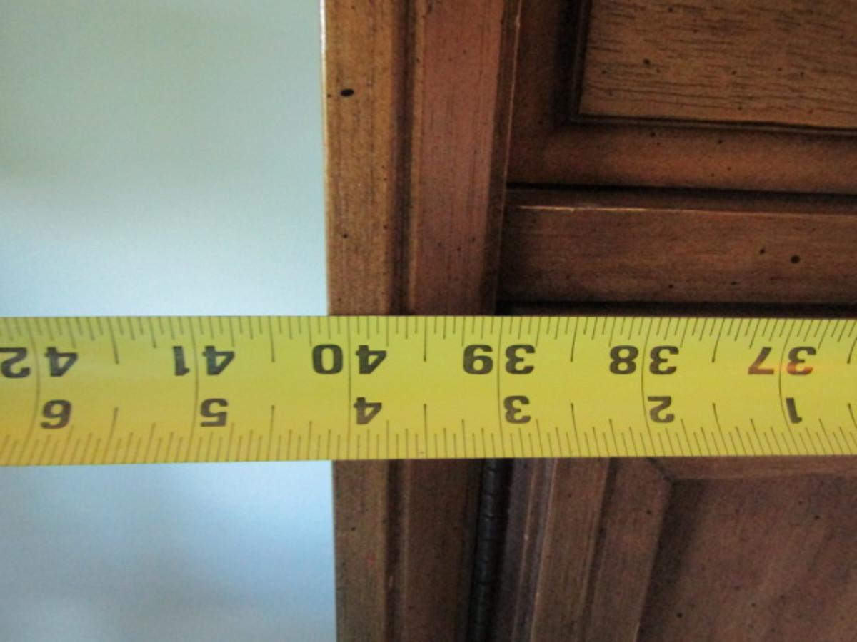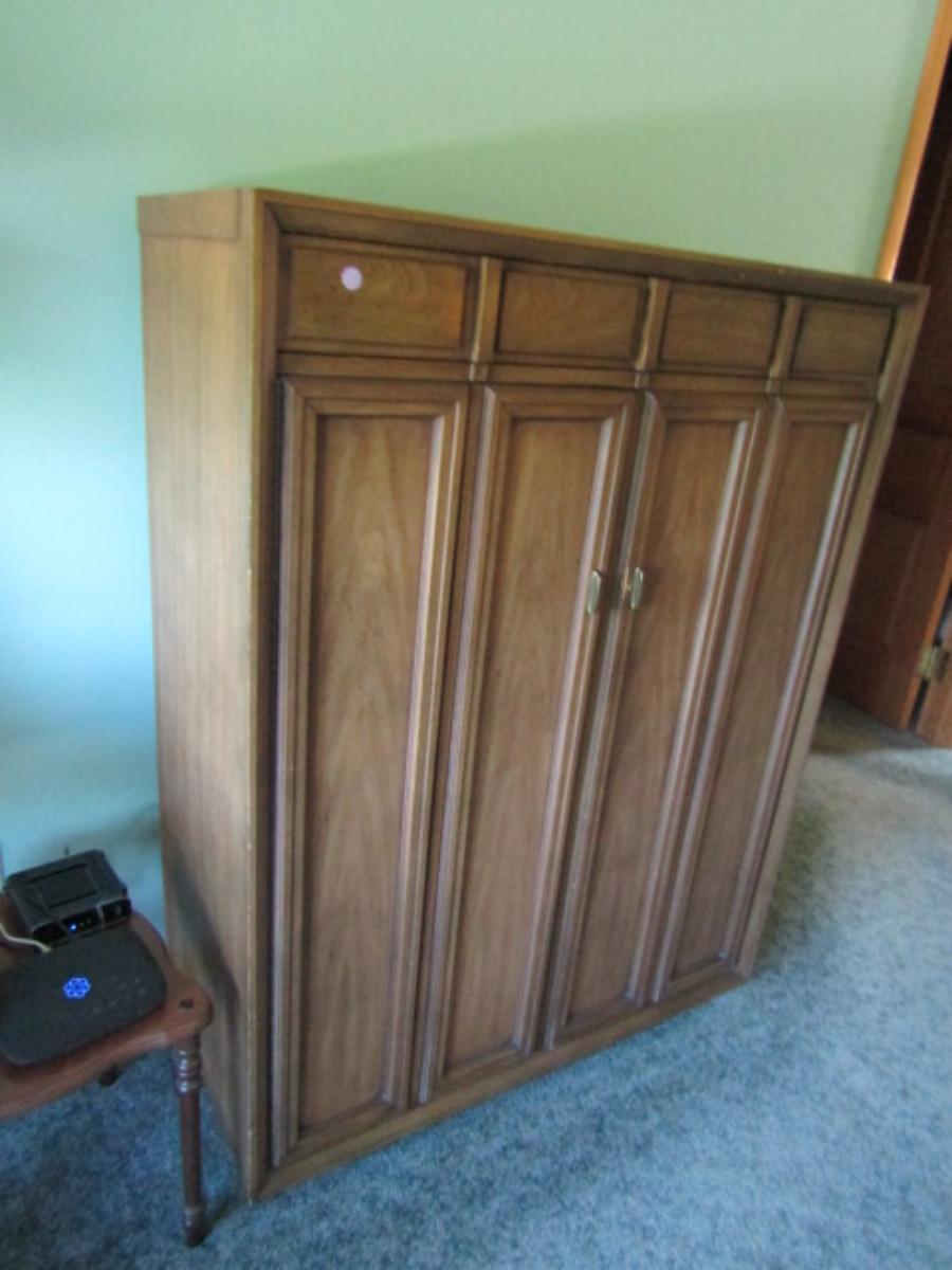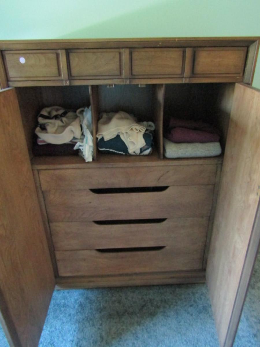 Solid Wood Tall Dresser- Approx 40" x 19" x 53 3/4" Tall. Full width top drawer with internal cubbies and drawers behind double doors.