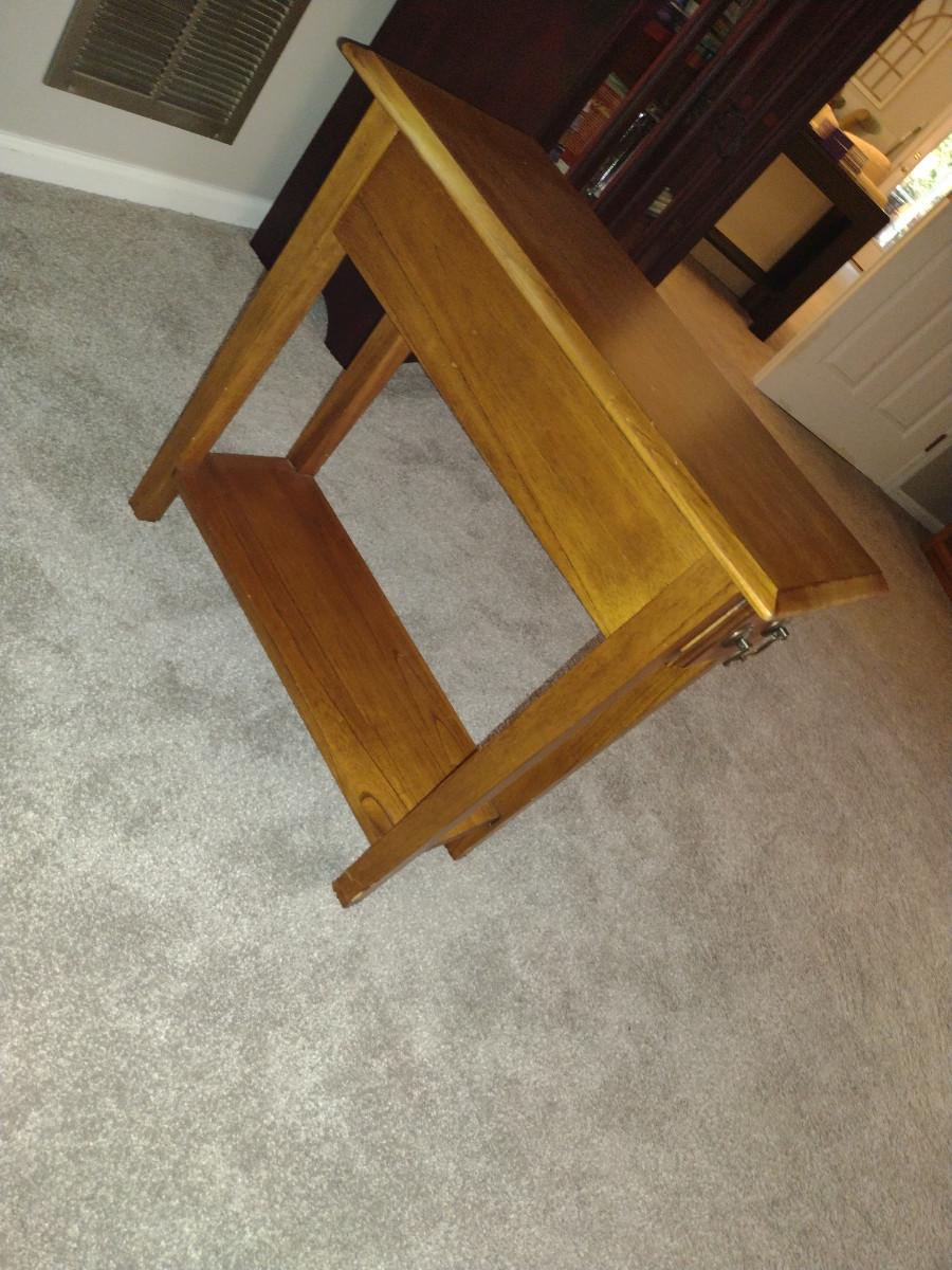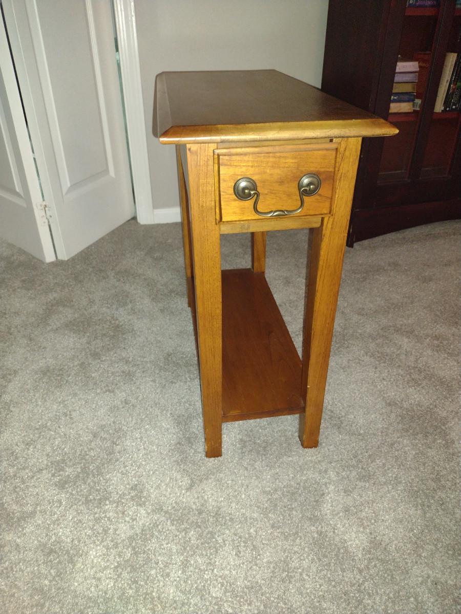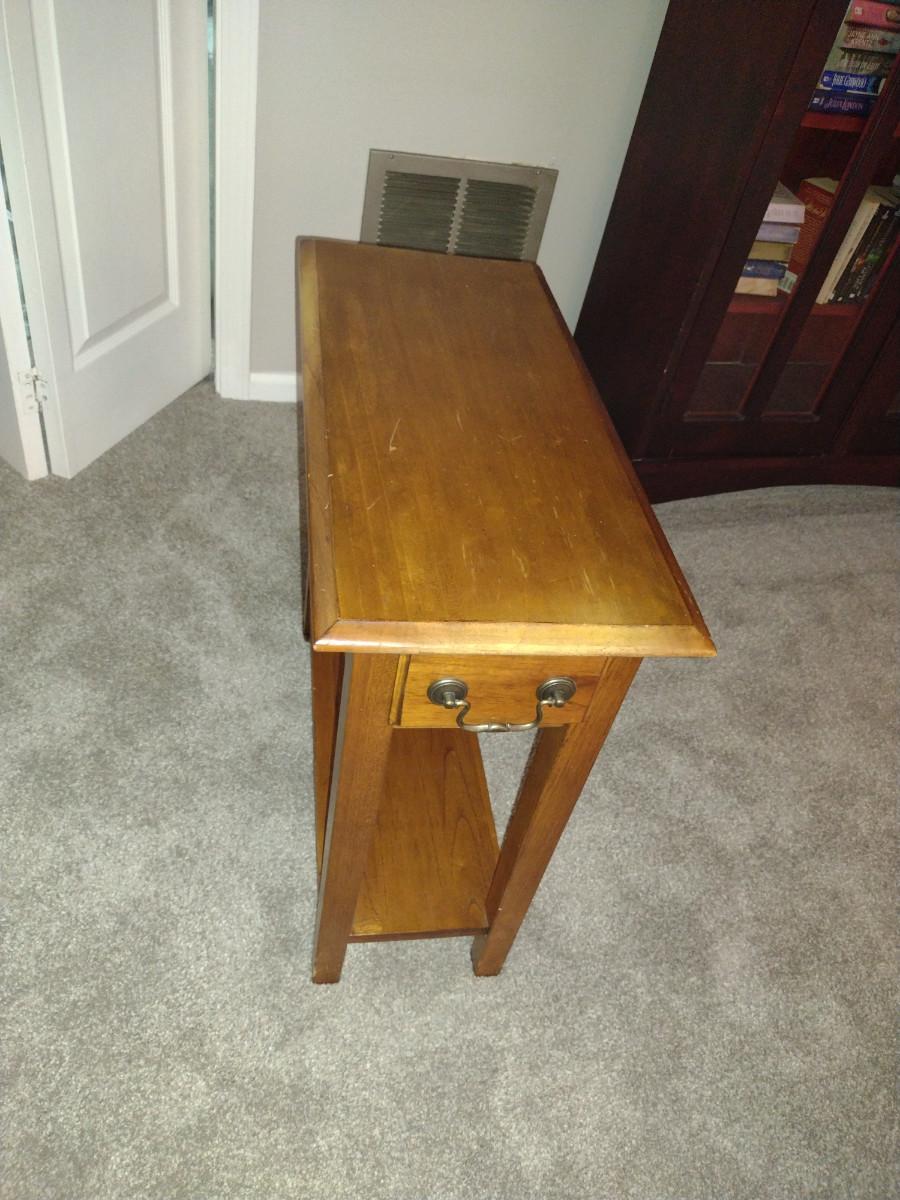 Solid Wood Thin Side Table with Drawer. Measures approx 25" long, 11" wide, 24" tall. Item needs to be tightened.
