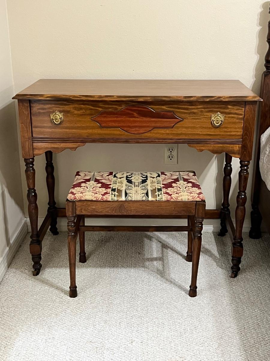 Includes Bed headboard 46” H ~ Chest 41.5” H x 30.5” W x 18” D ~ Vanity 31” W x 38” W x 18” D ~ Stool 17” H x 21” W x 13” D ~ CERTPUR US full size mattress included & a boxspring