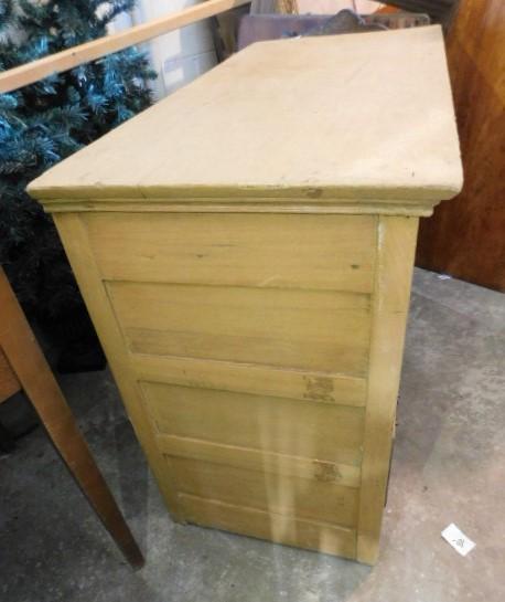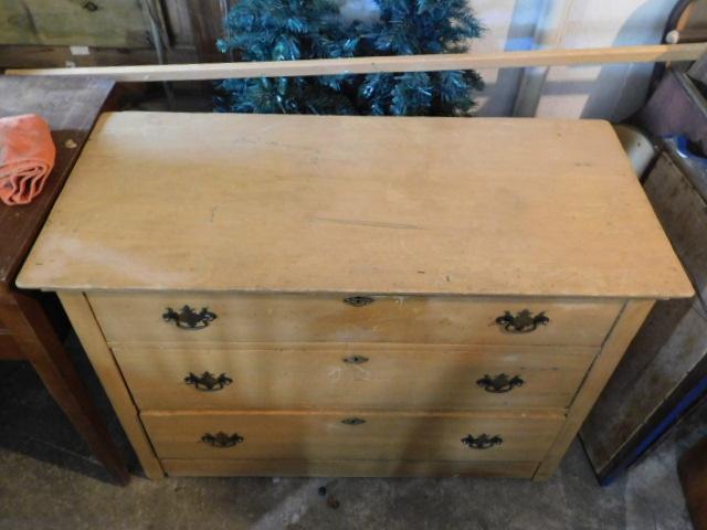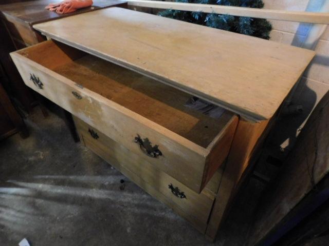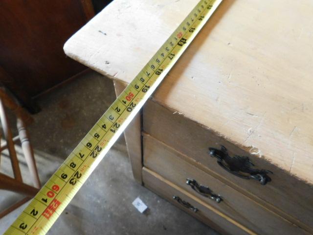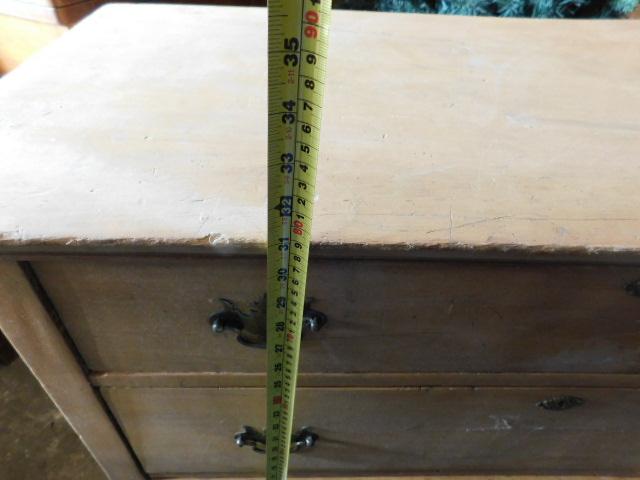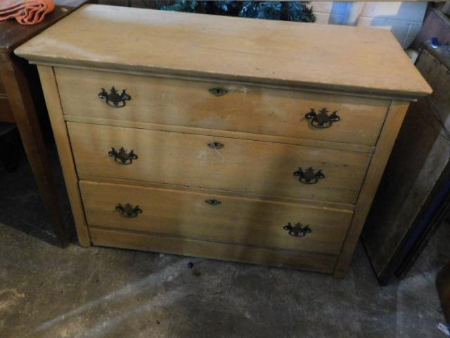 Solid Wood Three Drawer Dresser 39"x19"x31" is very appealing and has great appearance. has wear, scratches, nicks. Great project piece