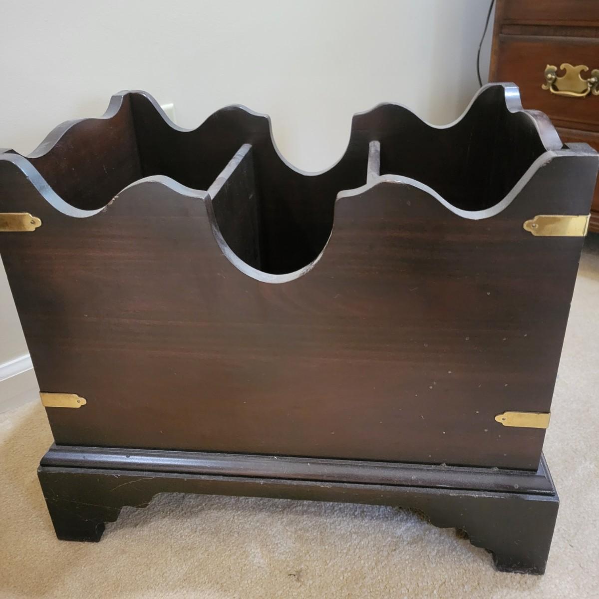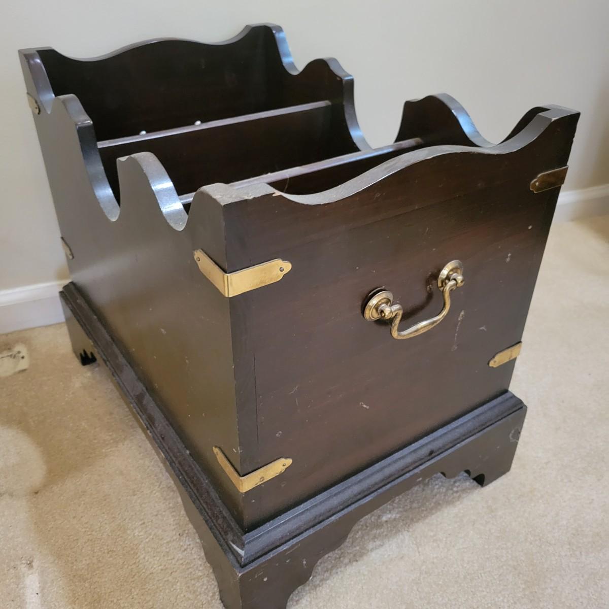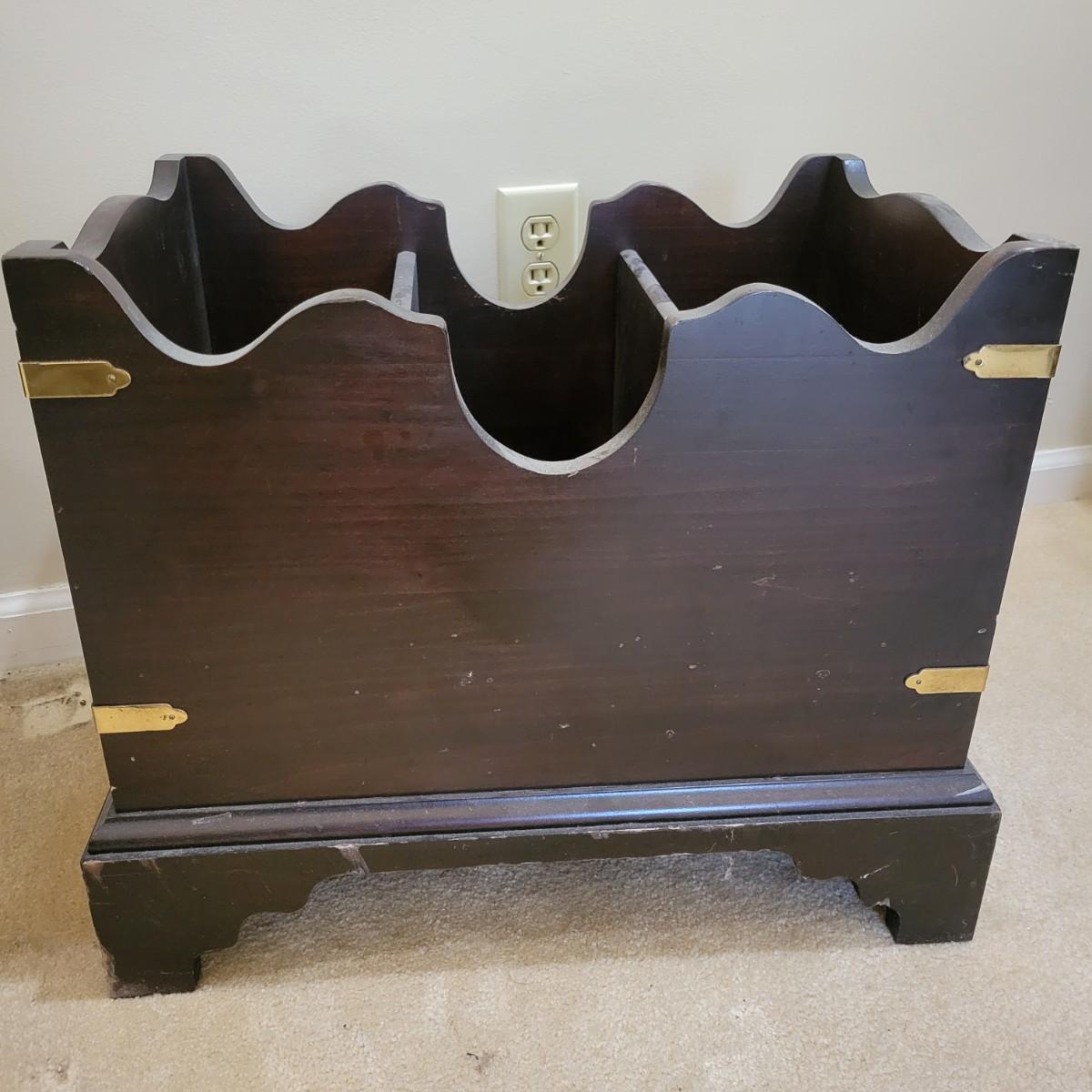 A solid wood magazine rack in good condition with some minor scratches and blemishes. This magazine rack features three divided slots for storage, brass hardware and accents, and a rich dark mahogany stain. Measures approximately 12.5" x 18.5" x 16". Local pickup only
