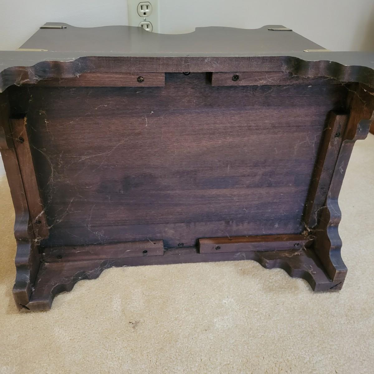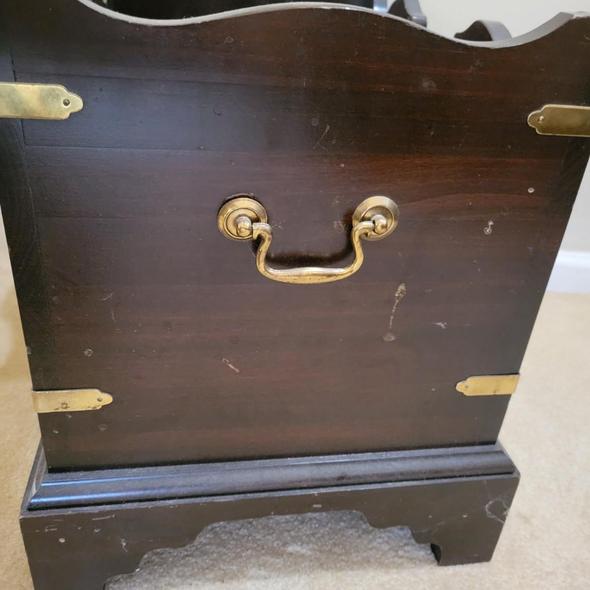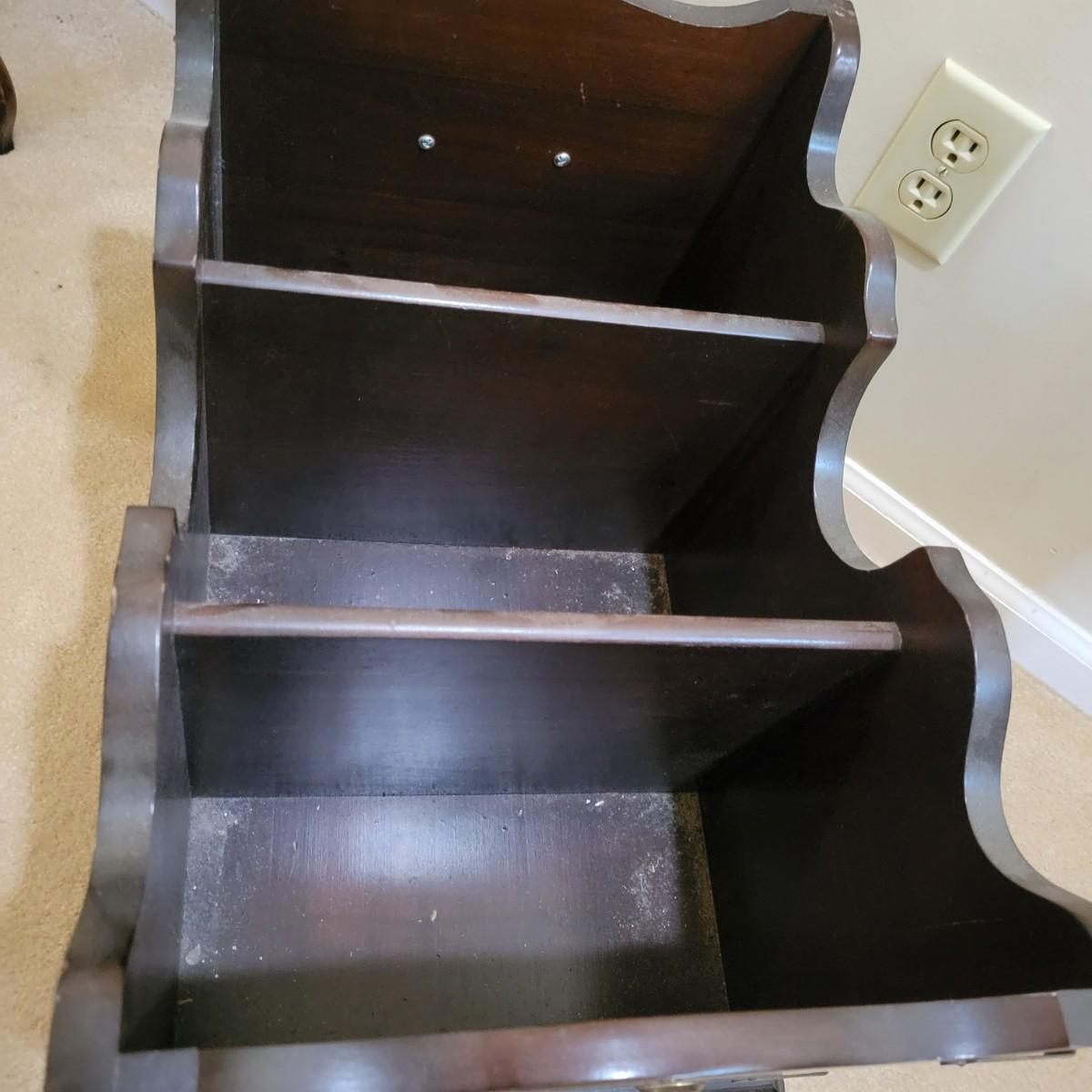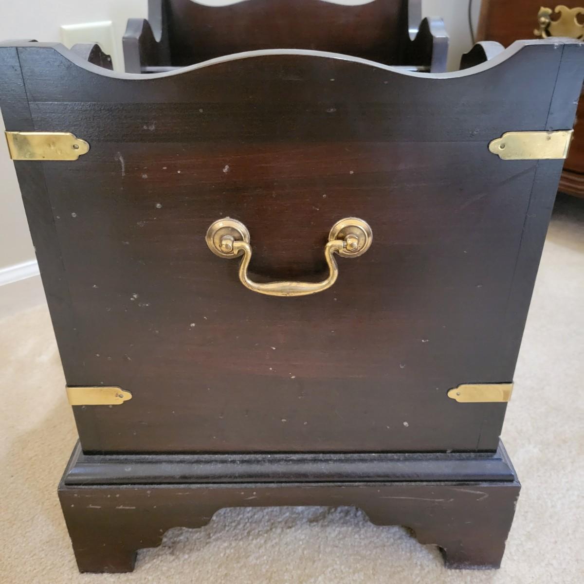 A solid wood magazine rack in good condition with some minor scratches and blemishes. This magazine rack features three divided slots for storage, brass hardware and accents, and a rich dark mahogany stain. Measures approximately 12.5" x 18.5" x 16". Local pickup only