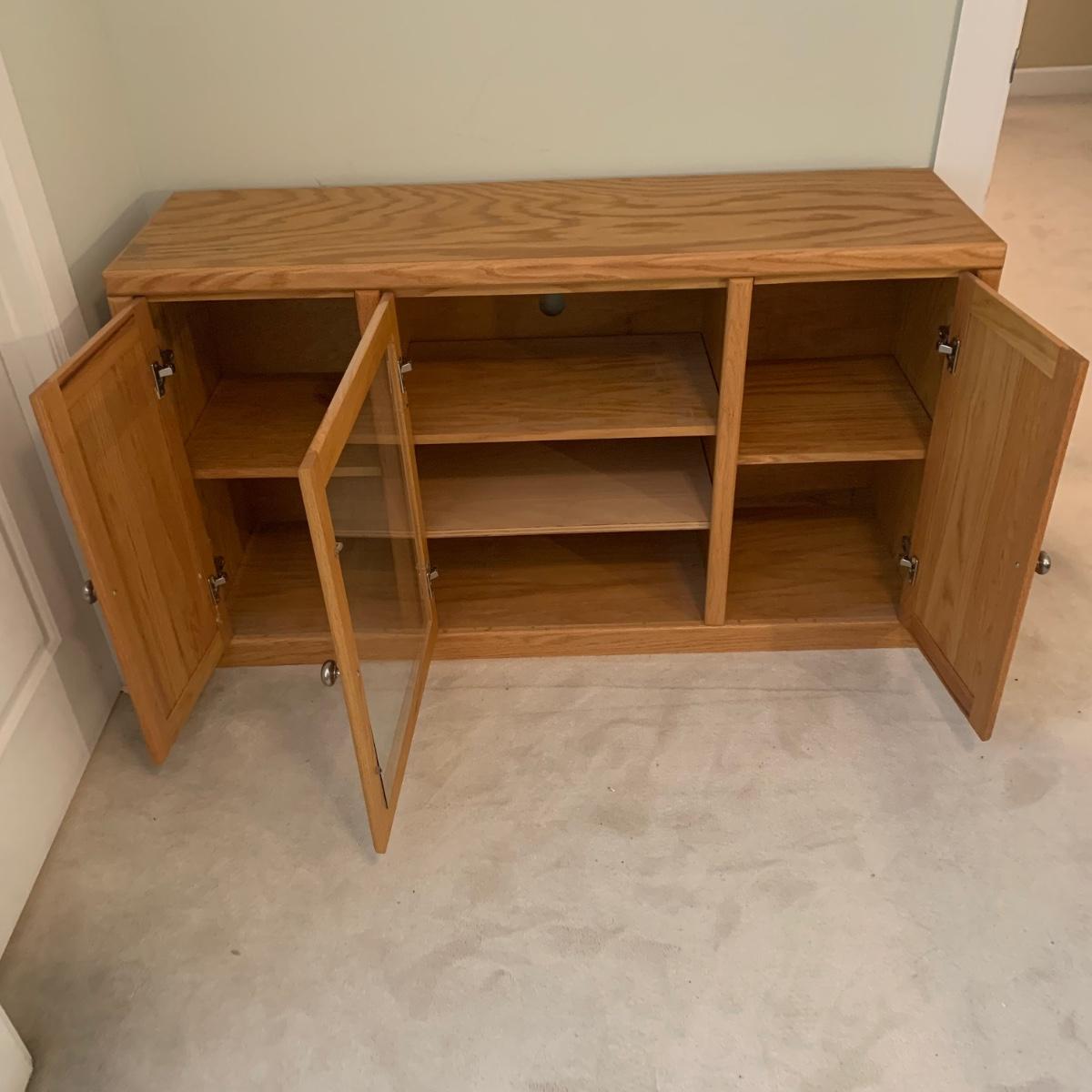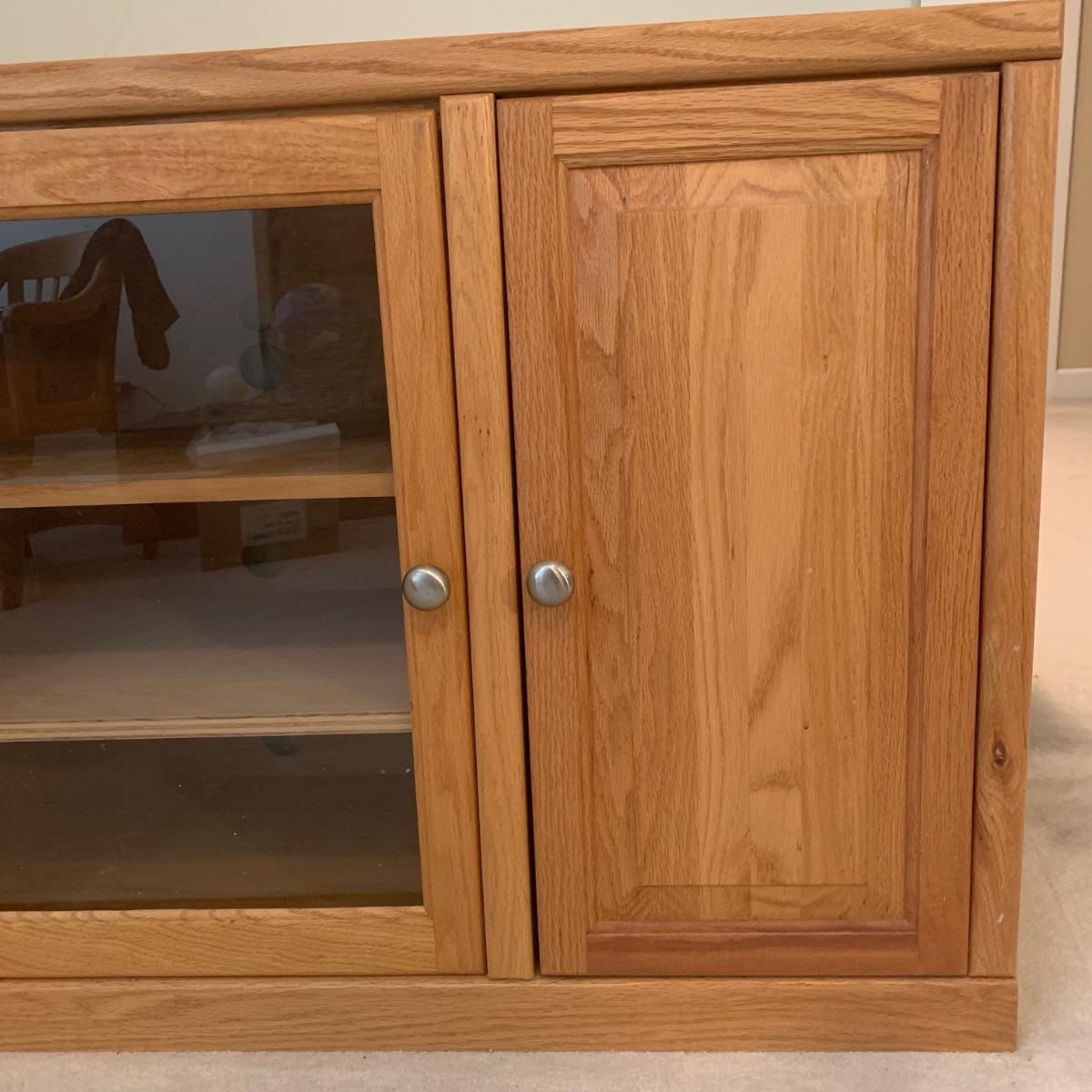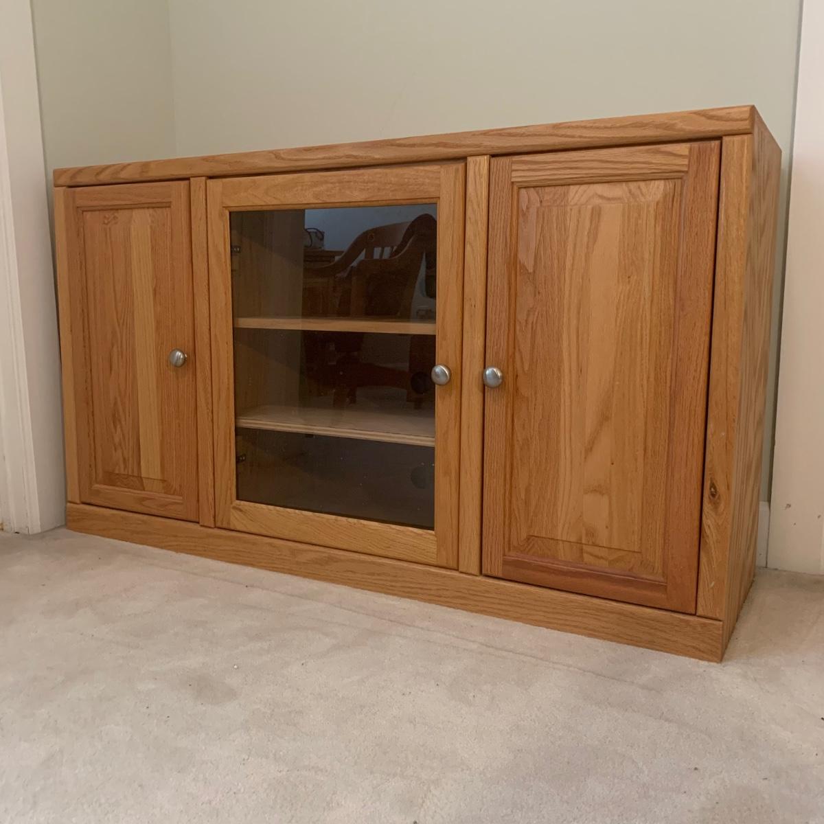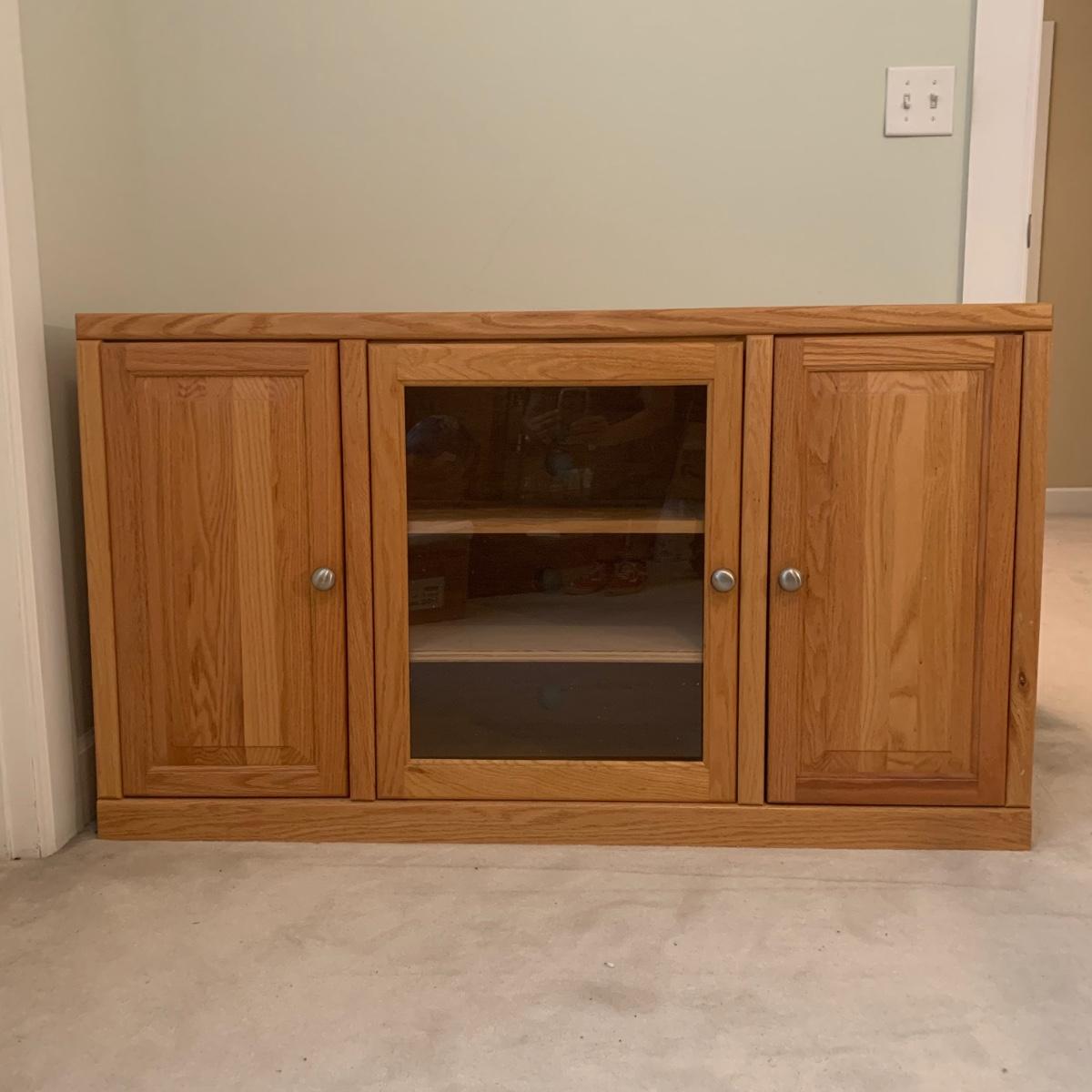 Solid wood TV stand with three cabinets; one of which is glass. This piece is made of solid wood and has brushed chrome knobs. TV stand measures, 54”L x 16.5”W x 31”H. There are intentionally drilled holes for electronics. This cabinet has a few blemishes and some of the hardware needs to be tightened. Overall it appears to be in good condition. There are no markings on the rear of piece. Please see photos for more details.