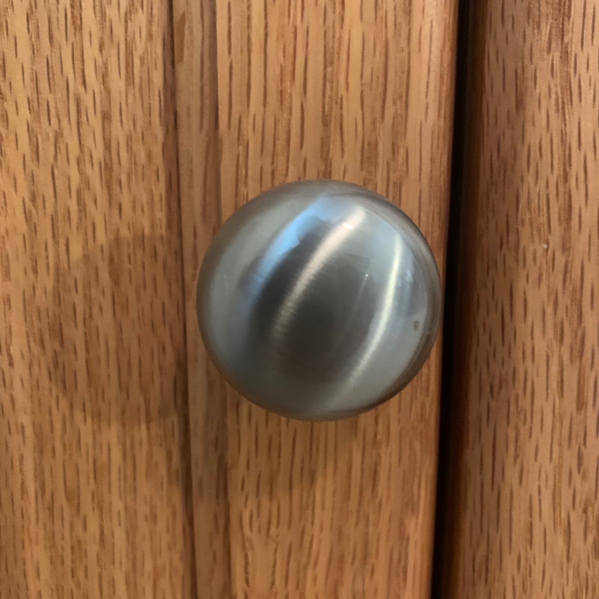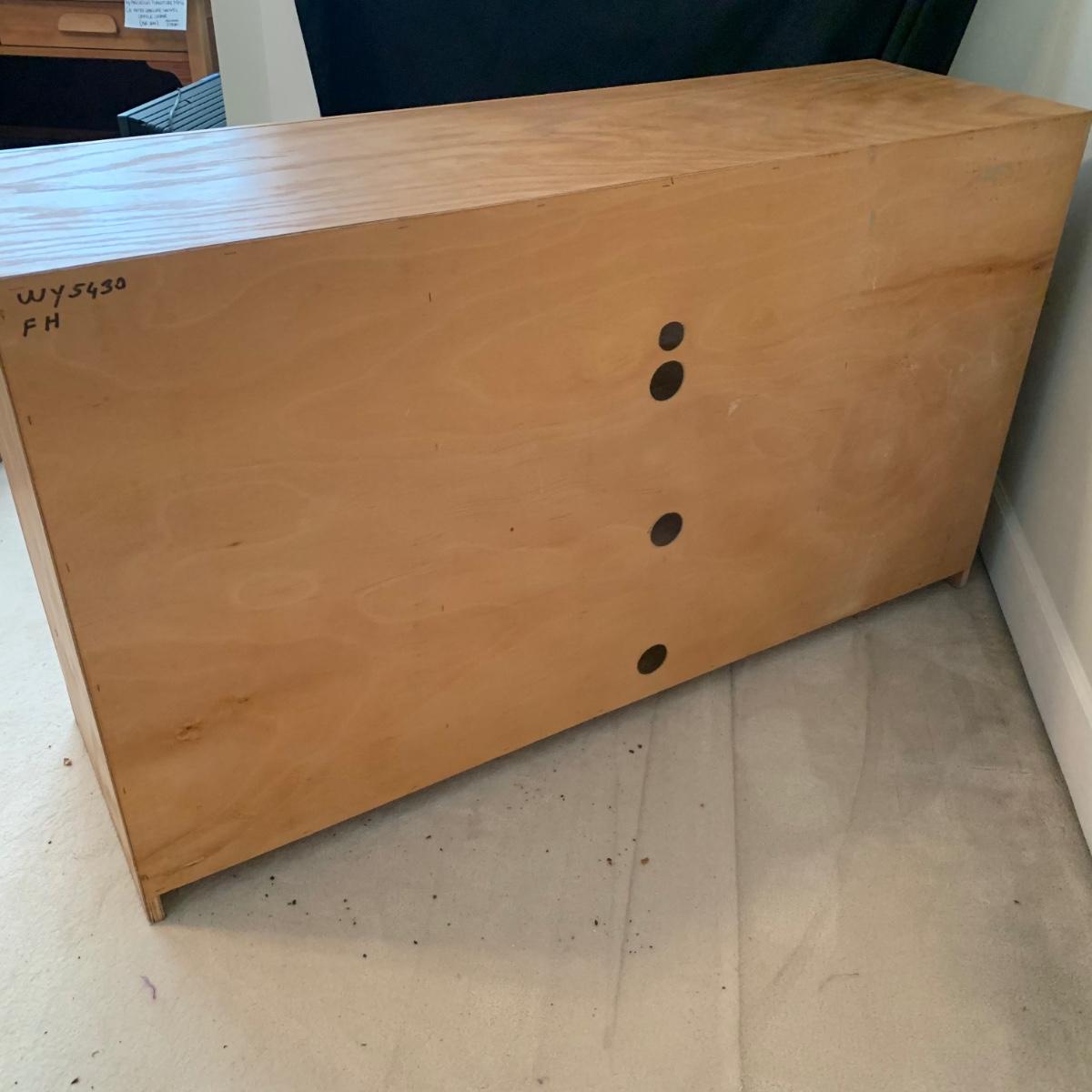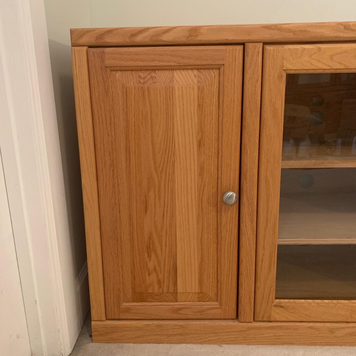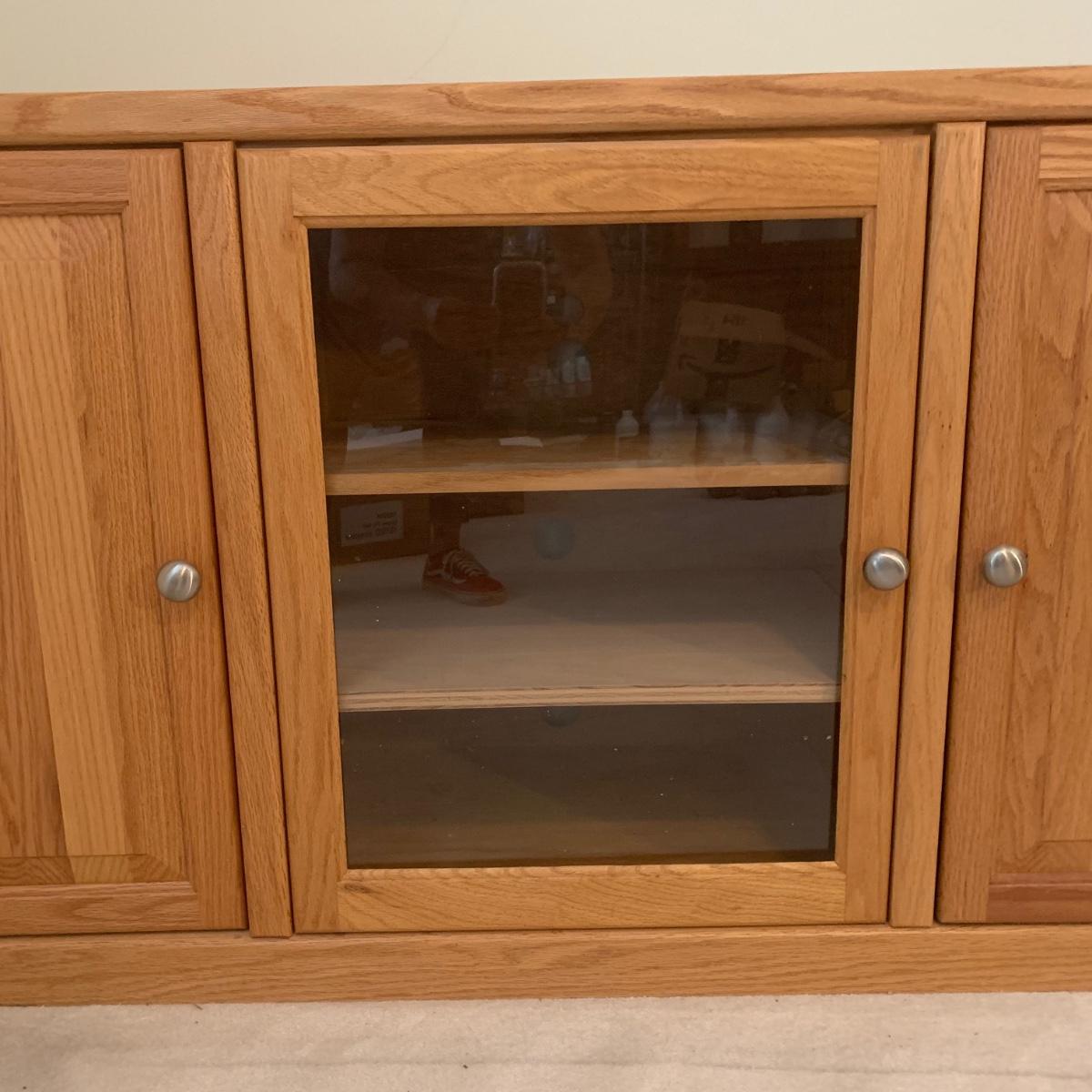 Solid wood TV stand with three cabinets; one of which is glass. This piece is made of solid wood and has brushed chrome knobs. TV stand measures, 54”L x 16.5”W x 31”H. There are intentionally drilled holes for electronics. This cabinet has a few blemishes and some of the hardware needs to be tightened. Overall it appears to be in good condition. There are no markings on the rear of piece. Please see photos for more details.