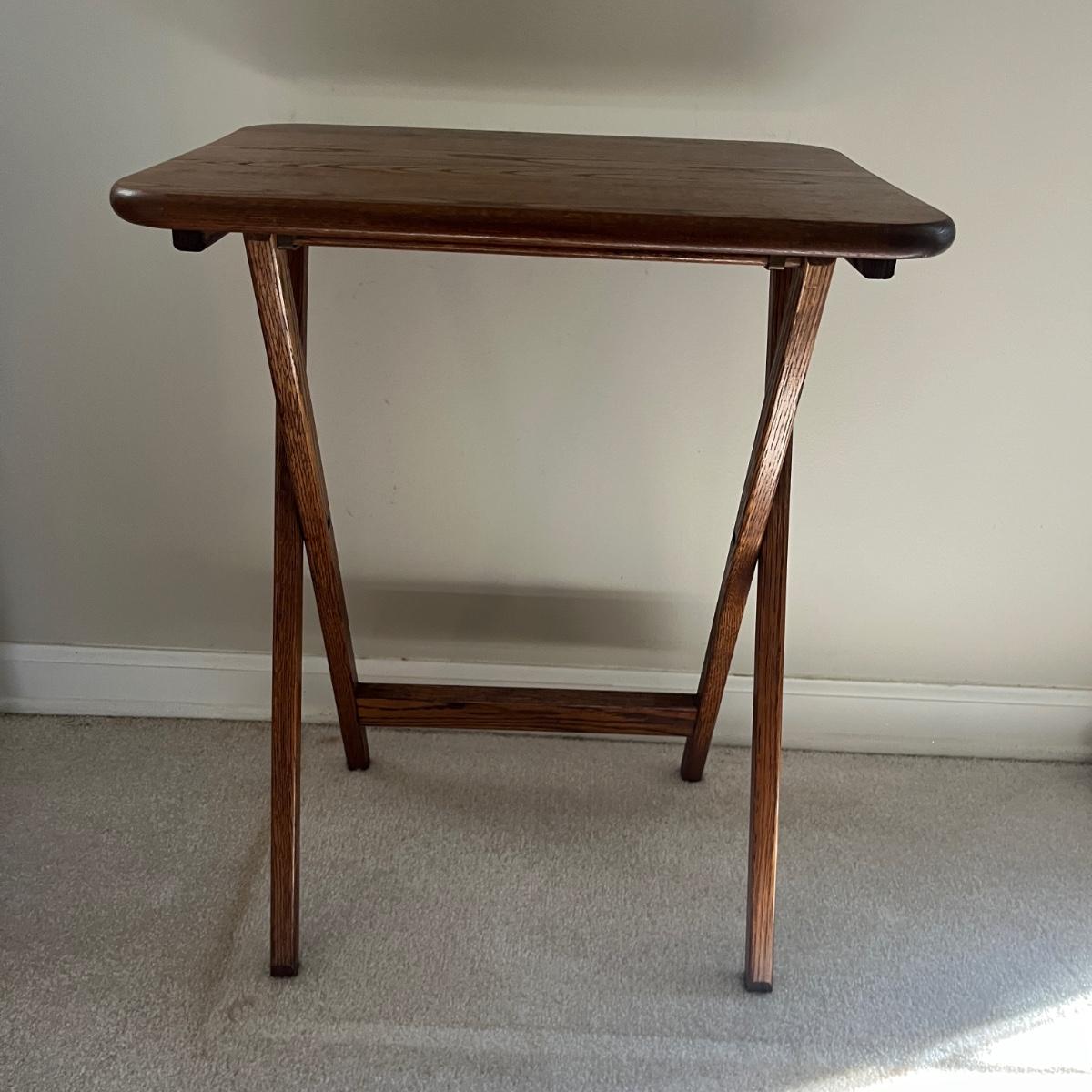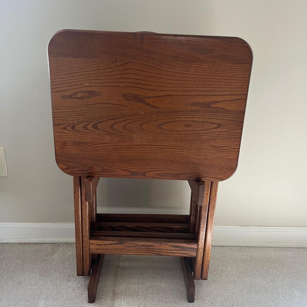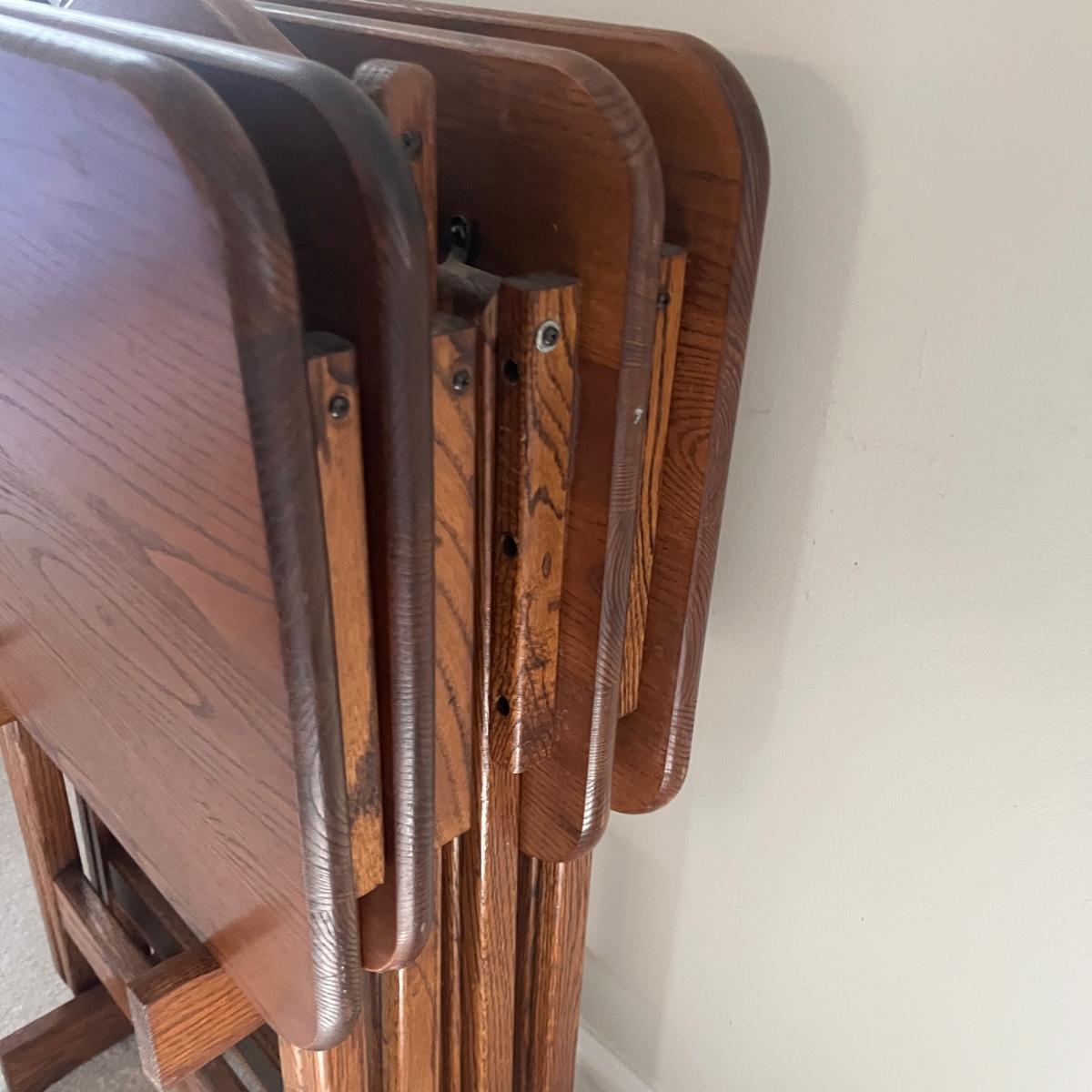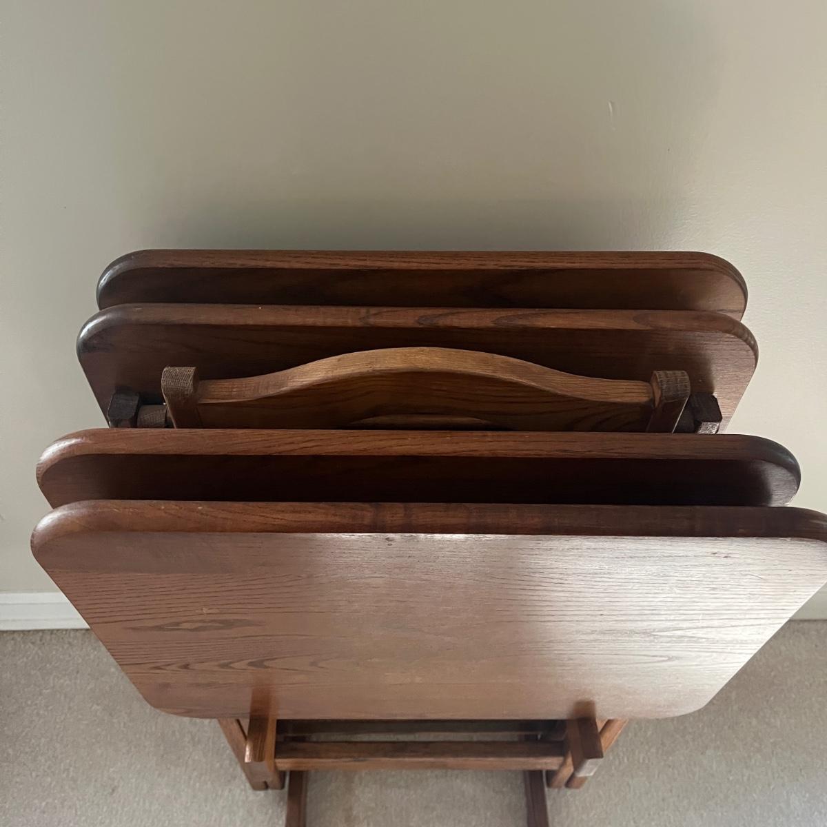 Lot includes four solid wood TV trays with wooden carrying stand. TV trays each measure 19” x 14.5” x 24”H when open. Trays have some scratches and nicks, see pictures.