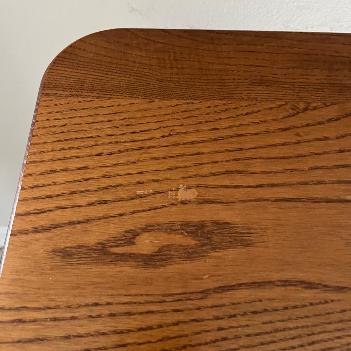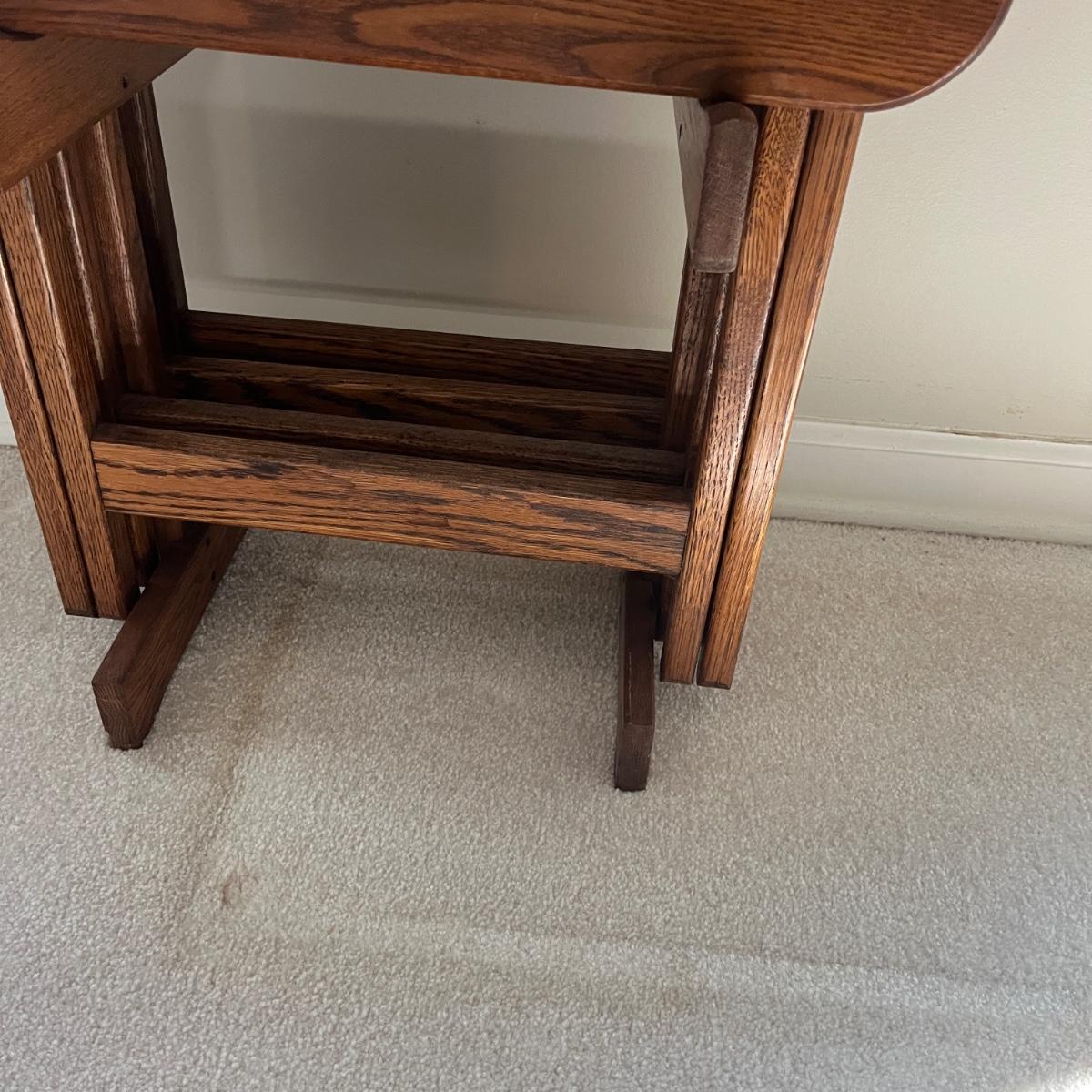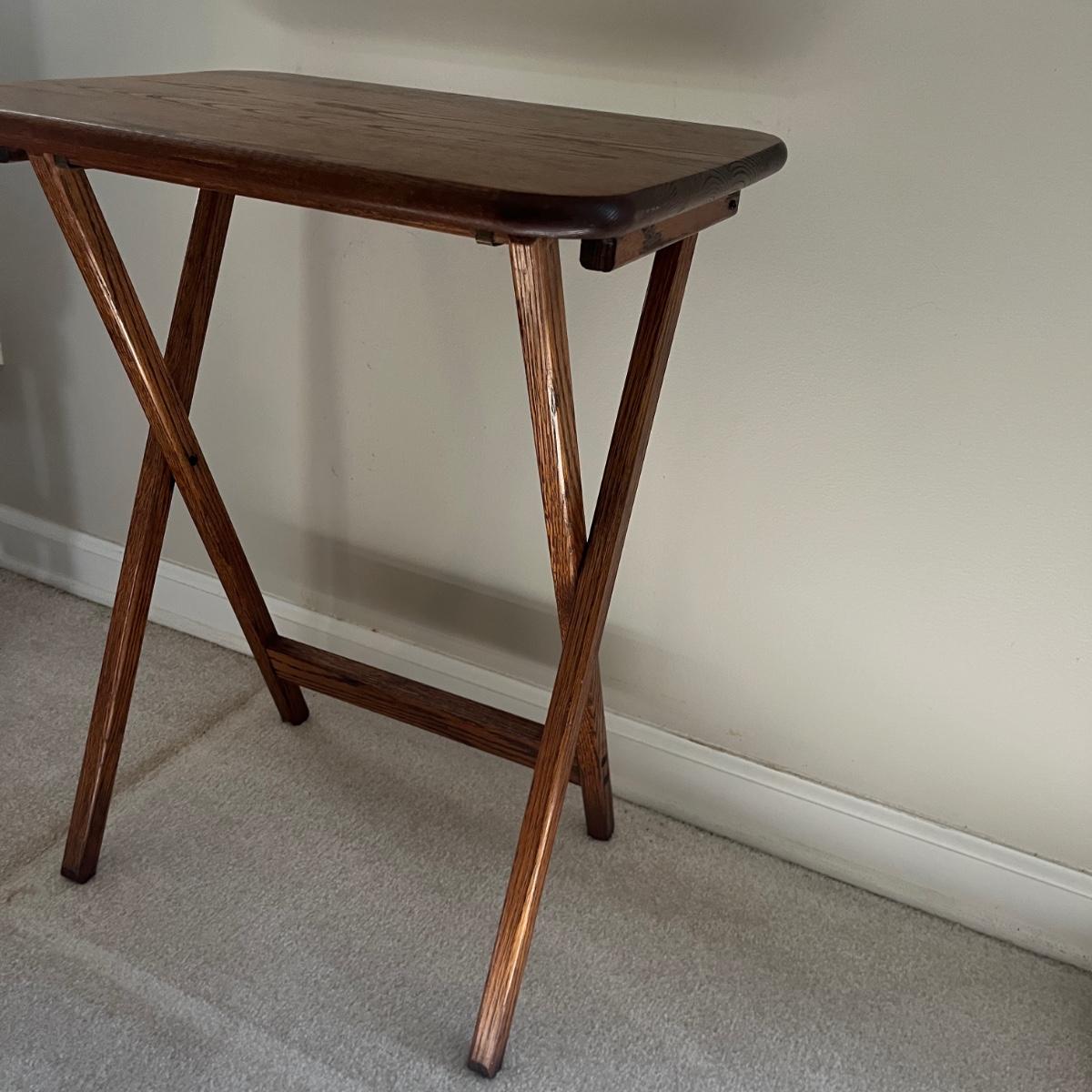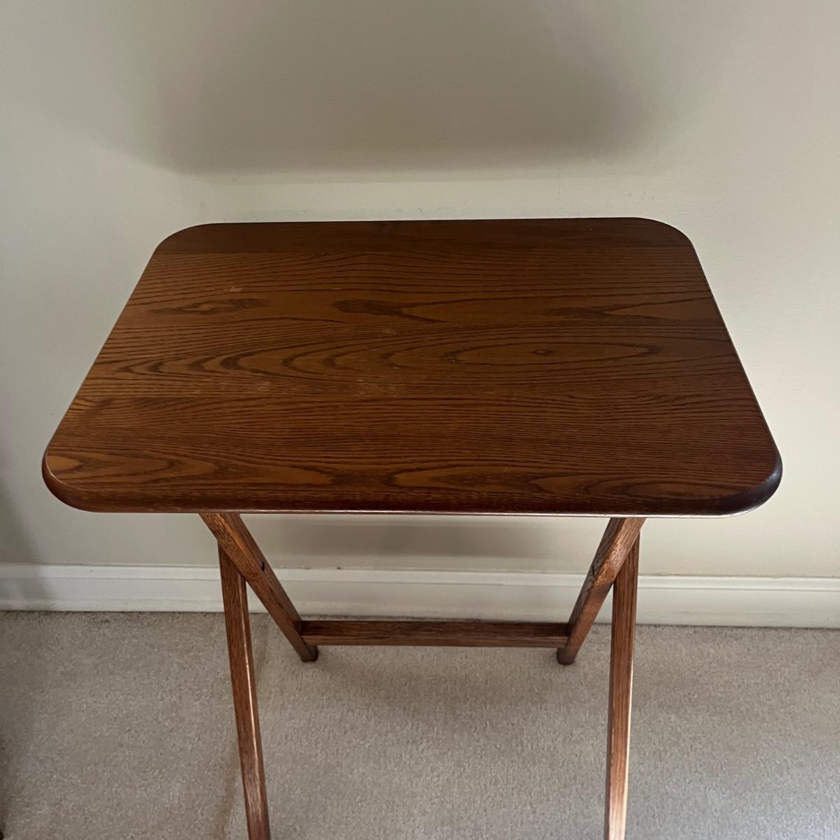 Lot includes four solid wood TV trays with wooden carrying stand. TV trays each measure 19” x 14.5” x 24”H when open. Trays have some scratches and nicks, see pictures.