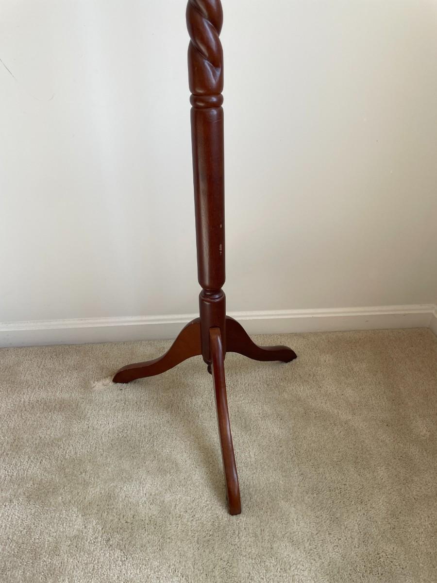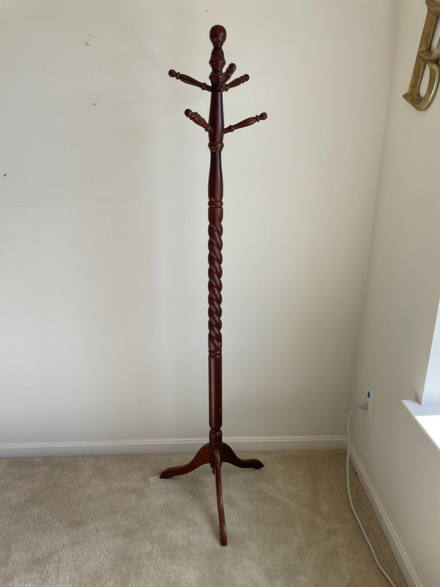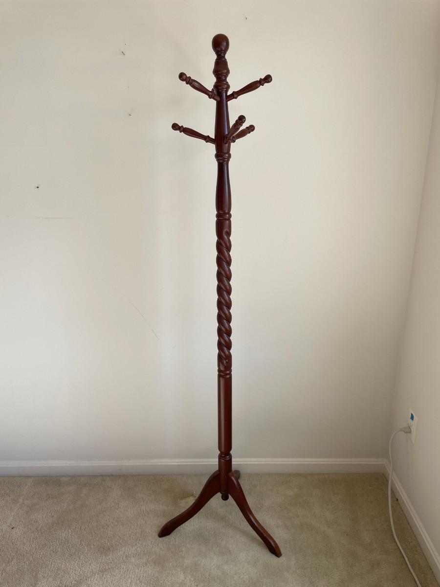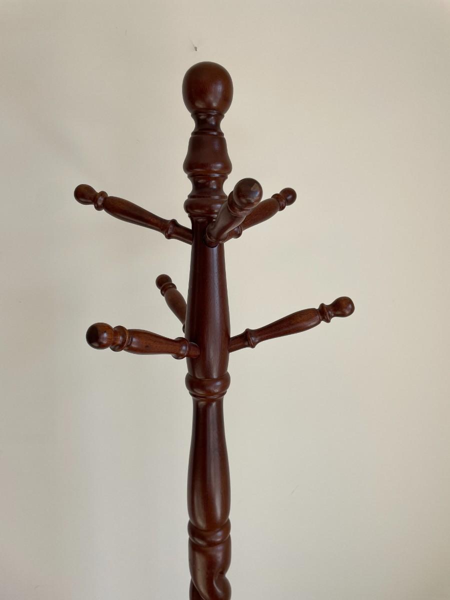 Coat rack has 6 hooks and spin top for easy access. Bottom has a twist design. Beautiful and in great condition. Measures- 71.5"H x 17"W x 17"D.