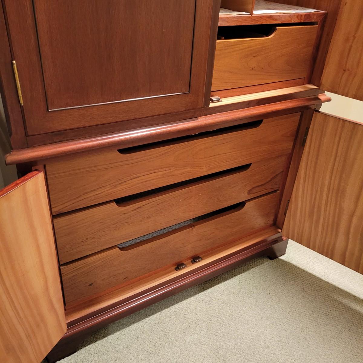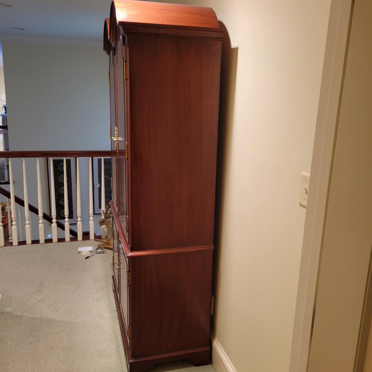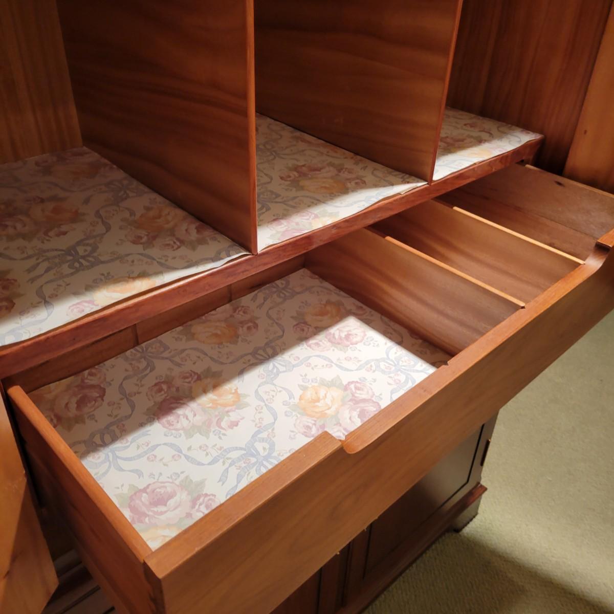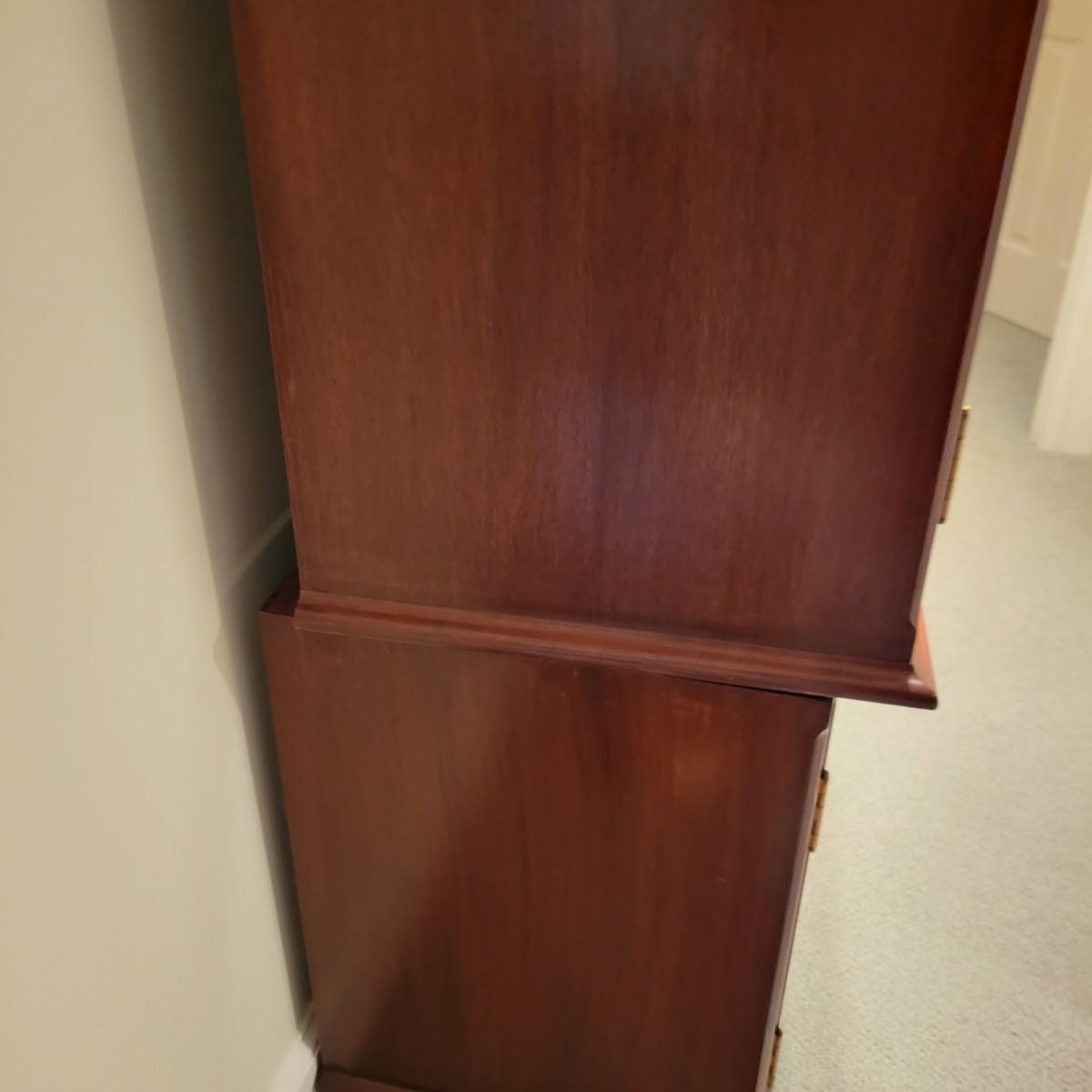 A large, solid wood storage cabinet that separates into two pieces. The top piece features three shelves that have removable dividers and one dovetailed drawer. The bottom has three dovetailed drawers. It measures approximately 42"x 19" x 79.5"H. Local pickup only. Winning bidder must bring assistance to help move and load this item due to its weight and/or size.