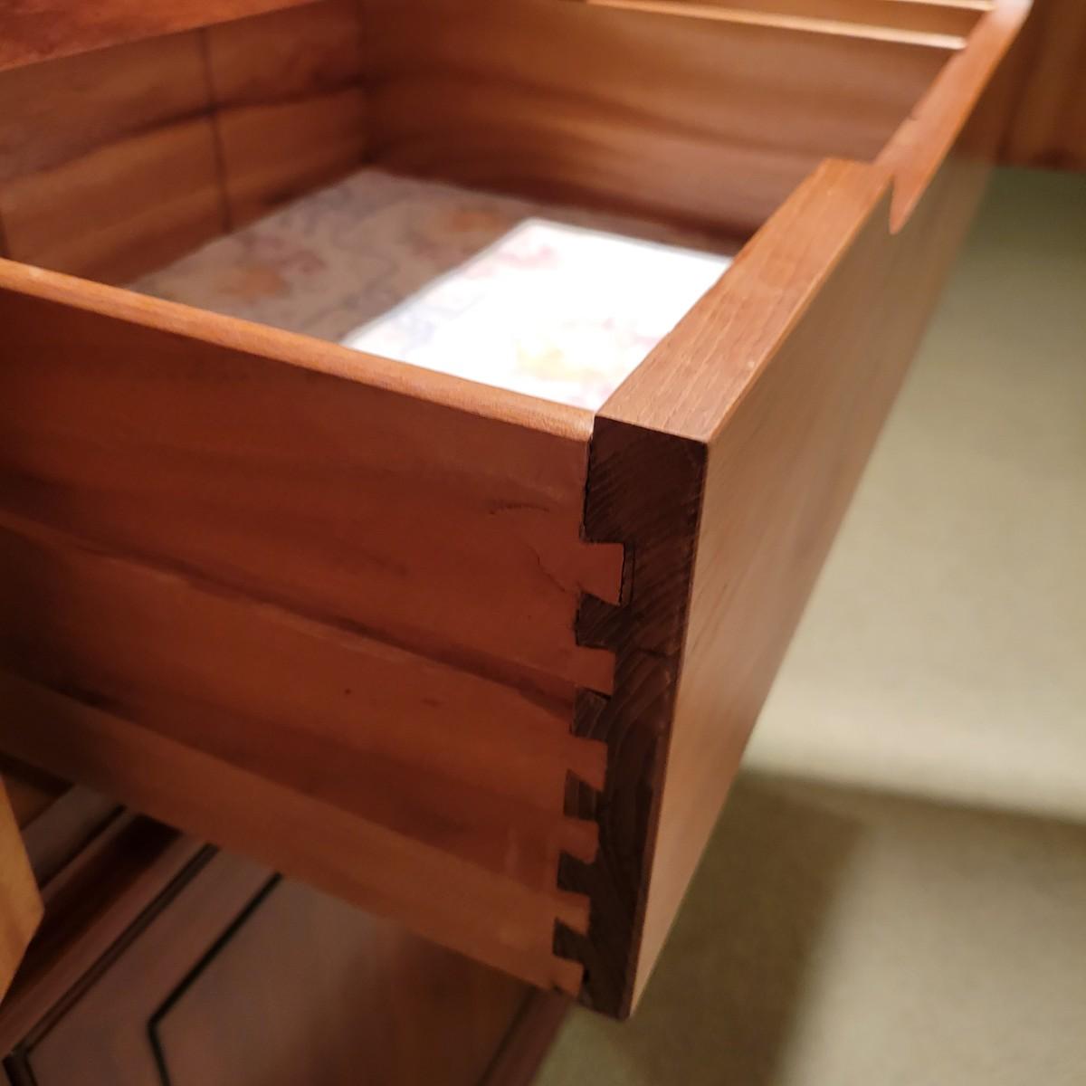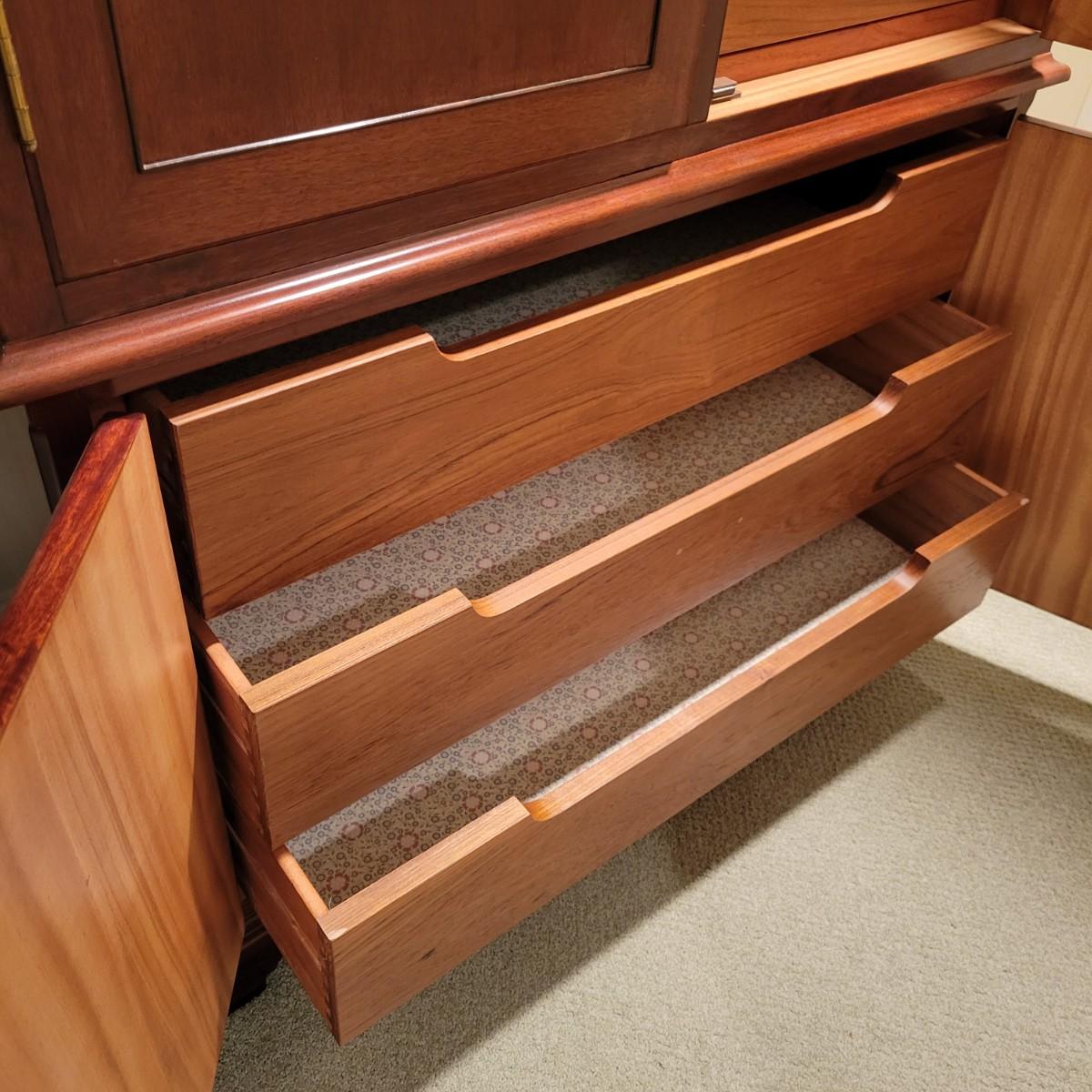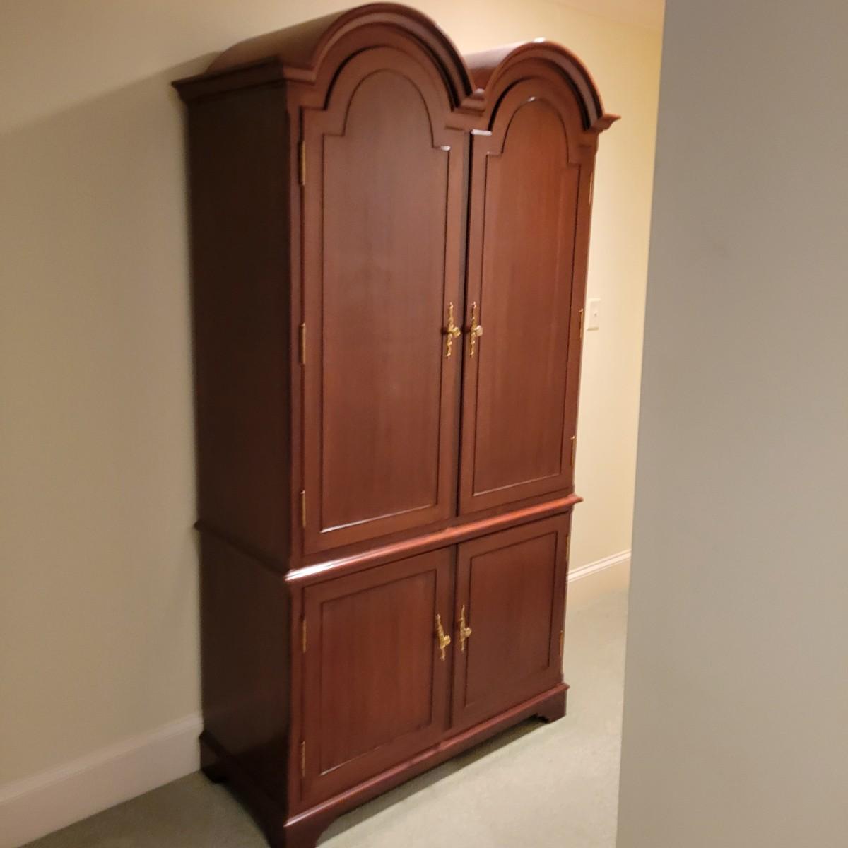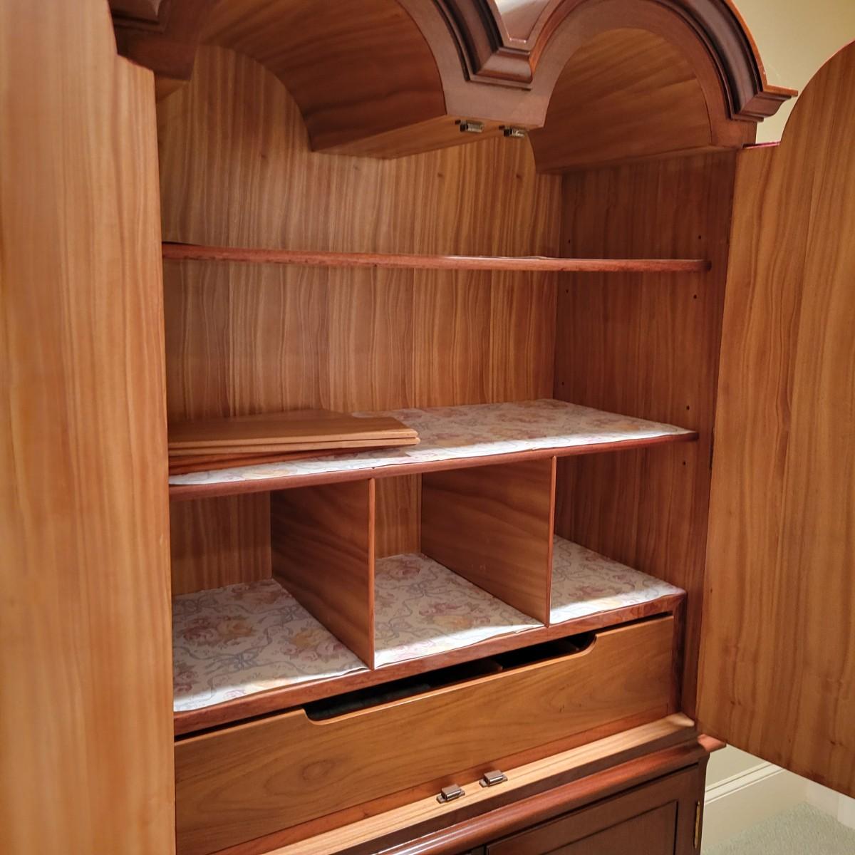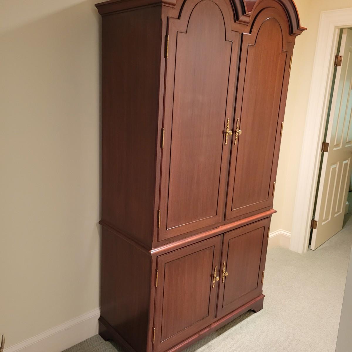 A large, solid wood storage cabinet that separates into two pieces. The top piece features three shelves that have removable dividers and one dovetailed drawer. The bottom has three dovetailed drawers. It measures approximately 42"x 19" x 79.5"H. Local pickup only. Winning bidder must bring assistance to help move and load this item due to its weight and/or size.