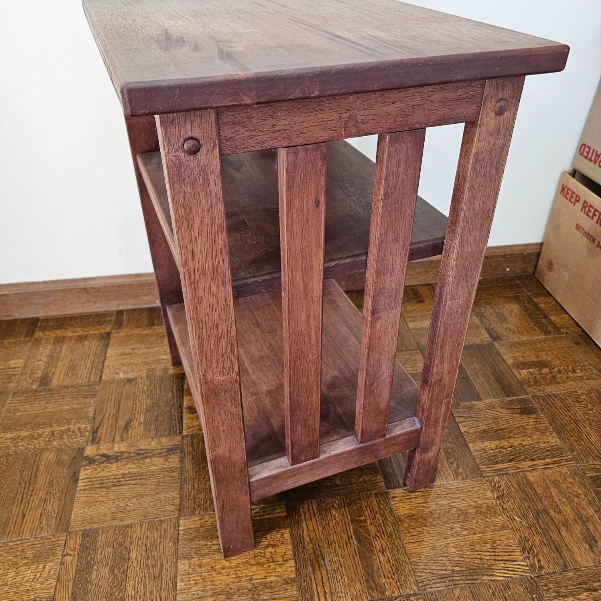 Nice compact side table with two shelves. Middle shelf is removable if needed. Table appears to be walnut, measures 19" x 14" x 24"H. See photos for details. Local pickup only.