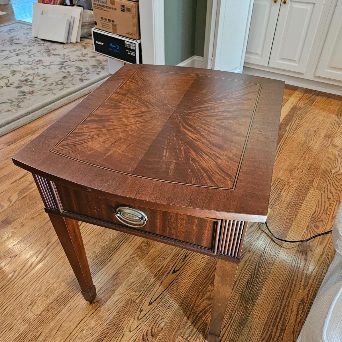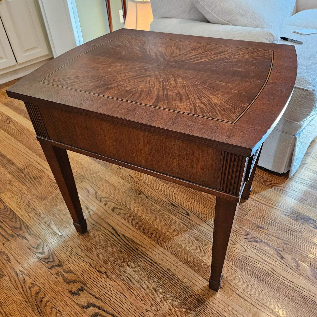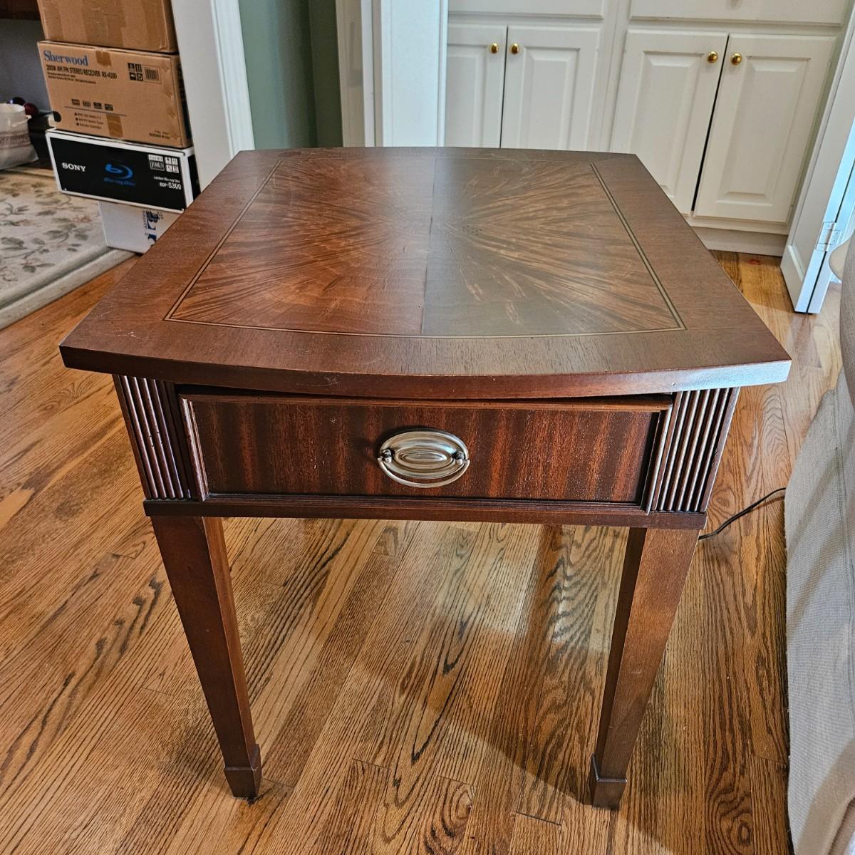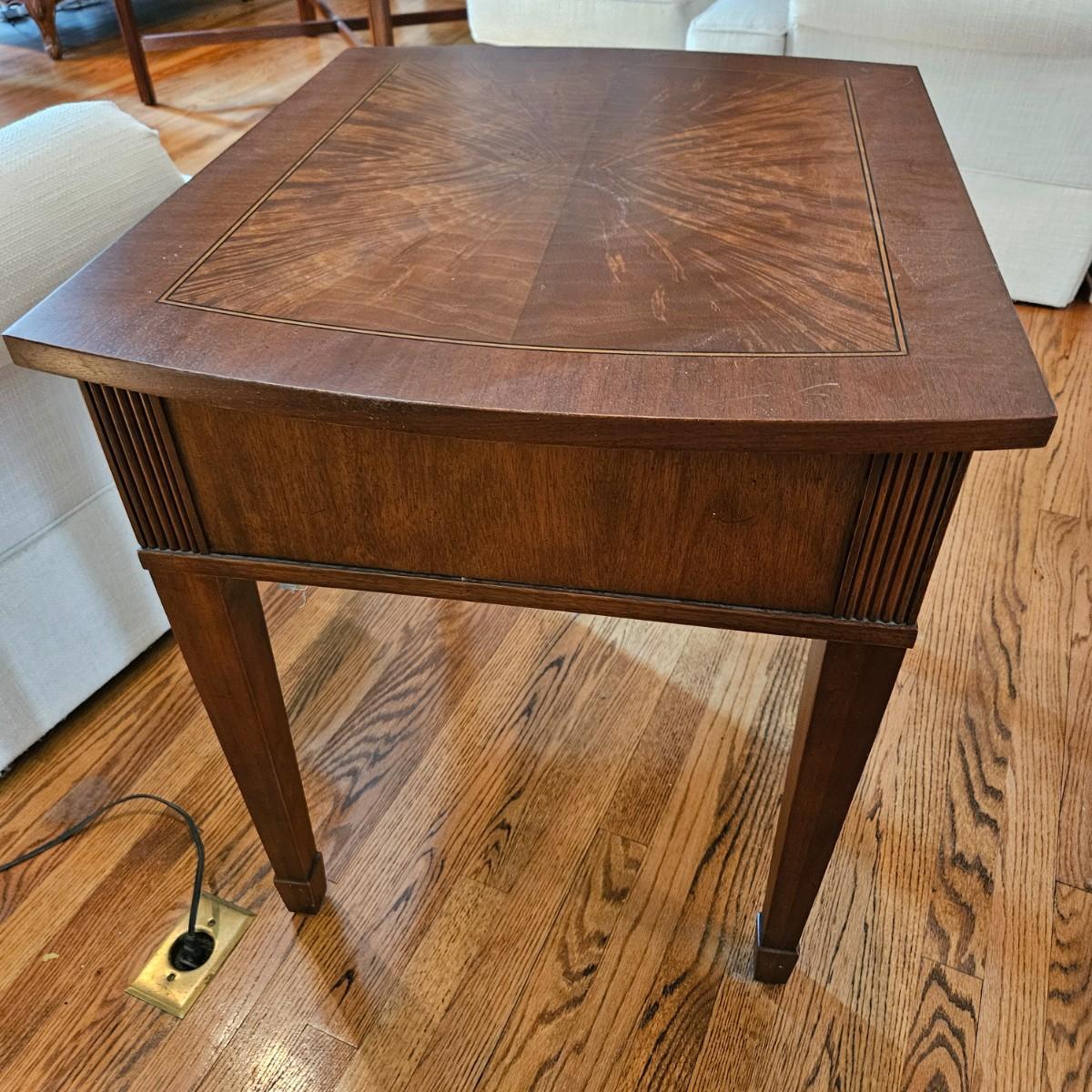 A solid wood side table that features a single dovetailed drawer and a veneered surface. It measures approximately 23" x 28" x 23"H. There are a few minor blemishes, see attached pictures for more detail. Local pickup only. Winning bidder must bring assistance to help move and load this item due to its weight and/or size.