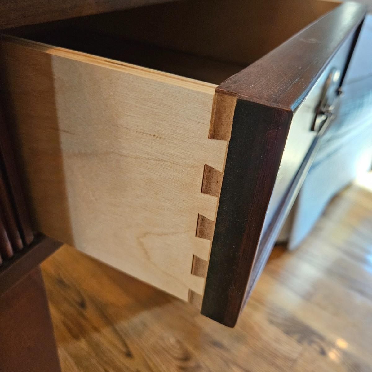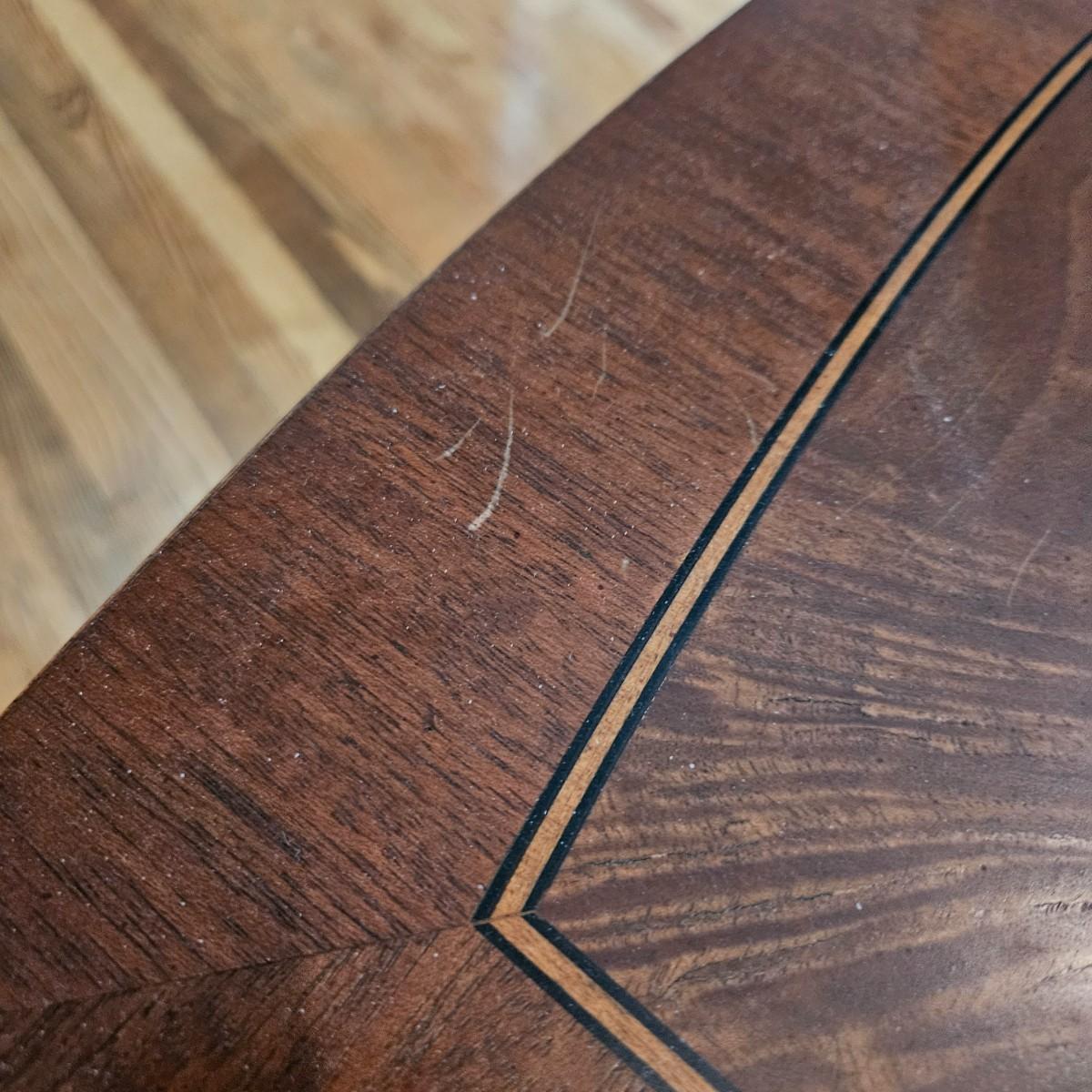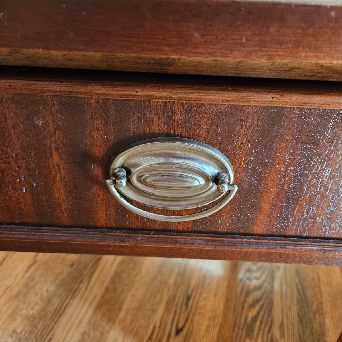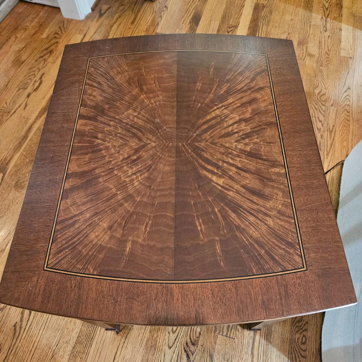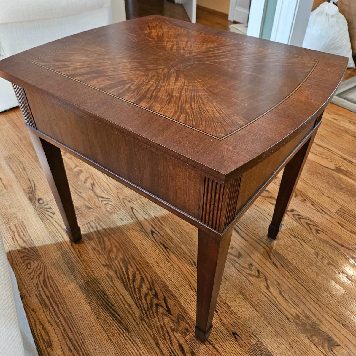 A solid wood side table that features a single dovetailed drawer and a veneered surface. It measures approximately 23" x 28" x 23"H. There are a few minor blemishes, see attached pictures for more detail. Local pickup only. Winning bidder must bring assistance to help move and load this item due to its weight and/or size.