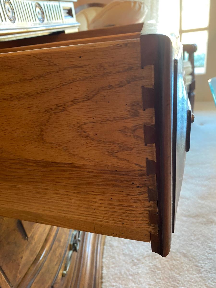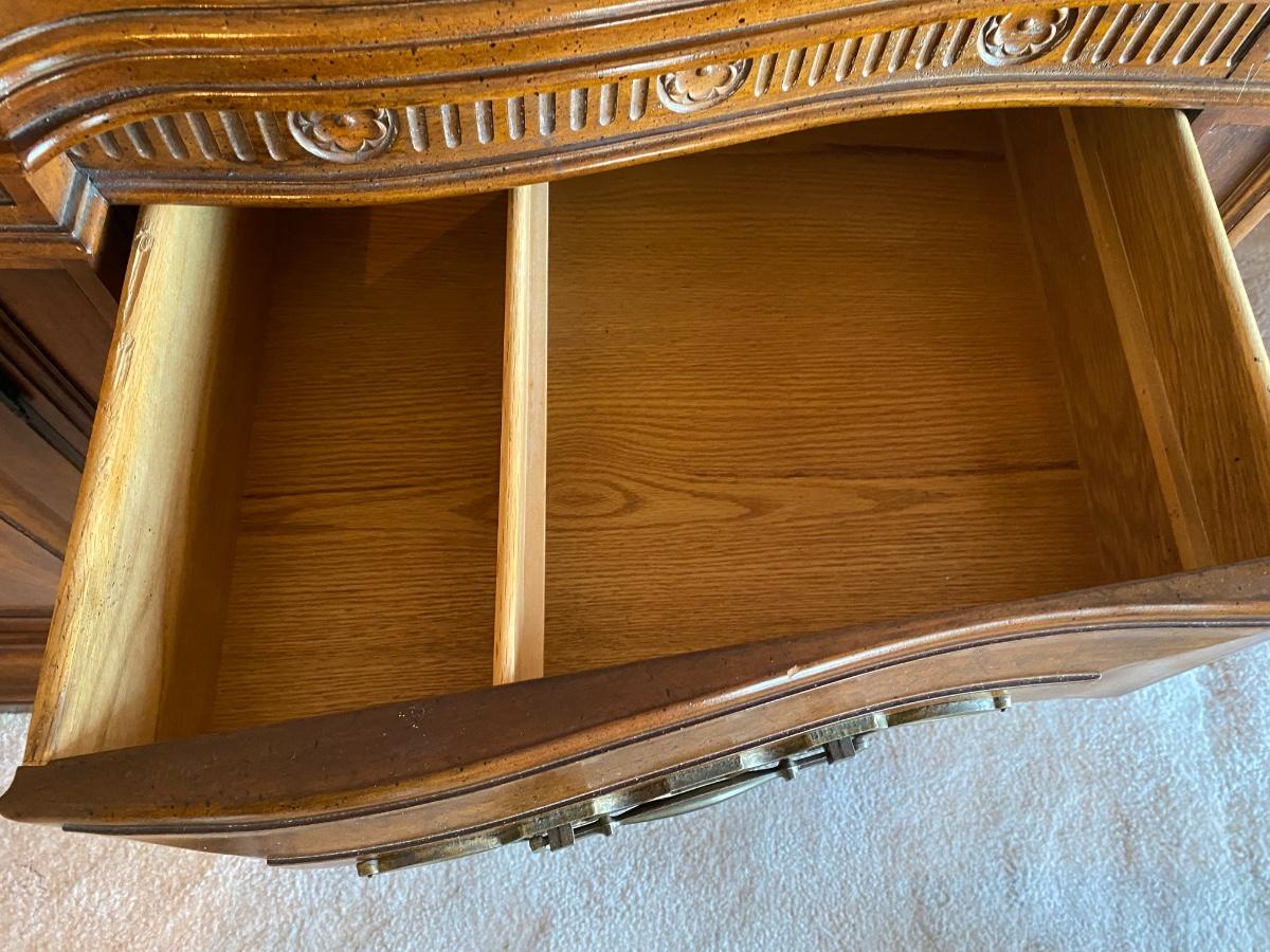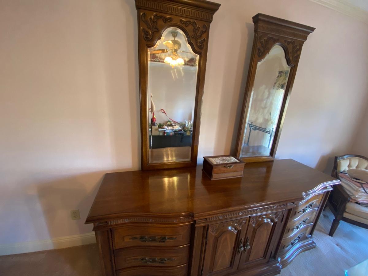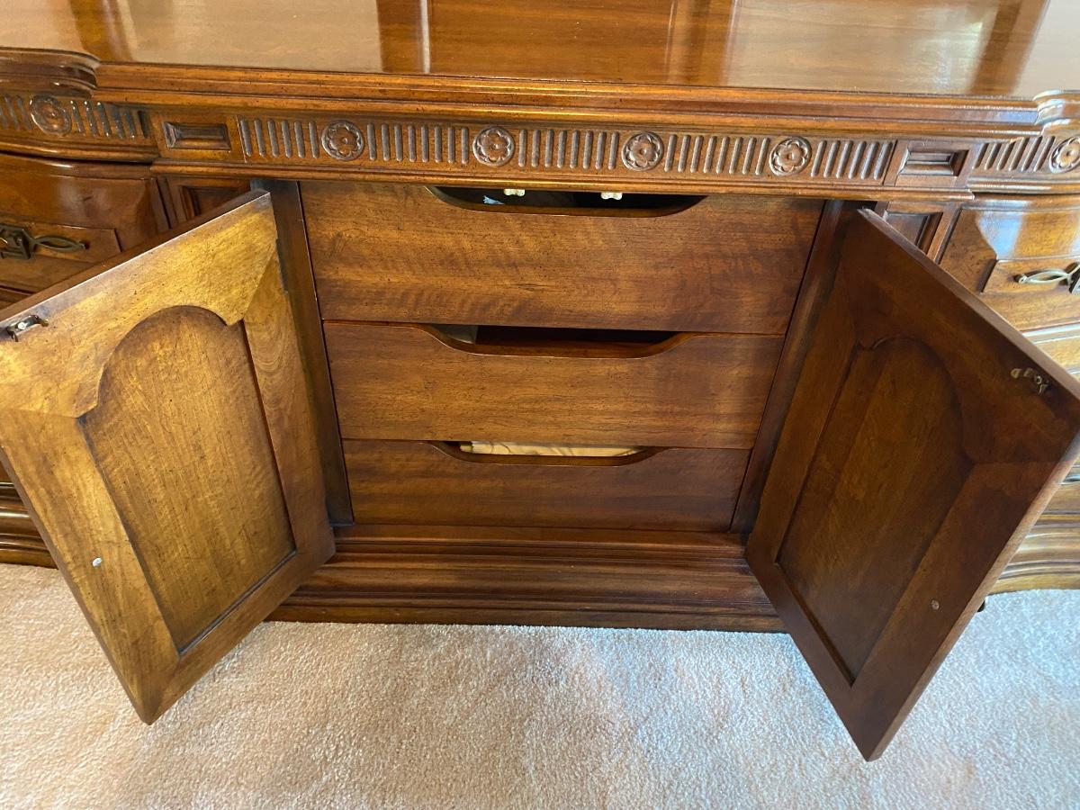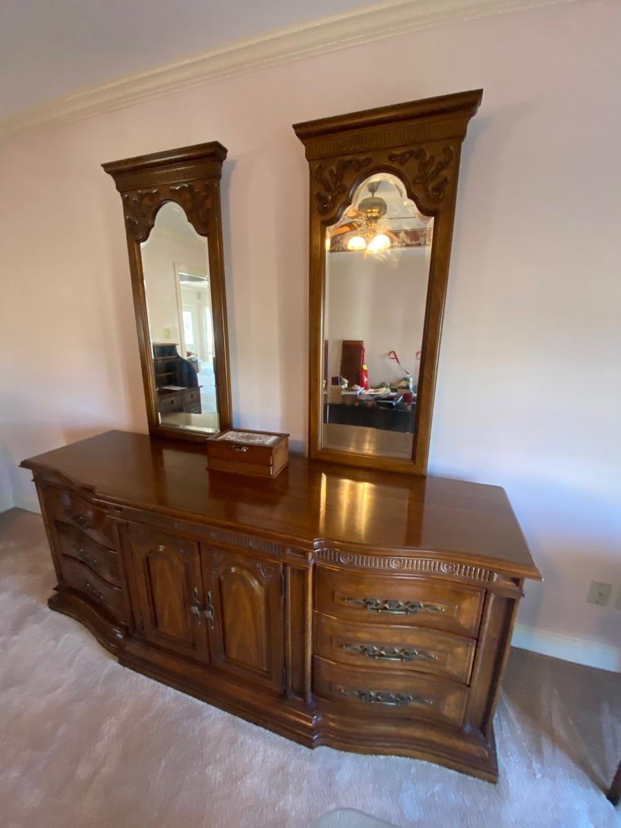 Solid wood vintage triple dresser with two beveled mirrors. White Fine Furniture. Nine dovetailed drawers.