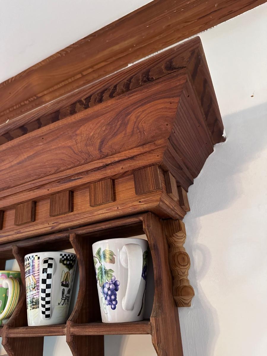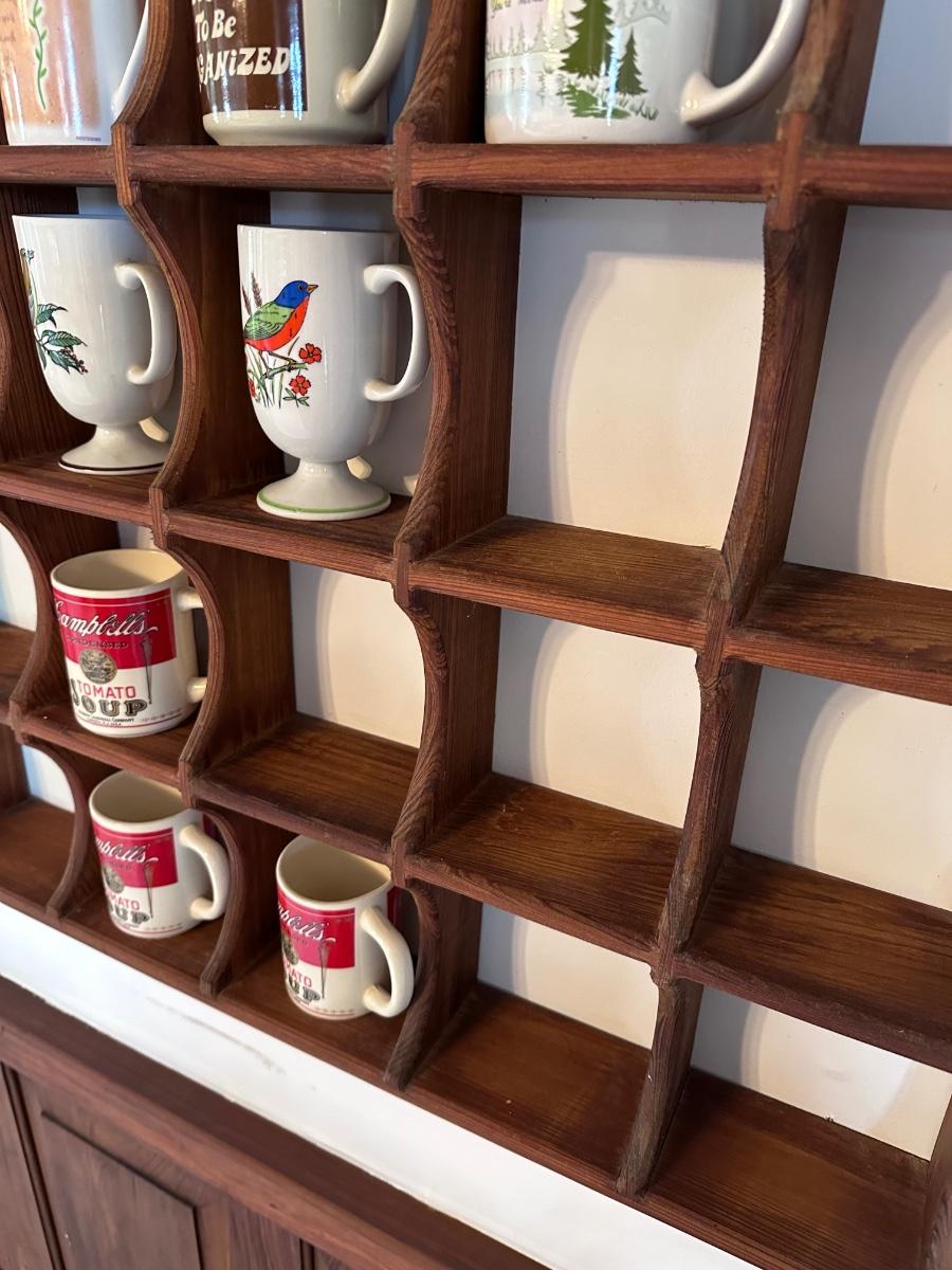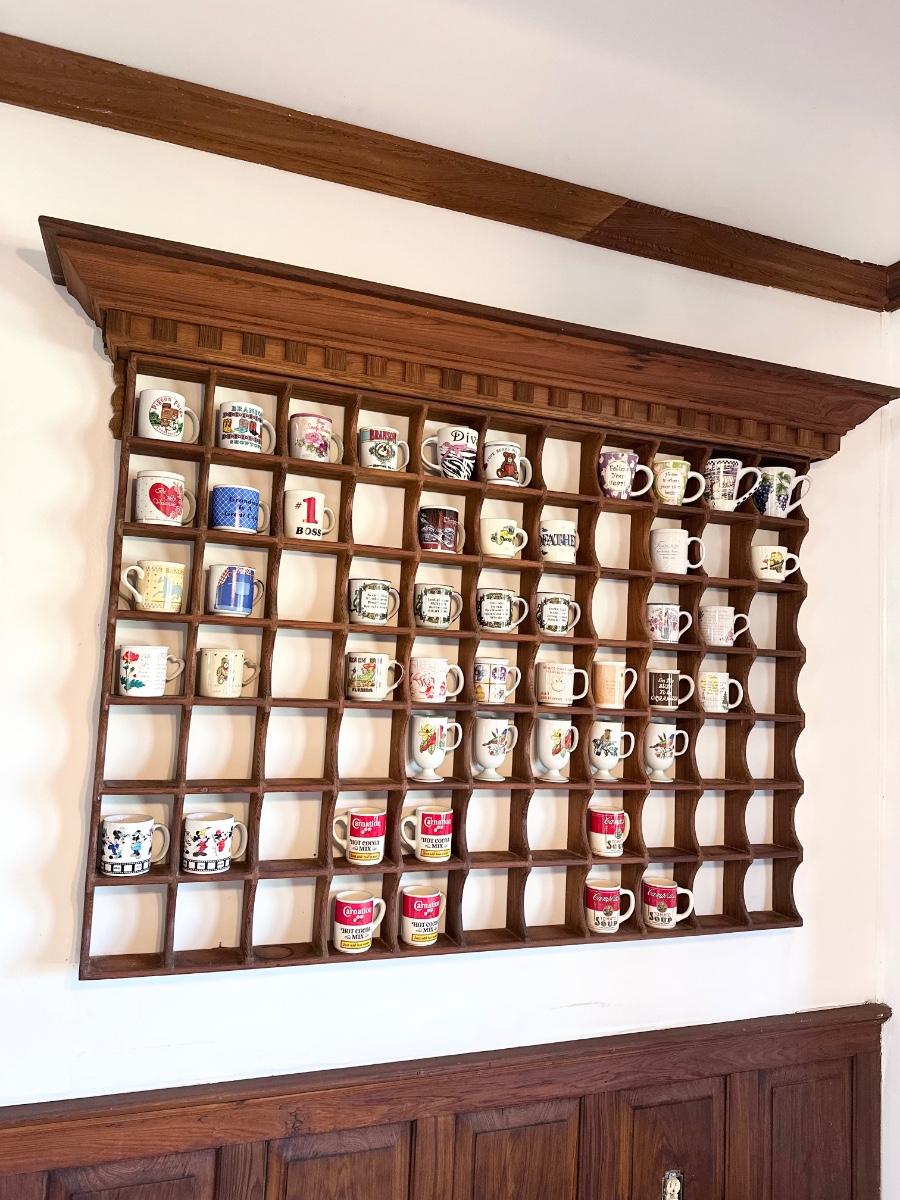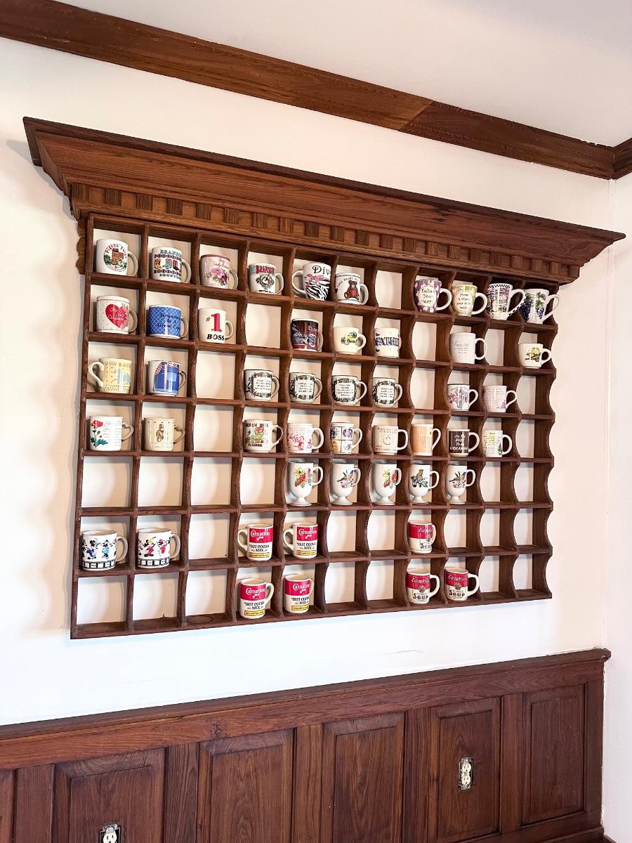 Be prepared to take down. It is nailed to the wall as several pieces. Overall dimensions are 71”W x 48” H x 9.25” D ~ each cubby is 5.50” H x 4.75” W ~ Coffee Mugs Included
