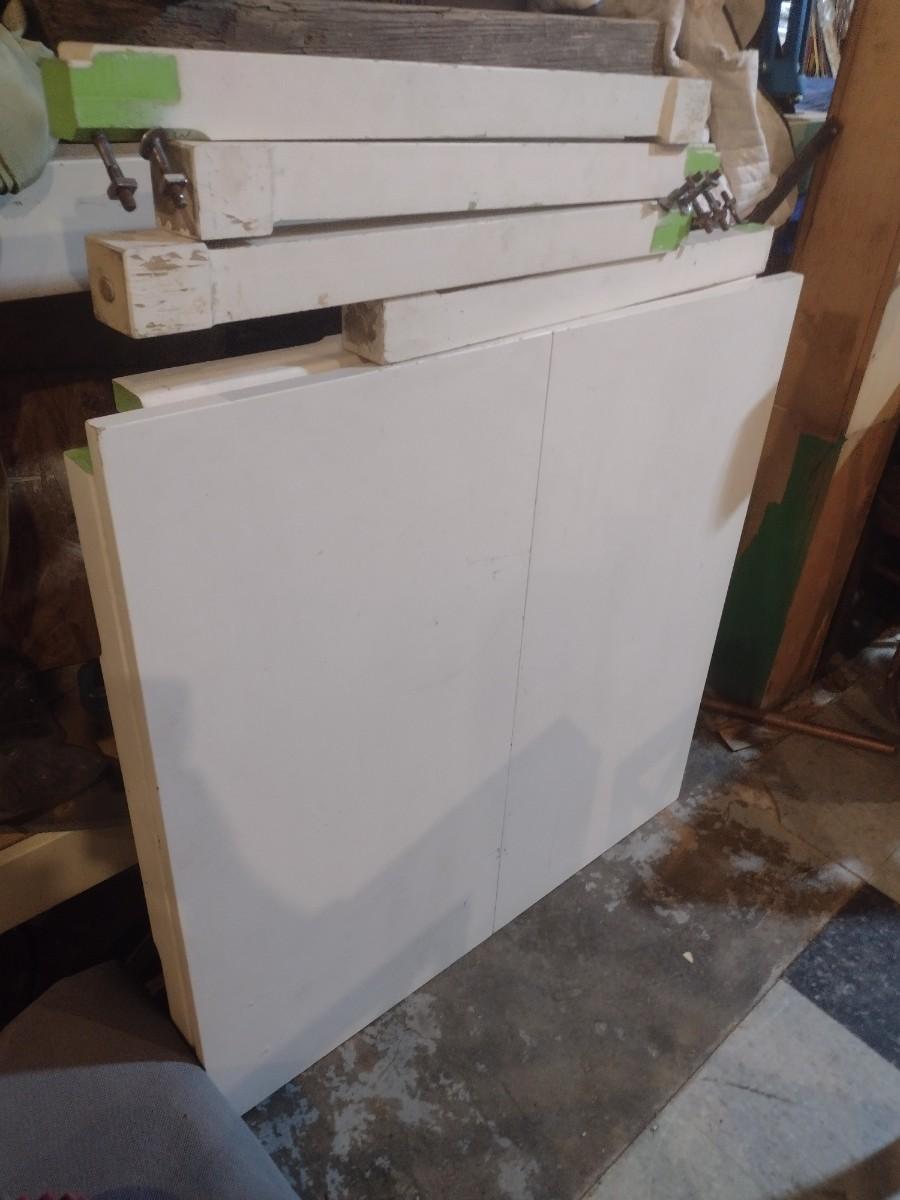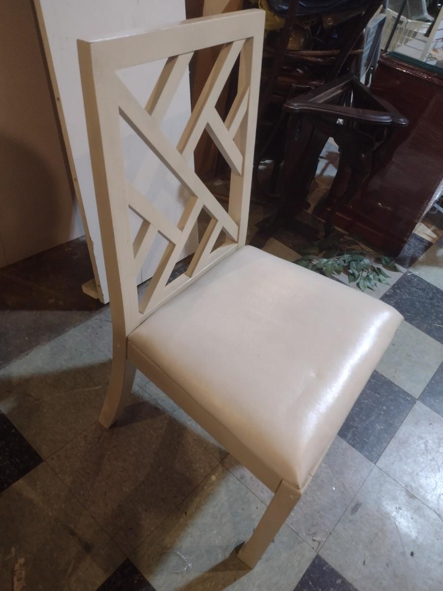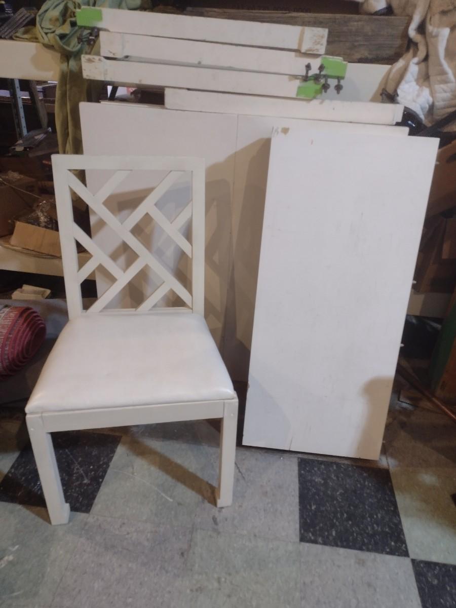 Solid Wood White Finish Table and Four Matching Chairs legs have been removed for storage. Table has leaf. Chair seat are upholstered vinyl