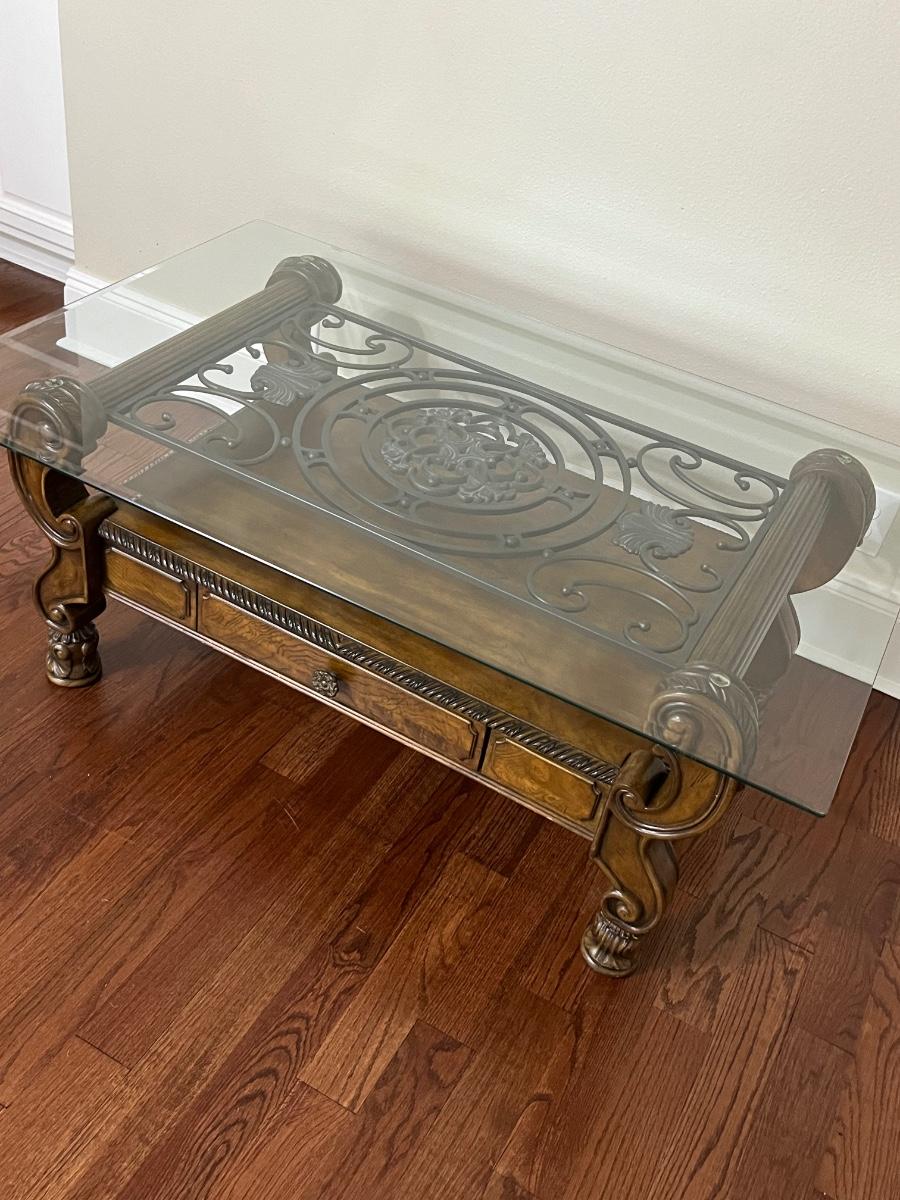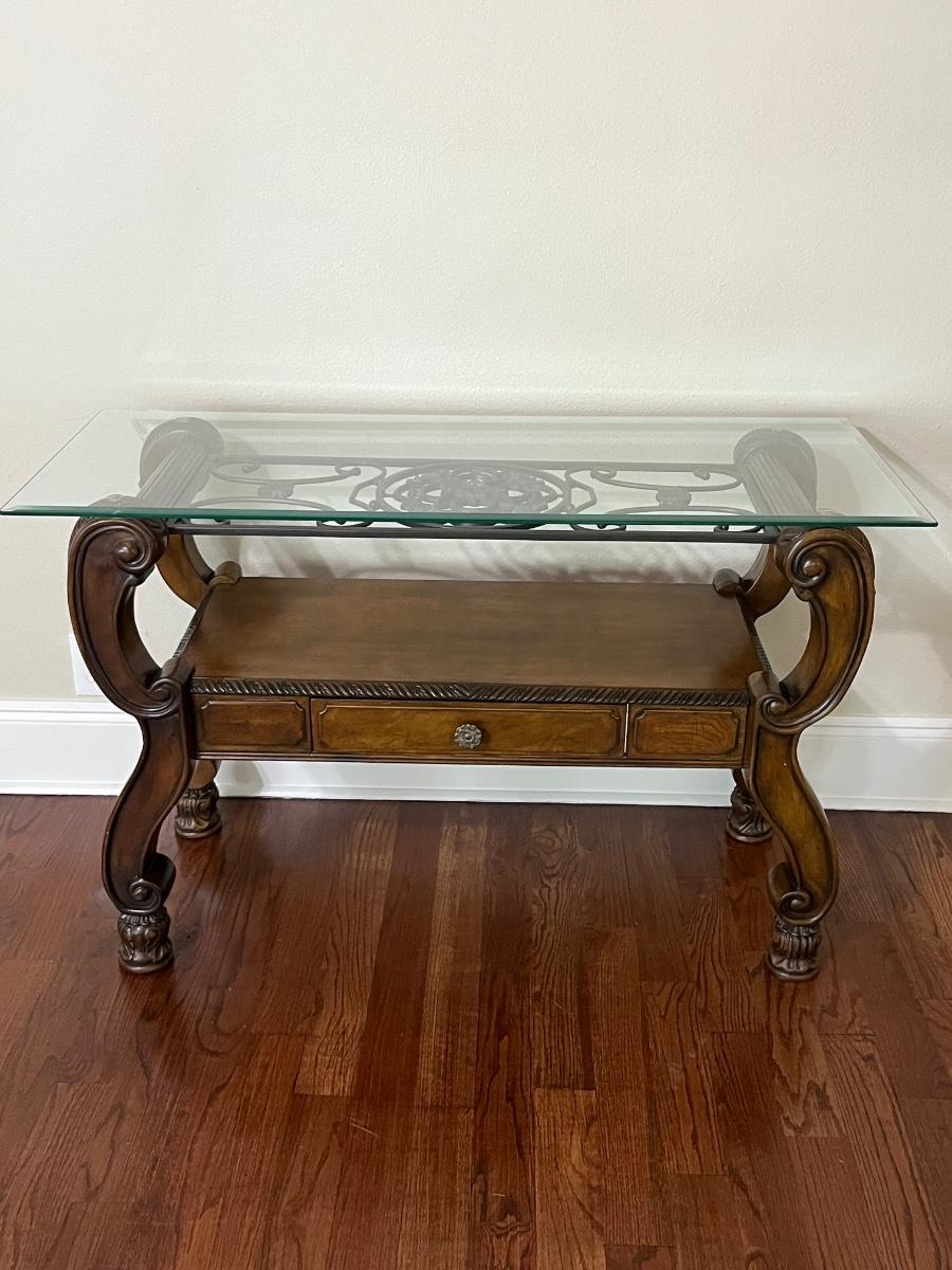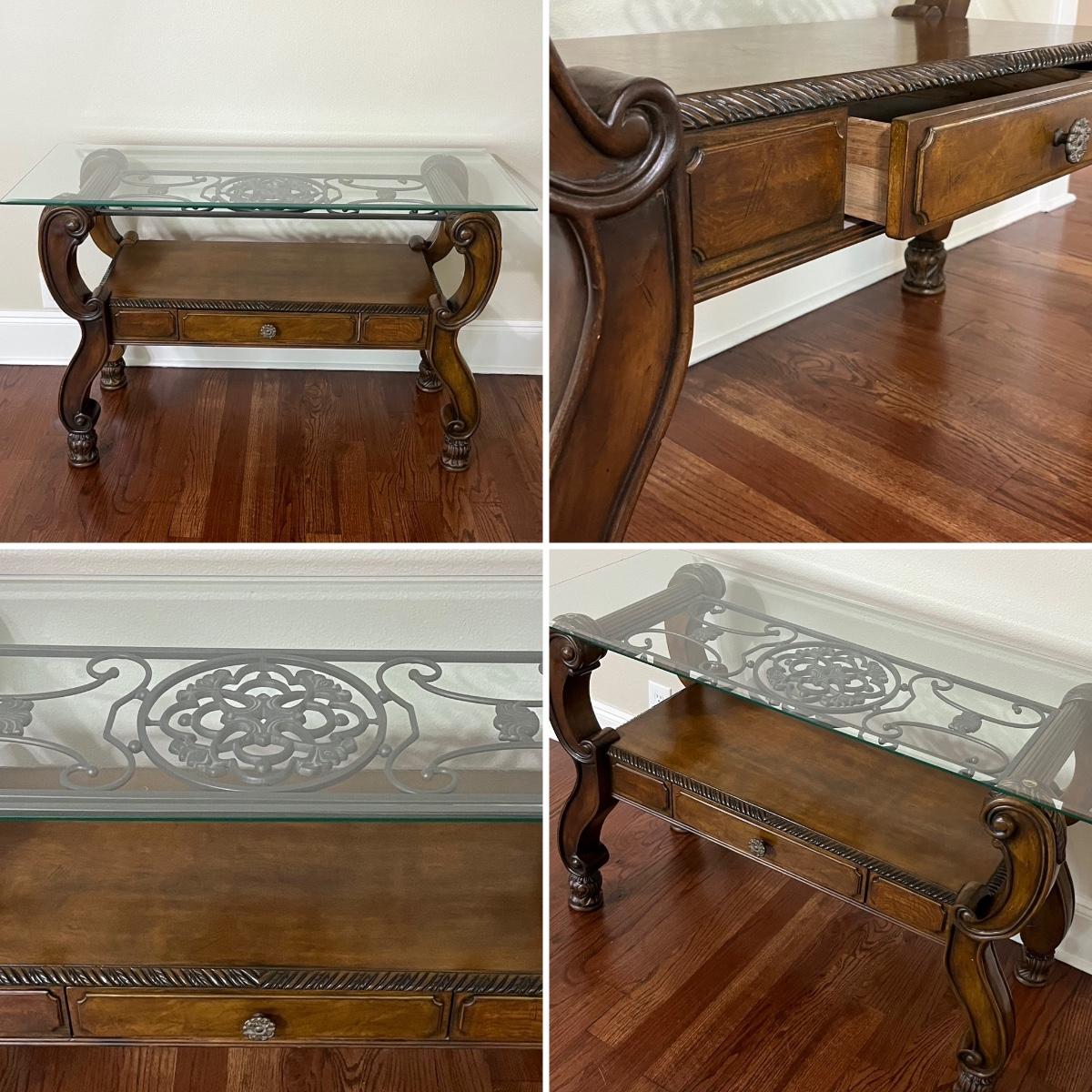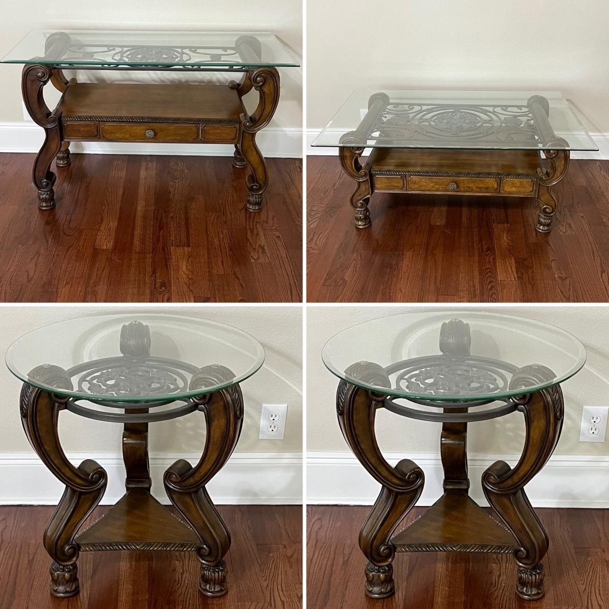 Includes = (1) Coffee table 20" H x 48" W x 32" D ~ (1) Sofa table 30" H x 48" W x 20.5" D ~ (2) Side tables 26.5" H x 26" Round ~ Drawers slide easy ~ No brand name ~ Glass tops have minor scratches from use