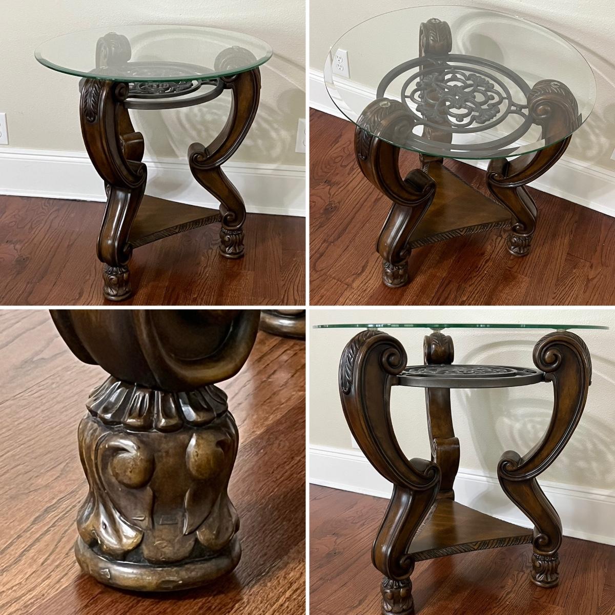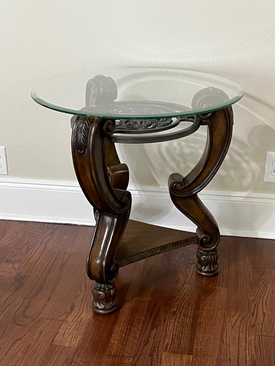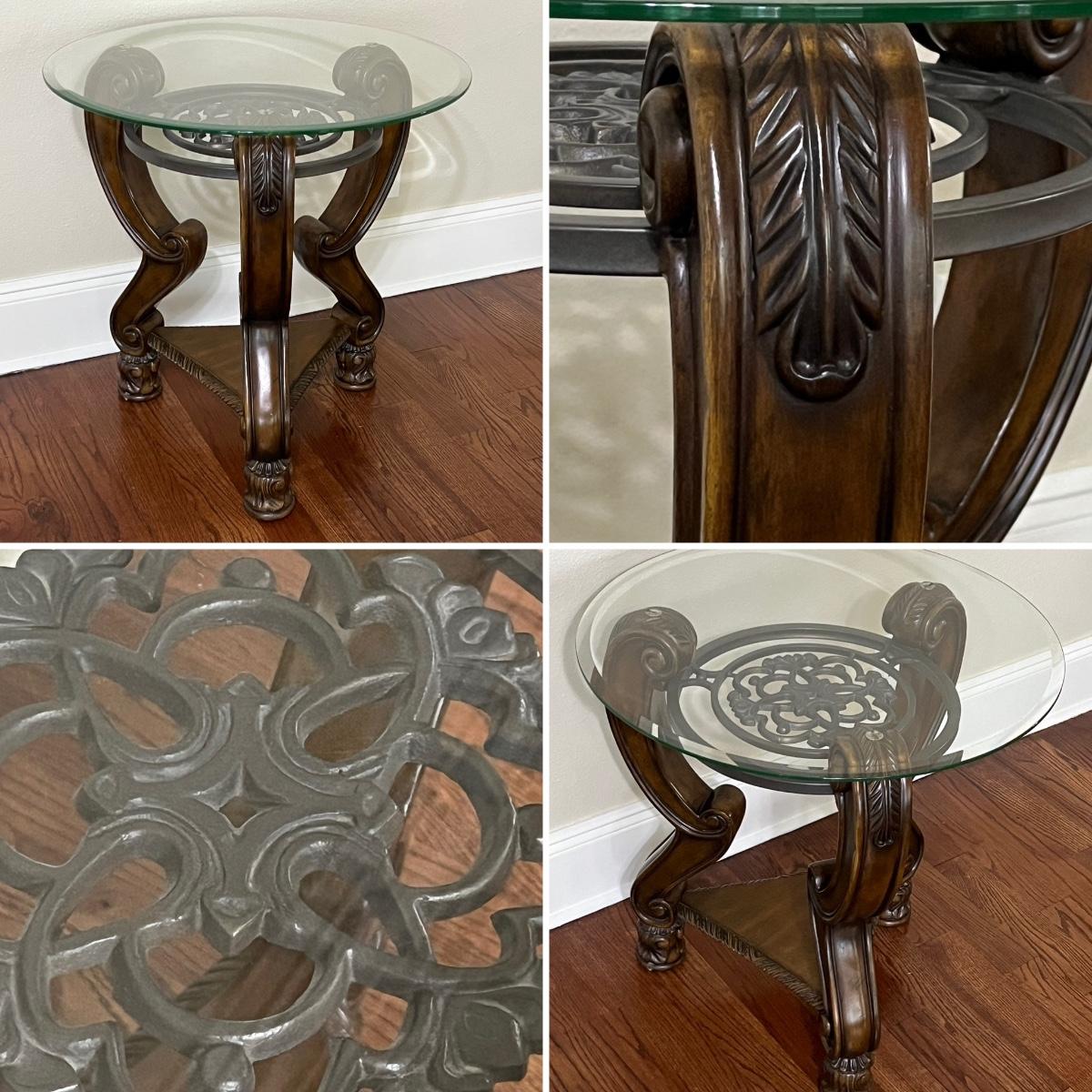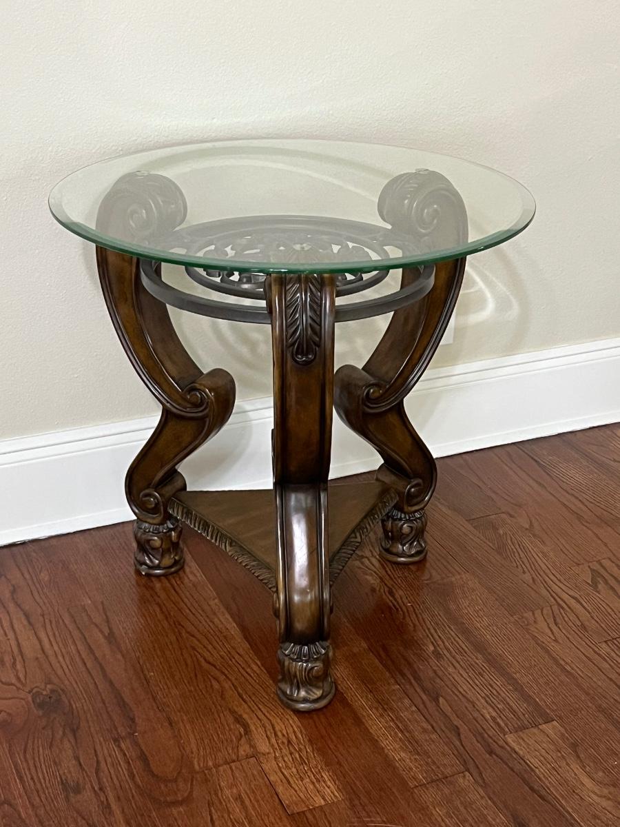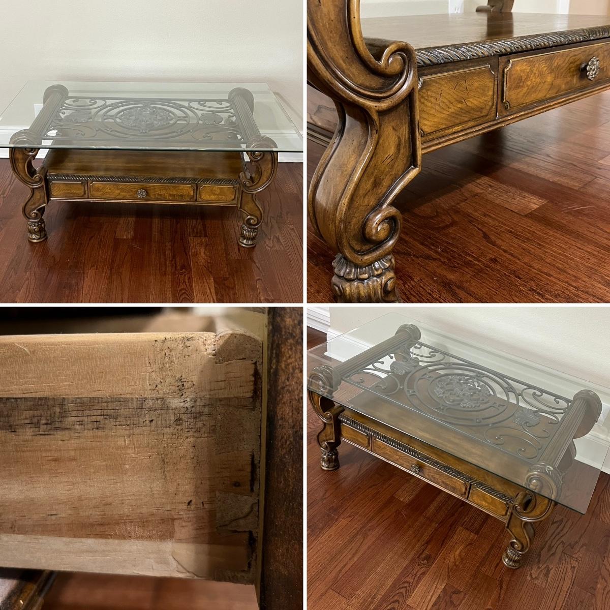 Includes = (1) Coffee table 20" H x 48" W x 32" D ~ (1) Sofa table 30" H x 48" W x 20.5" D ~ (2) Side tables 26.5" H x 26" Round ~ Drawers slide easy ~ No brand name ~ Glass tops have minor scratches from use