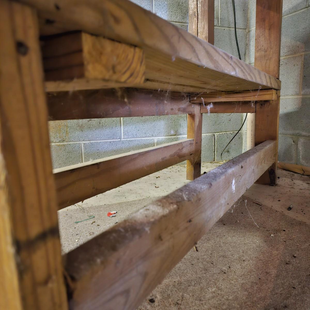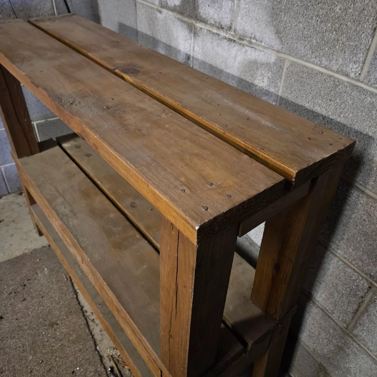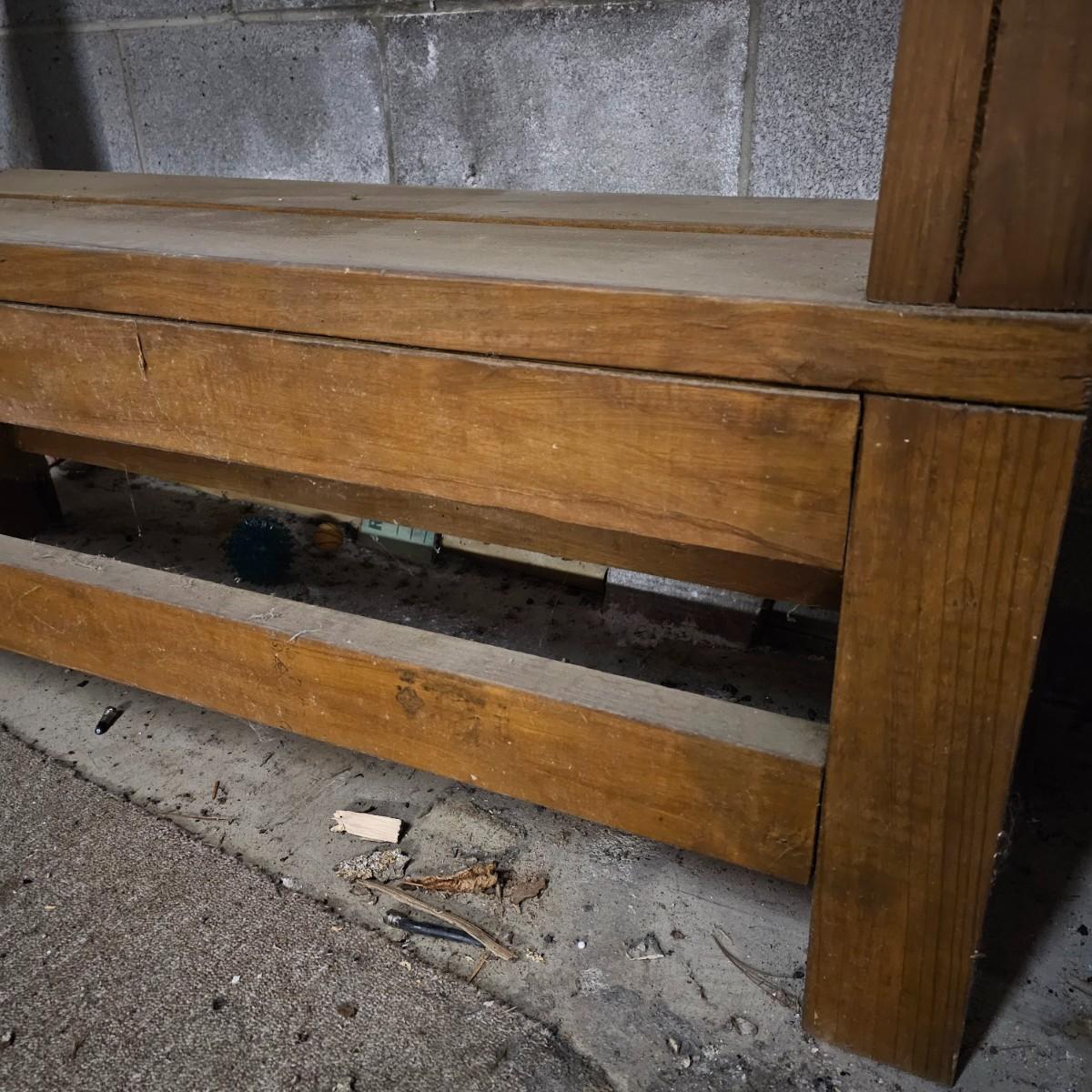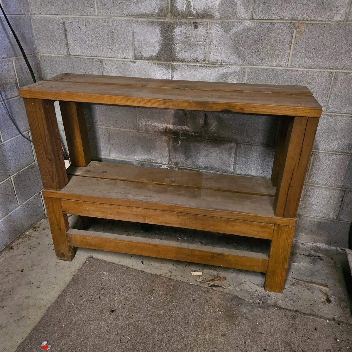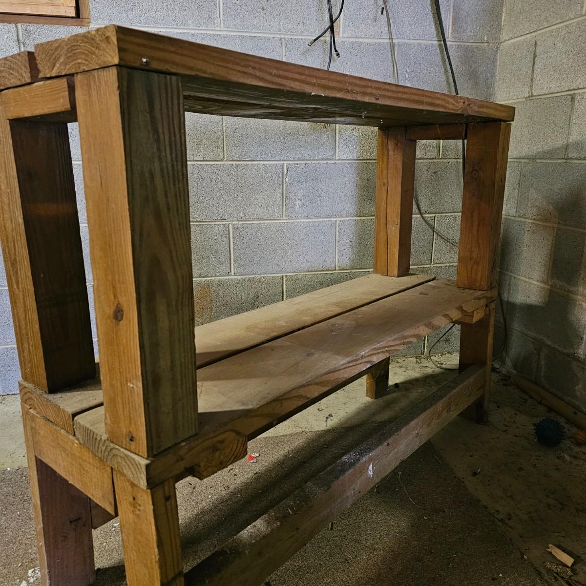 Sturdy solid wood work shelf or table. 2x4 and 2x6 construction, unit is 48" x15" x37"h. See photos for details. Local pickup only.