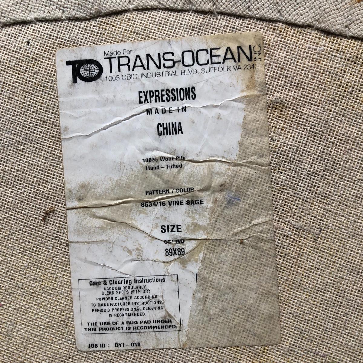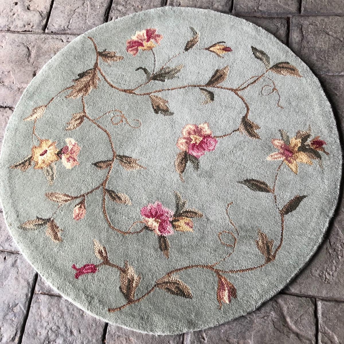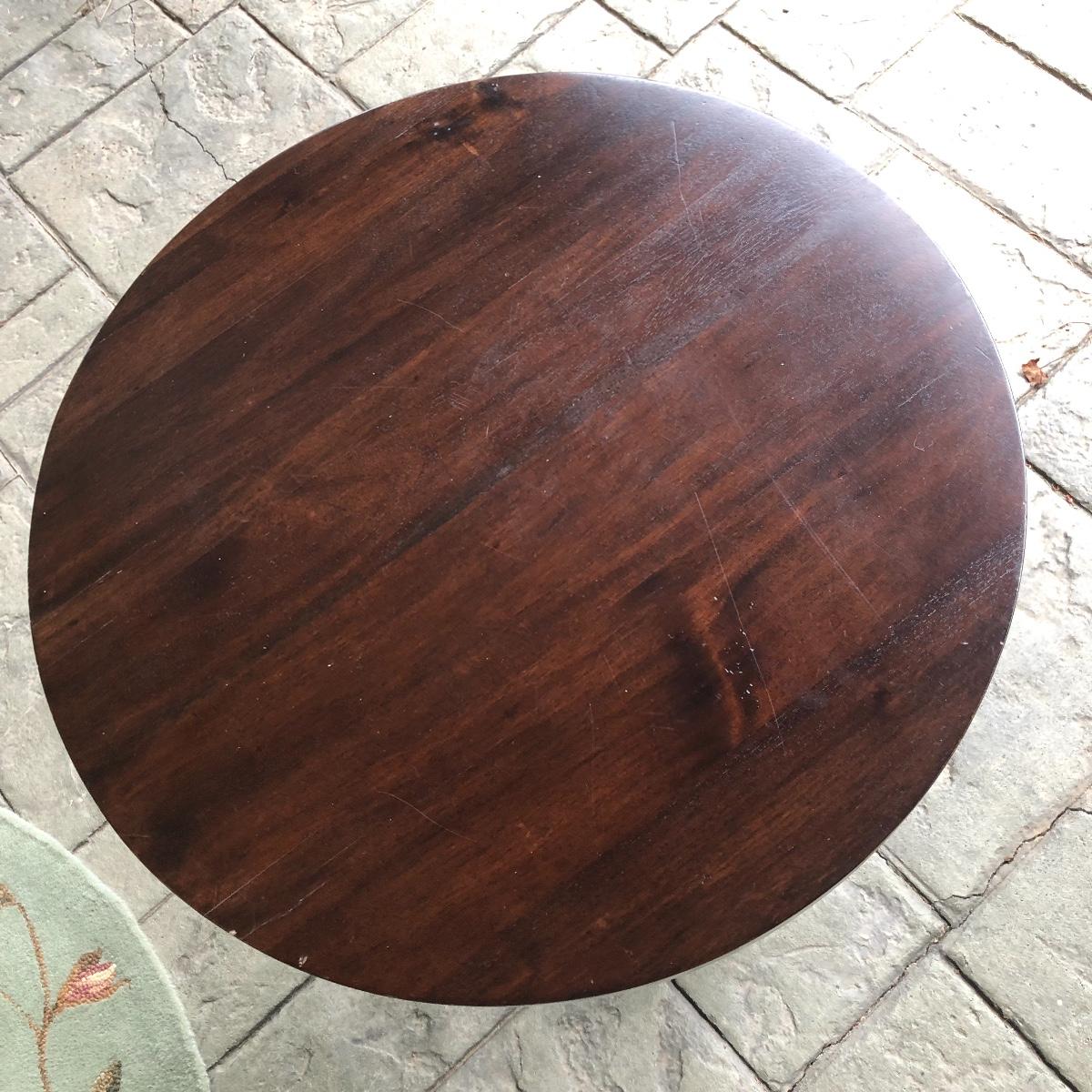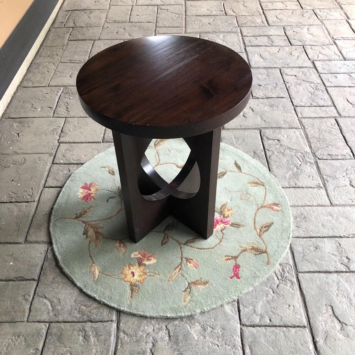 The end table is solid wood. It’s top measures 20” in diameter. It is 24” tall. The oval rug is 36.5” in diameter. Although the back is yellowed in spots, no stains come through to the front. The rig appears to be a wool blend. Local pick up only.