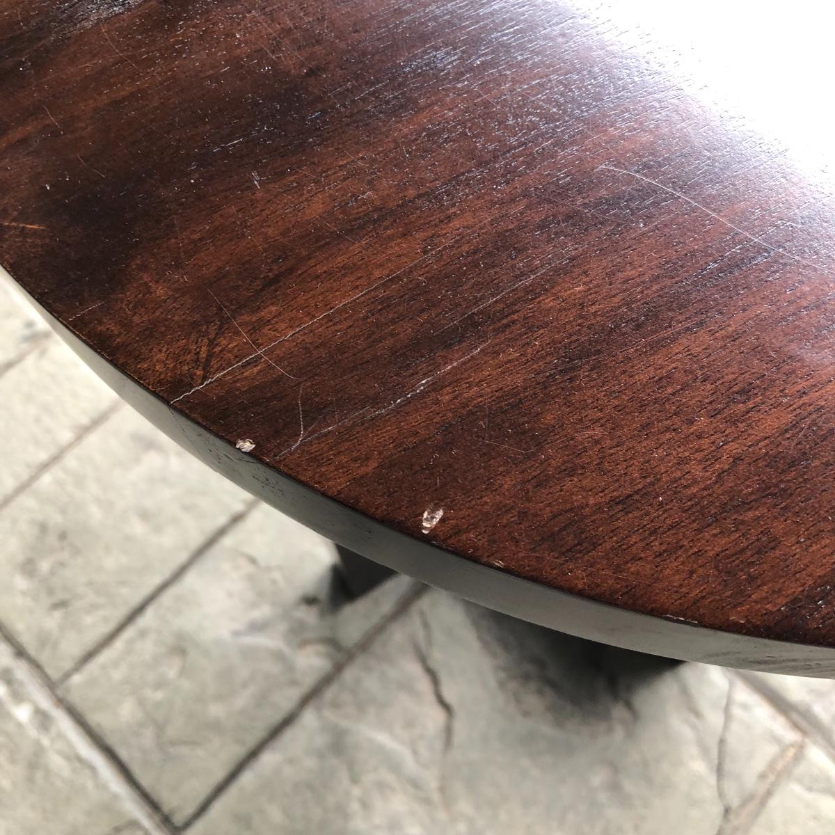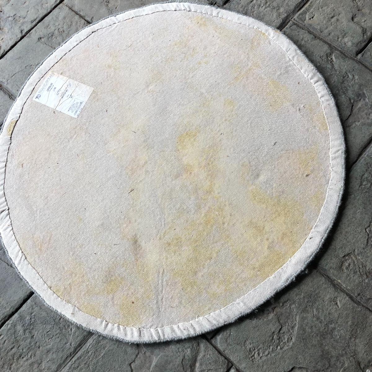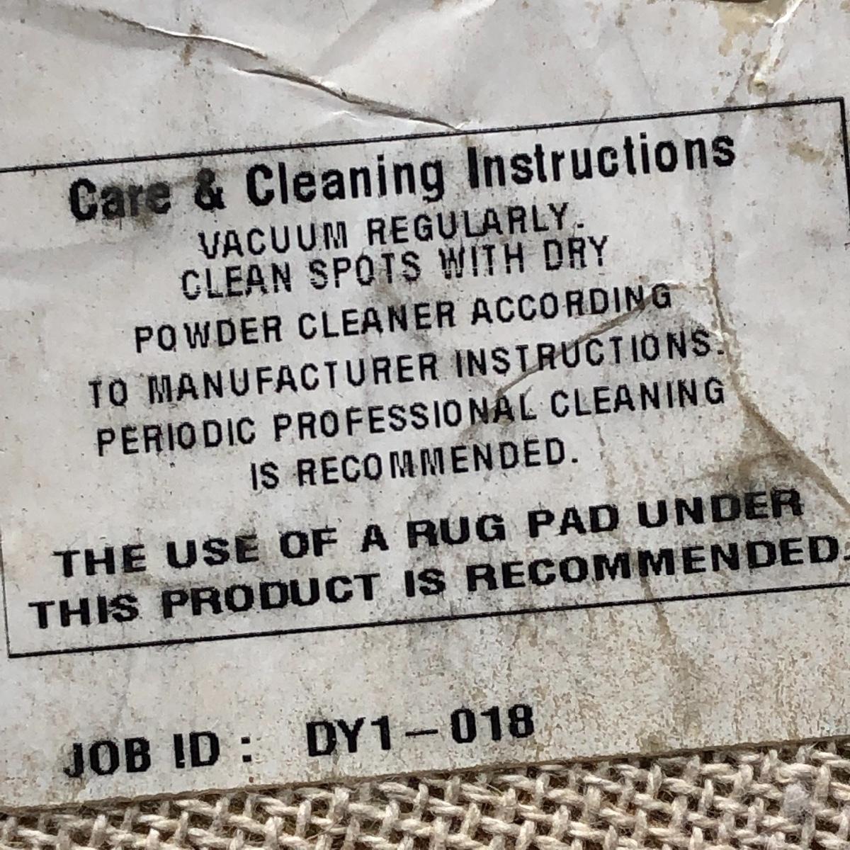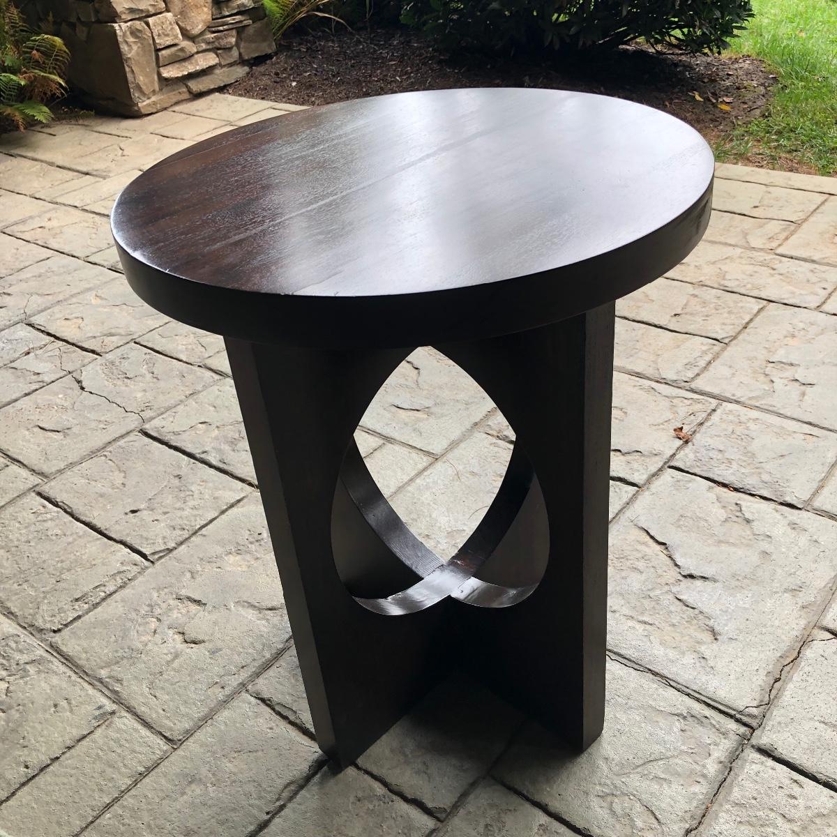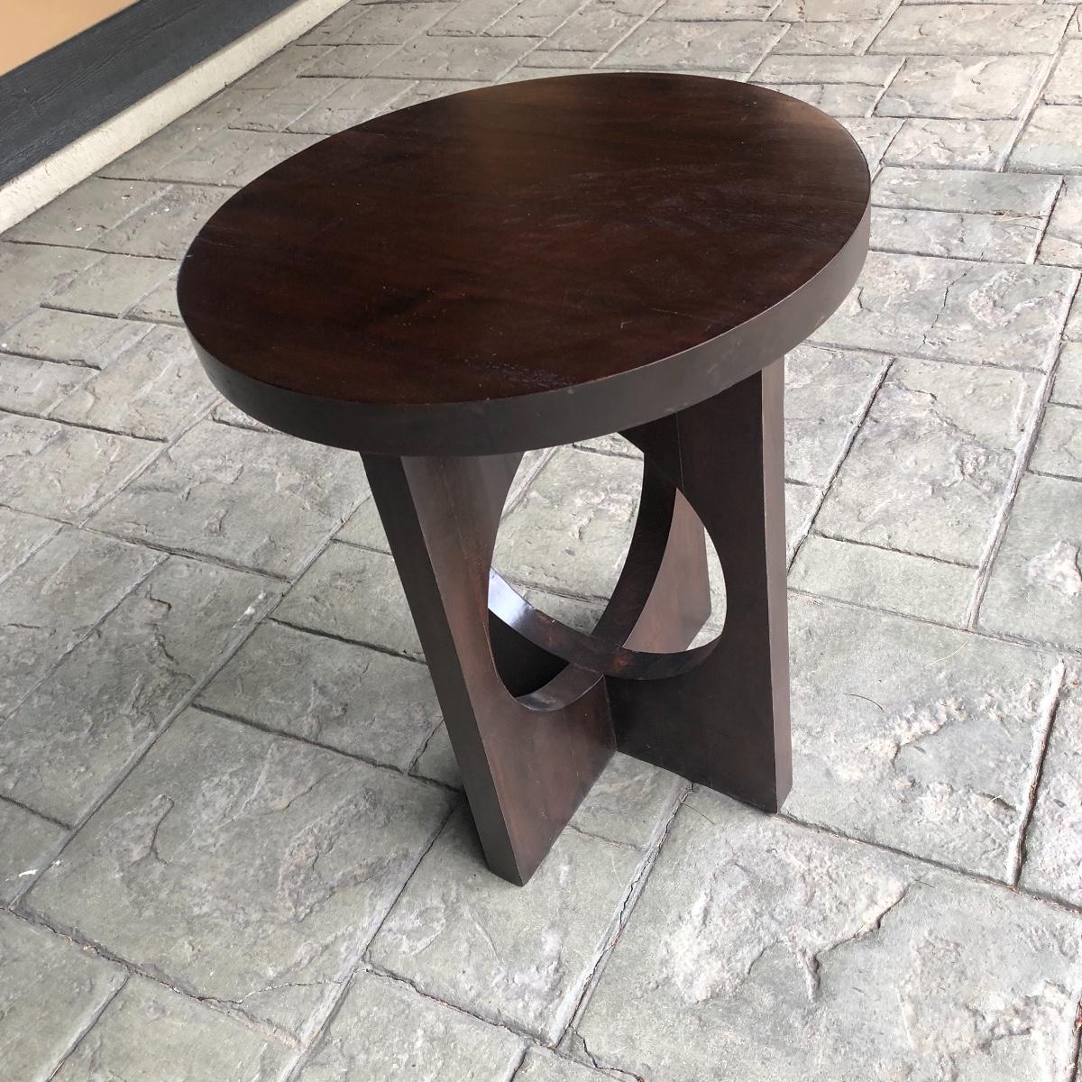 The end table is solid wood. It’s top measures 20” in diameter. It is 24” tall. The oval rug is 36.5” in diameter. Although the back is yellowed in spots, no stains come through to the front. The rig appears to be a wool blend. Local pick up only.