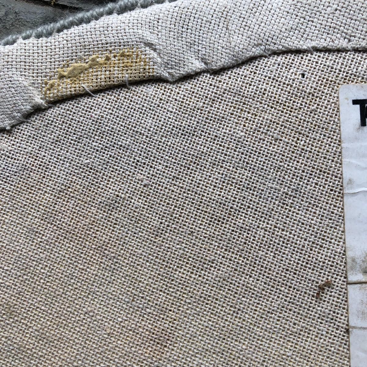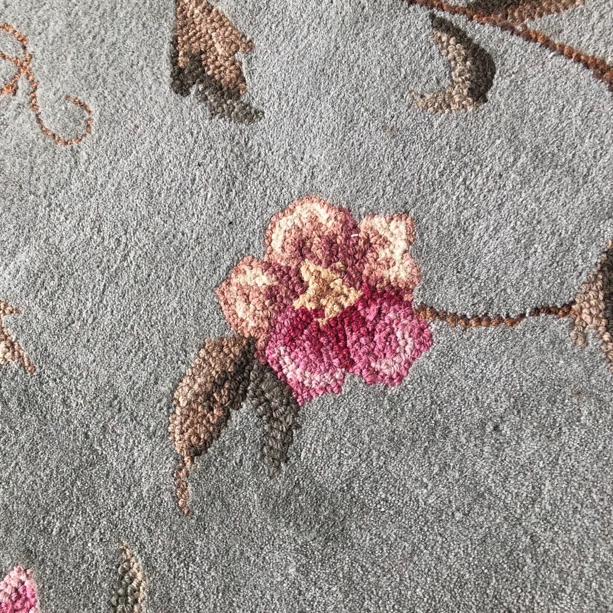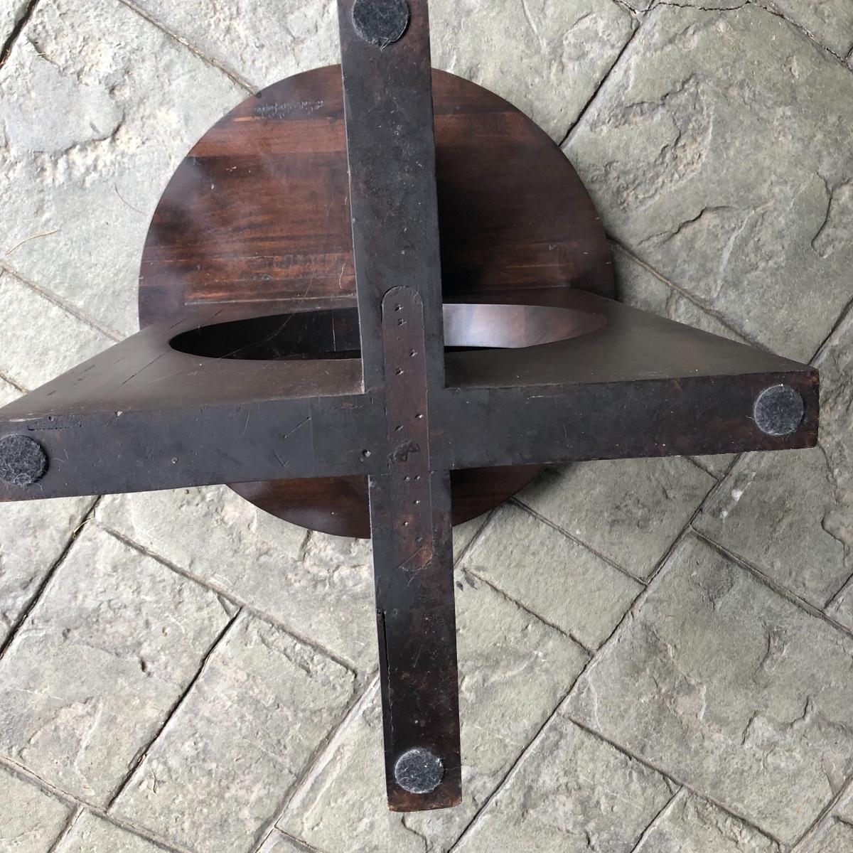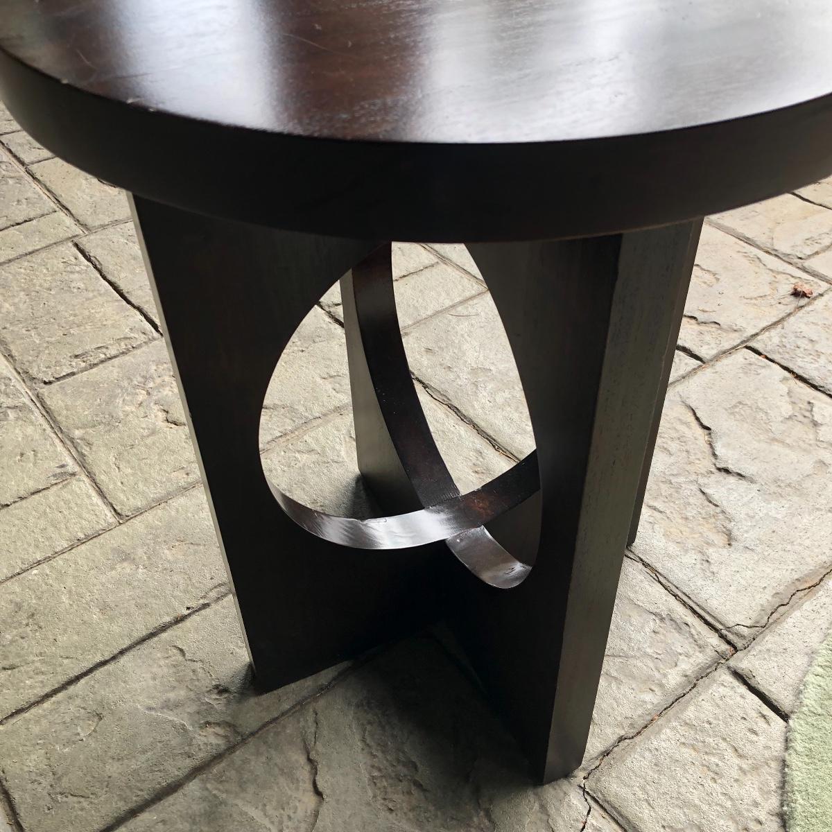 The end table is solid wood. It’s top measures 20” in diameter. It is 24” tall. The oval rug is 36.5” in diameter. Although the back is yellowed in spots, no stains come through to the front. The rig appears to be a wool blend. Local pick up only.