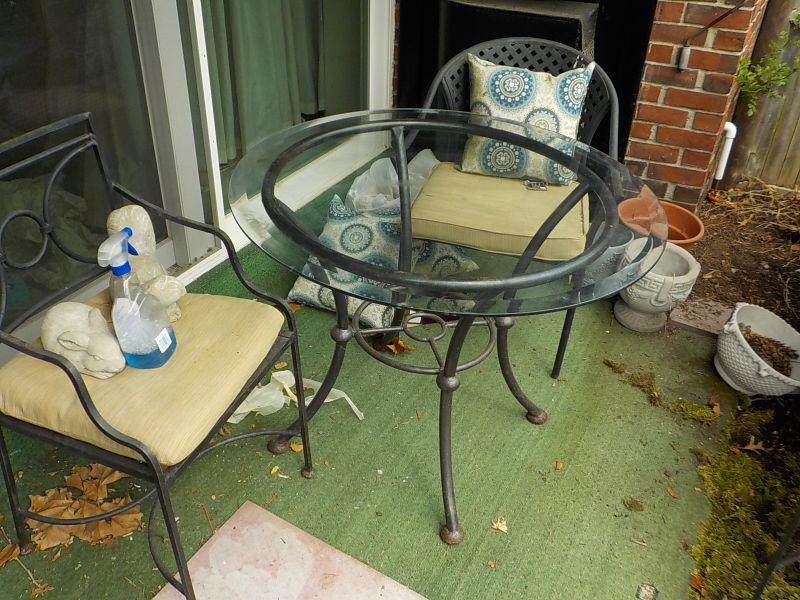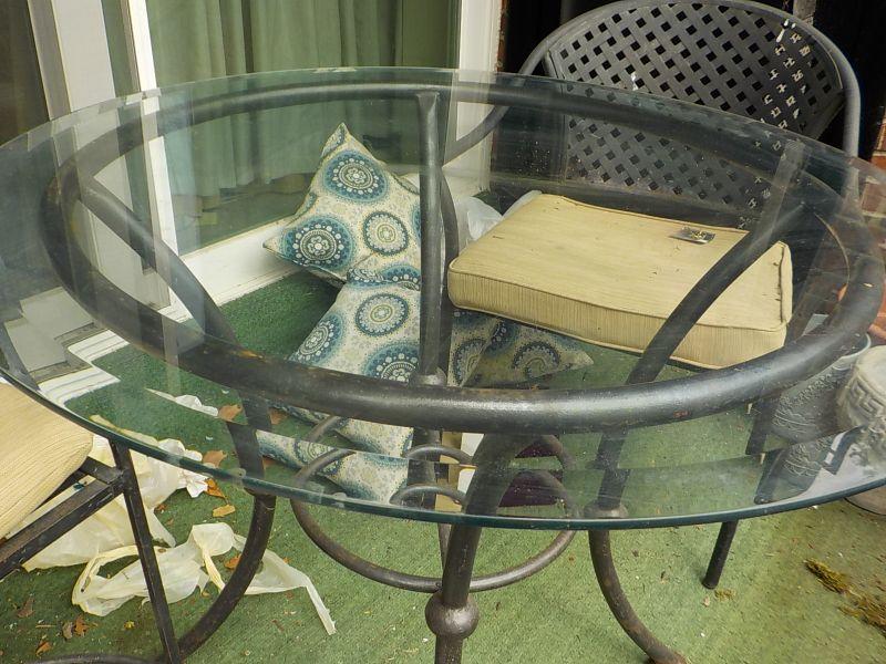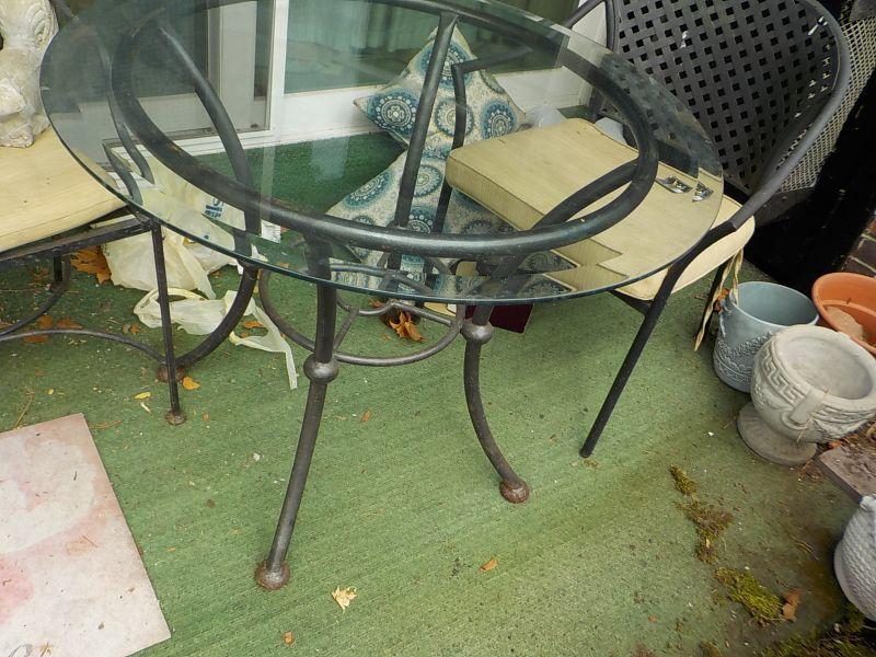 Solid Wrought iron garden outside table and chairs/ glass top.