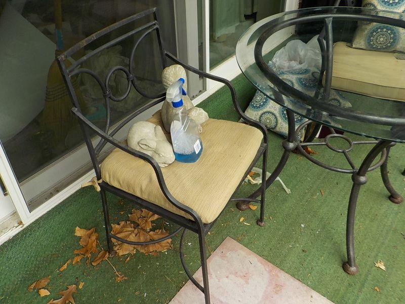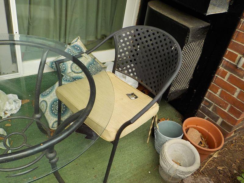 4 Chairs with cushions and solid wrought iron chairs and table.