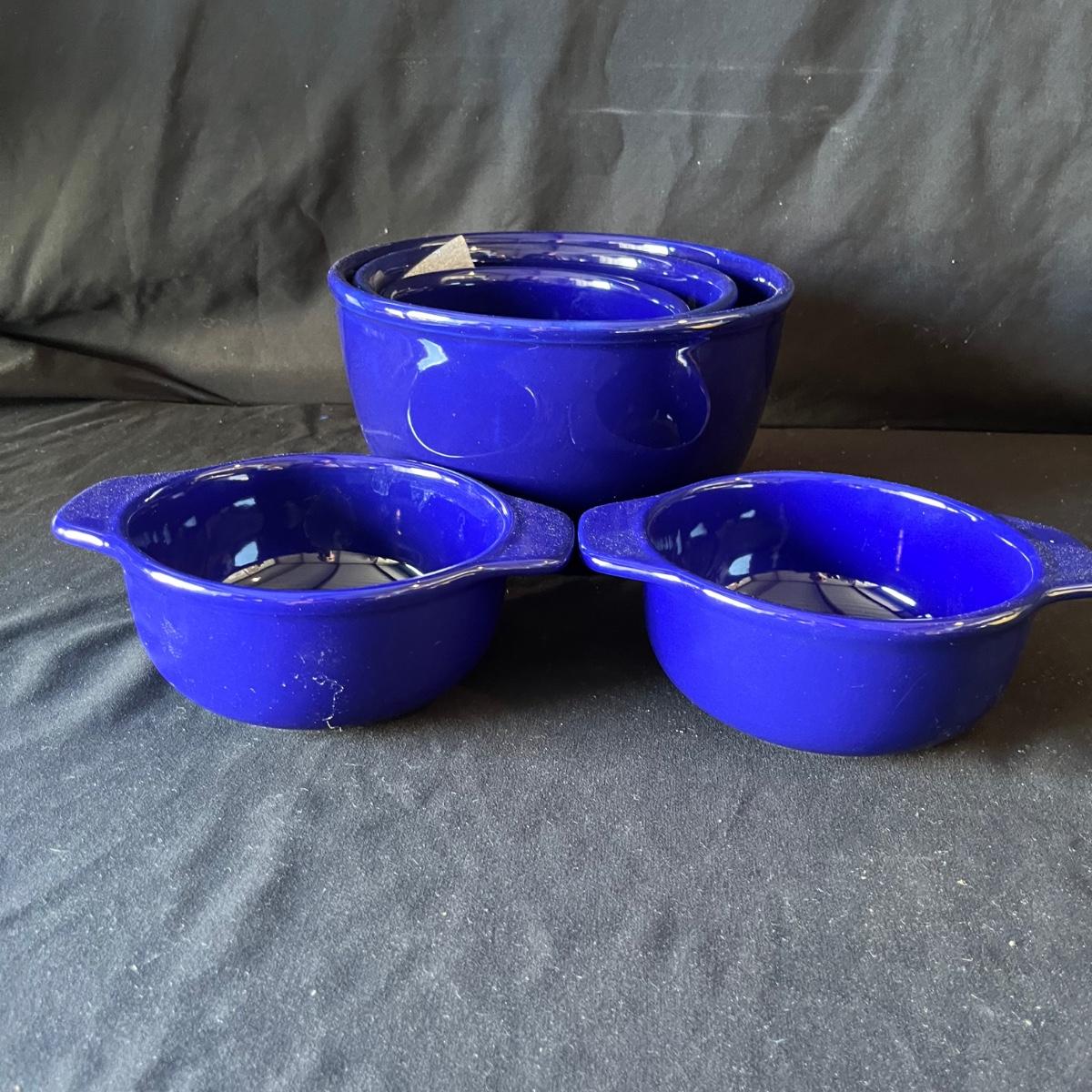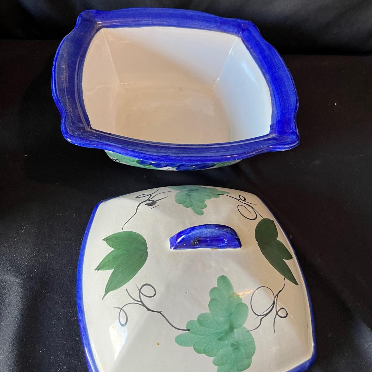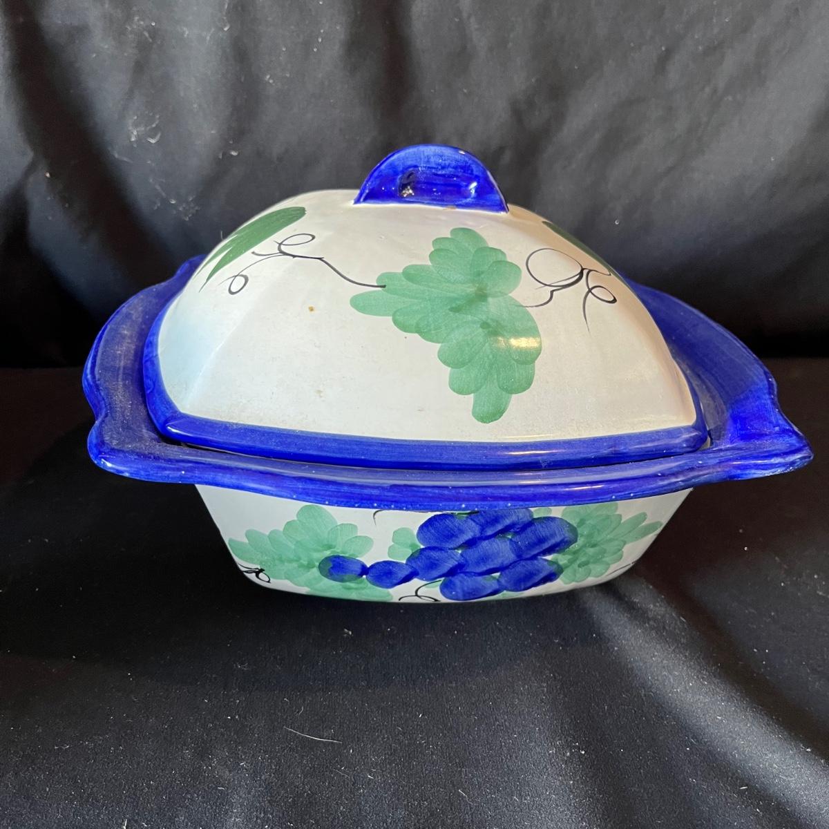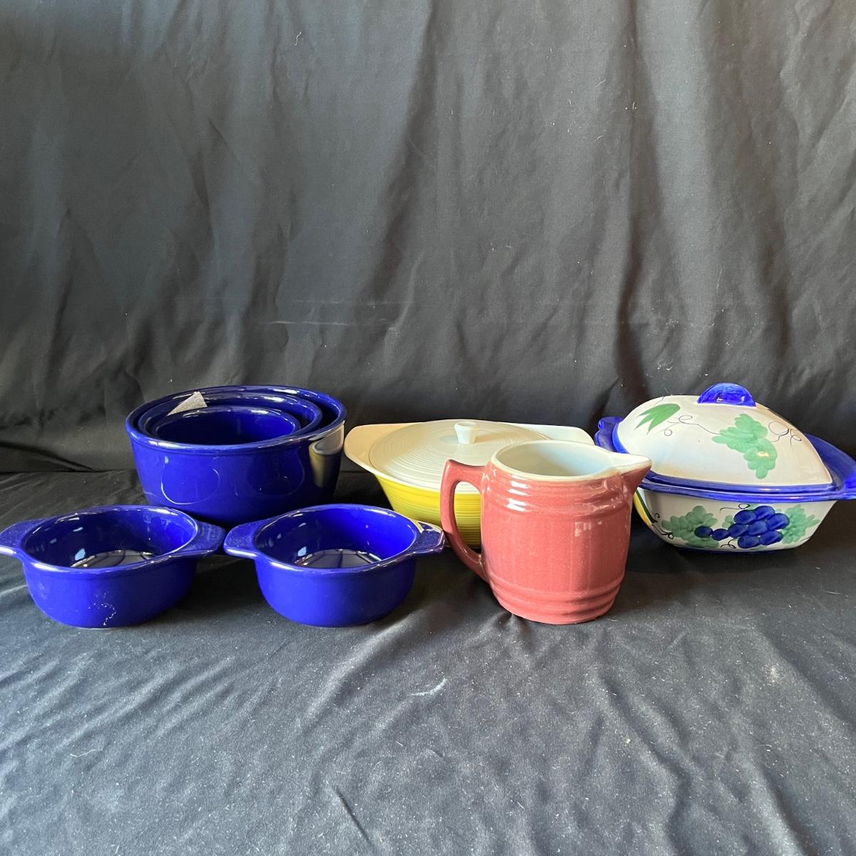 Lot includes a floral design Solimene Vietri dish with lid, three nesting bowls and two bowls by Chantal, an unmarked pitcher and dish with lid. Solimene dish with lid measures 10” x 10” x 7.5”.