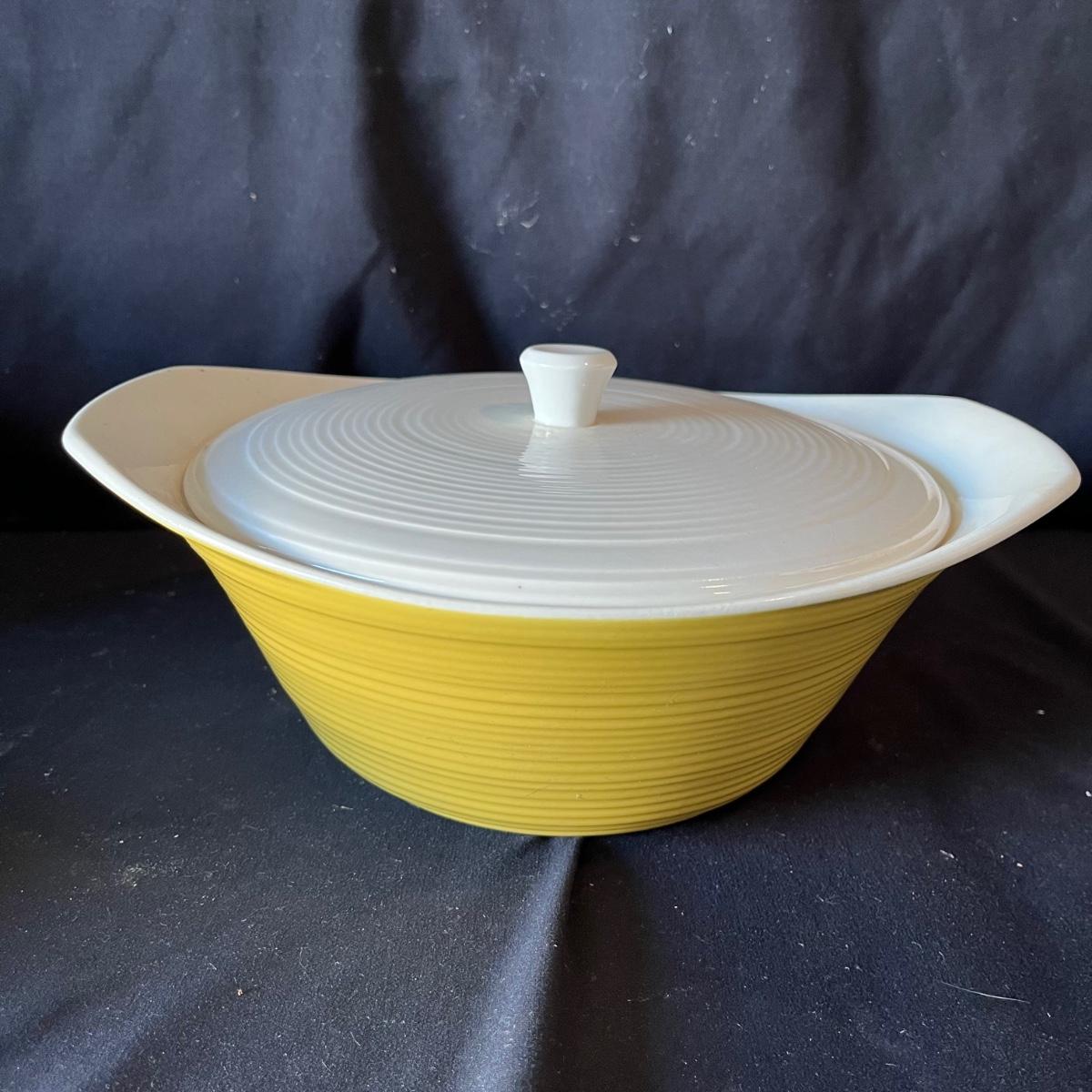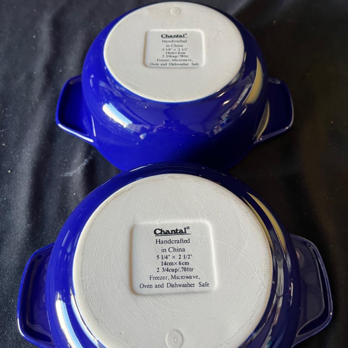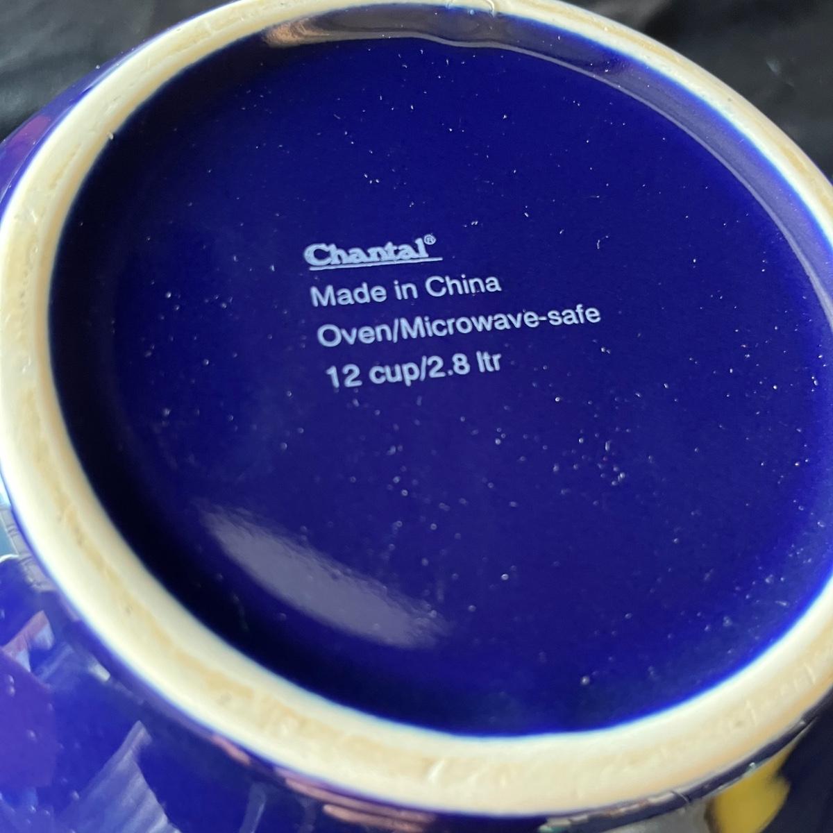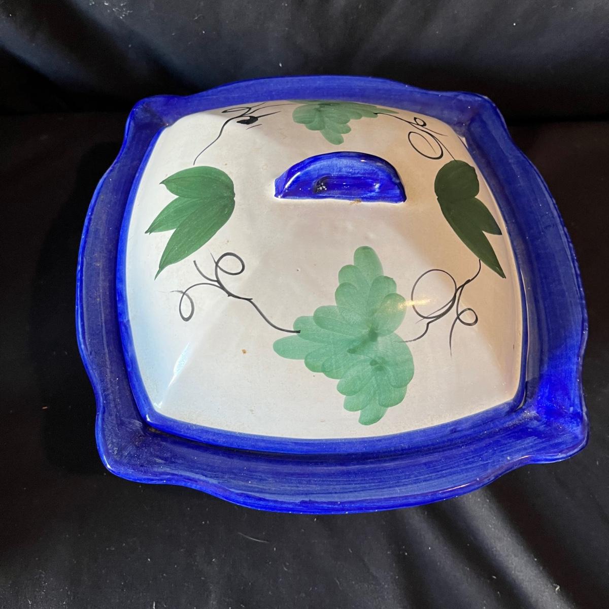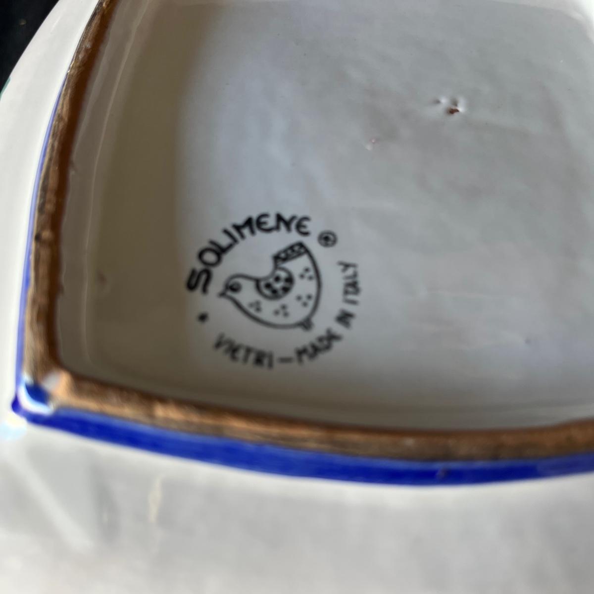 Lot includes a floral design Solimene Vietri dish with lid, three nesting bowls and two bowls by Chantal, an unmarked pitcher and dish with lid. Solimene dish with lid measures 10” x 10” x 7.5”.