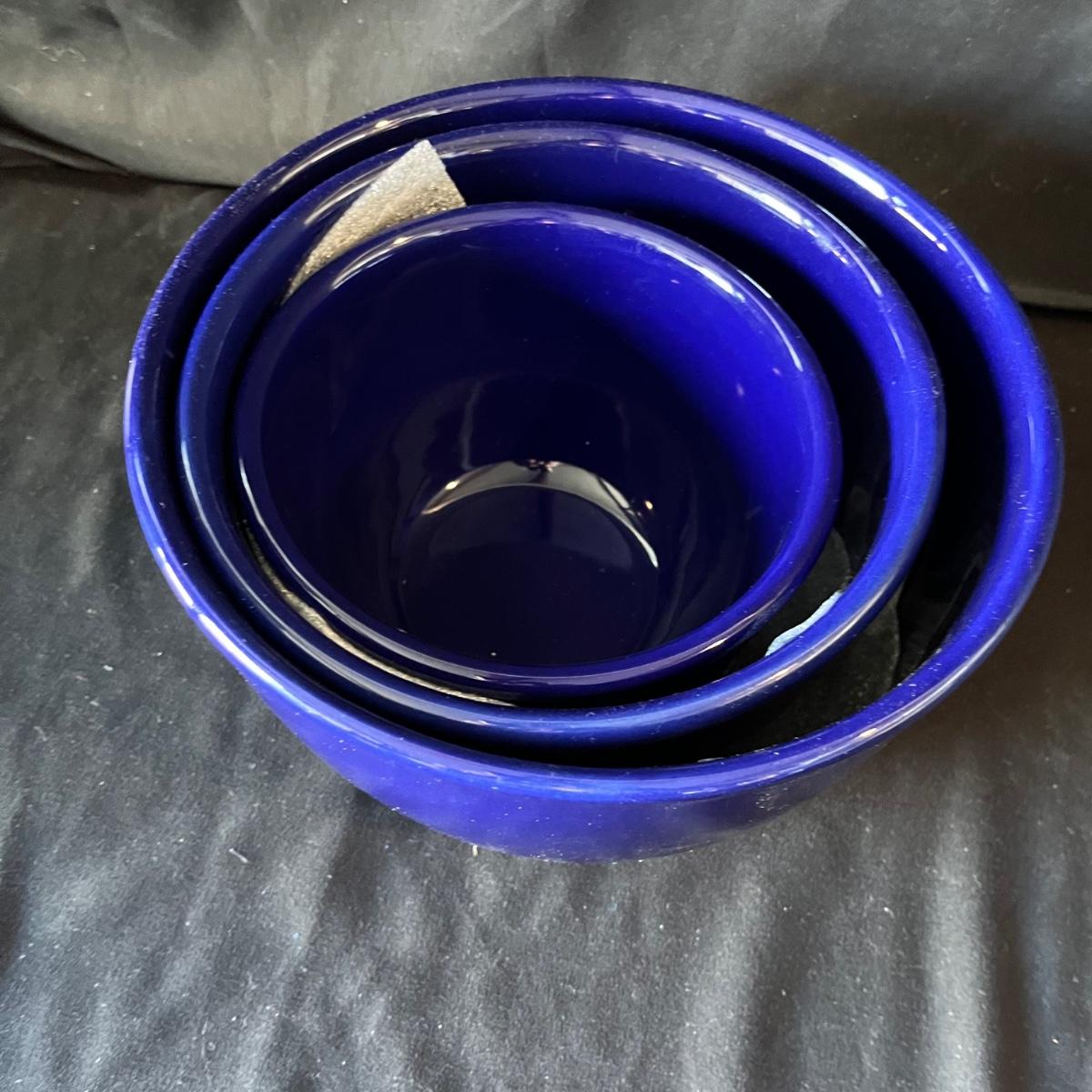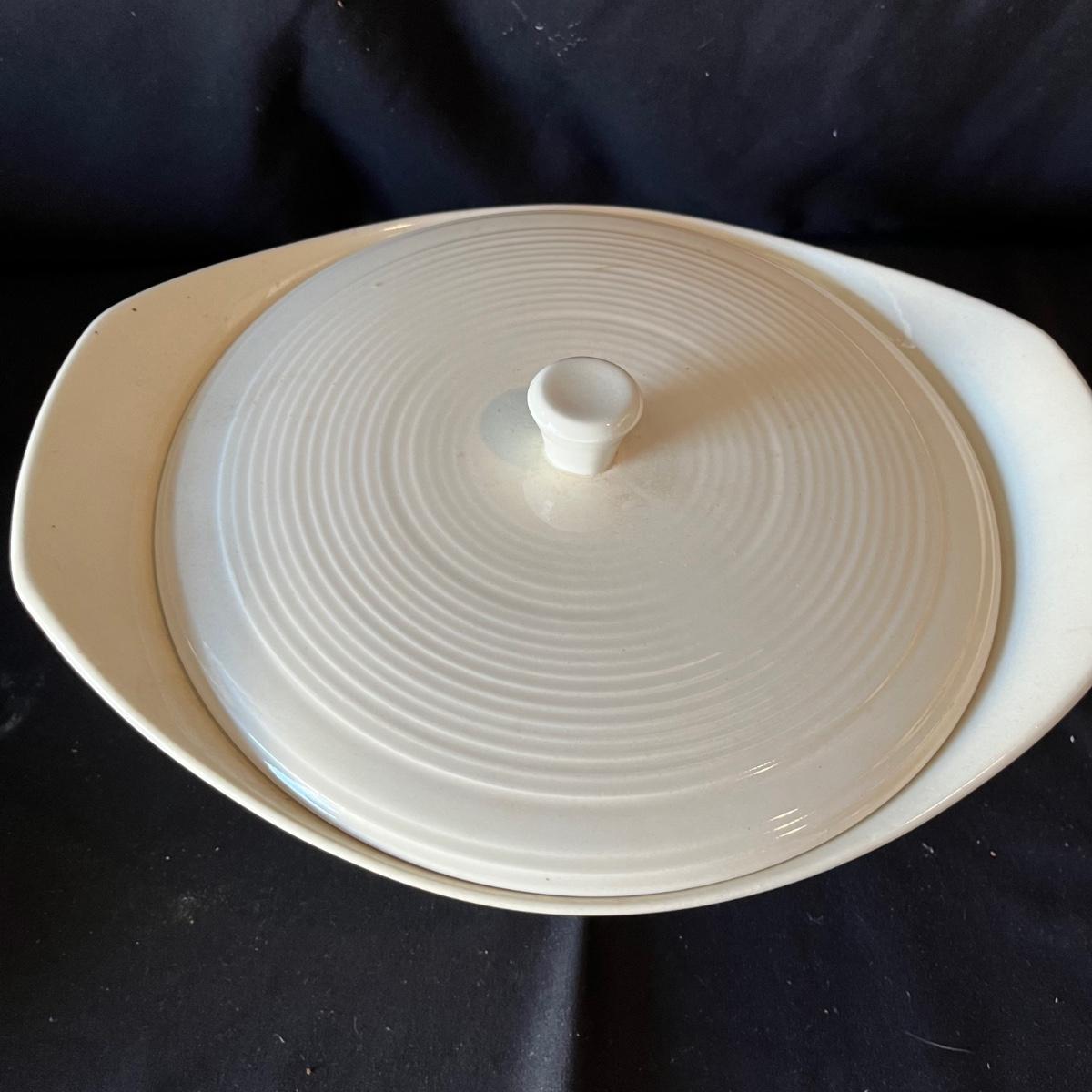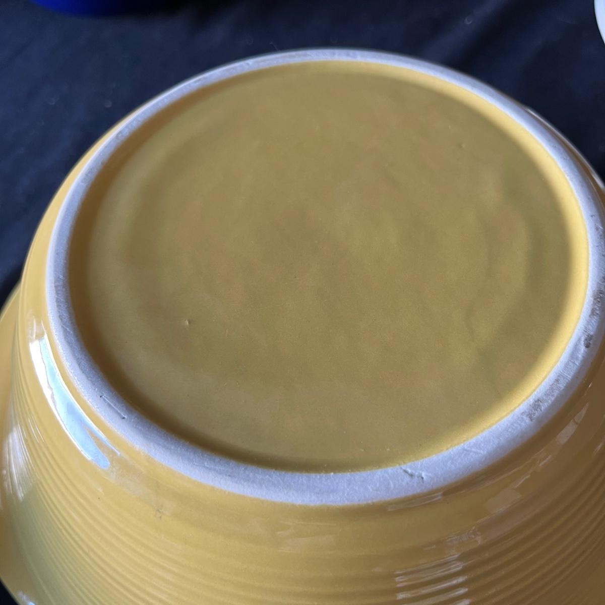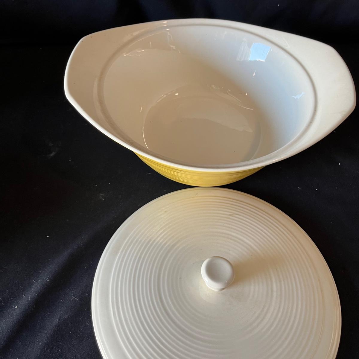 Lot includes a floral design Solimene Vietri dish with lid, three nesting bowls and two bowls by Chantal, an unmarked pitcher and dish with lid. Solimene dish with lid measures 10” x 10” x 7.5”.