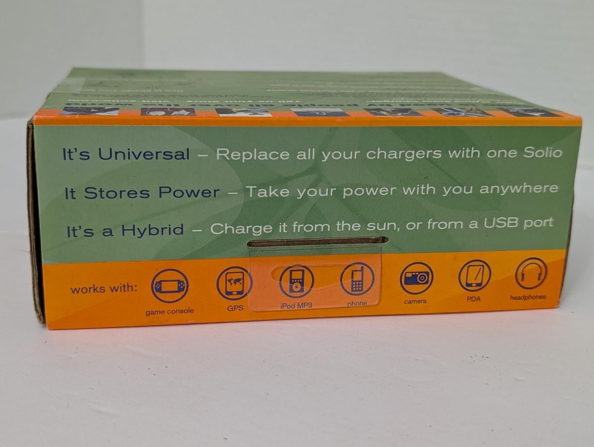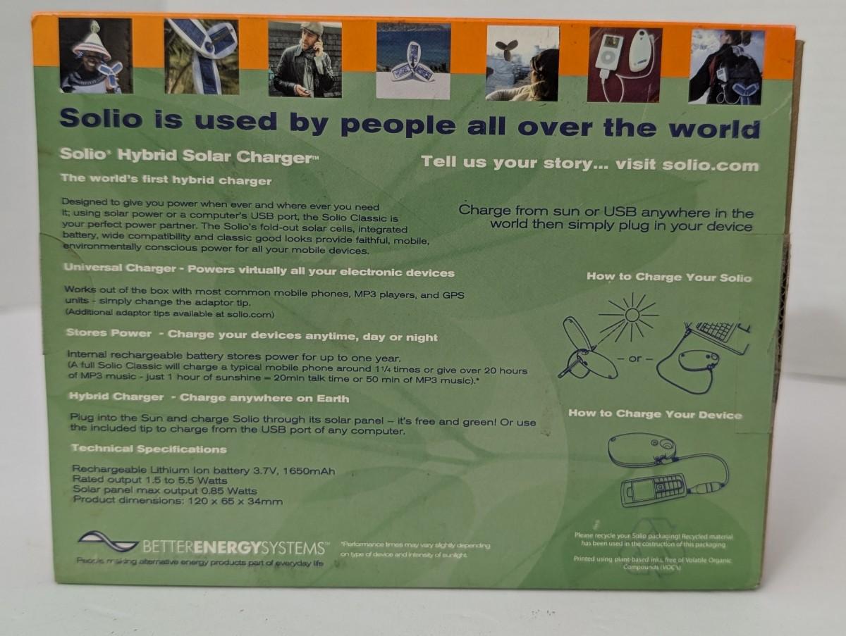 Solio Classic Hybrid Solar Charger by Better Energy Systems, the world’s first hybrid solar charger for electronic devices. Charges via sunlight or USB and stores power for up to one year with its 3.7V 1650mAh lithium-ion battery. Compatible with most mobile phones, MP3 players, and GPS units using adaptor tips. Box shows light wear. Ideal for eco-friendly travelers or emergency preparedness kits.