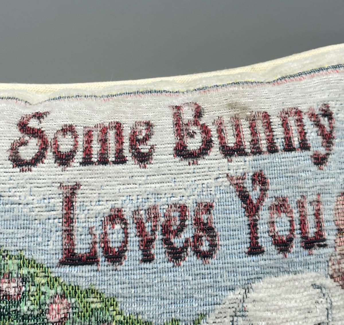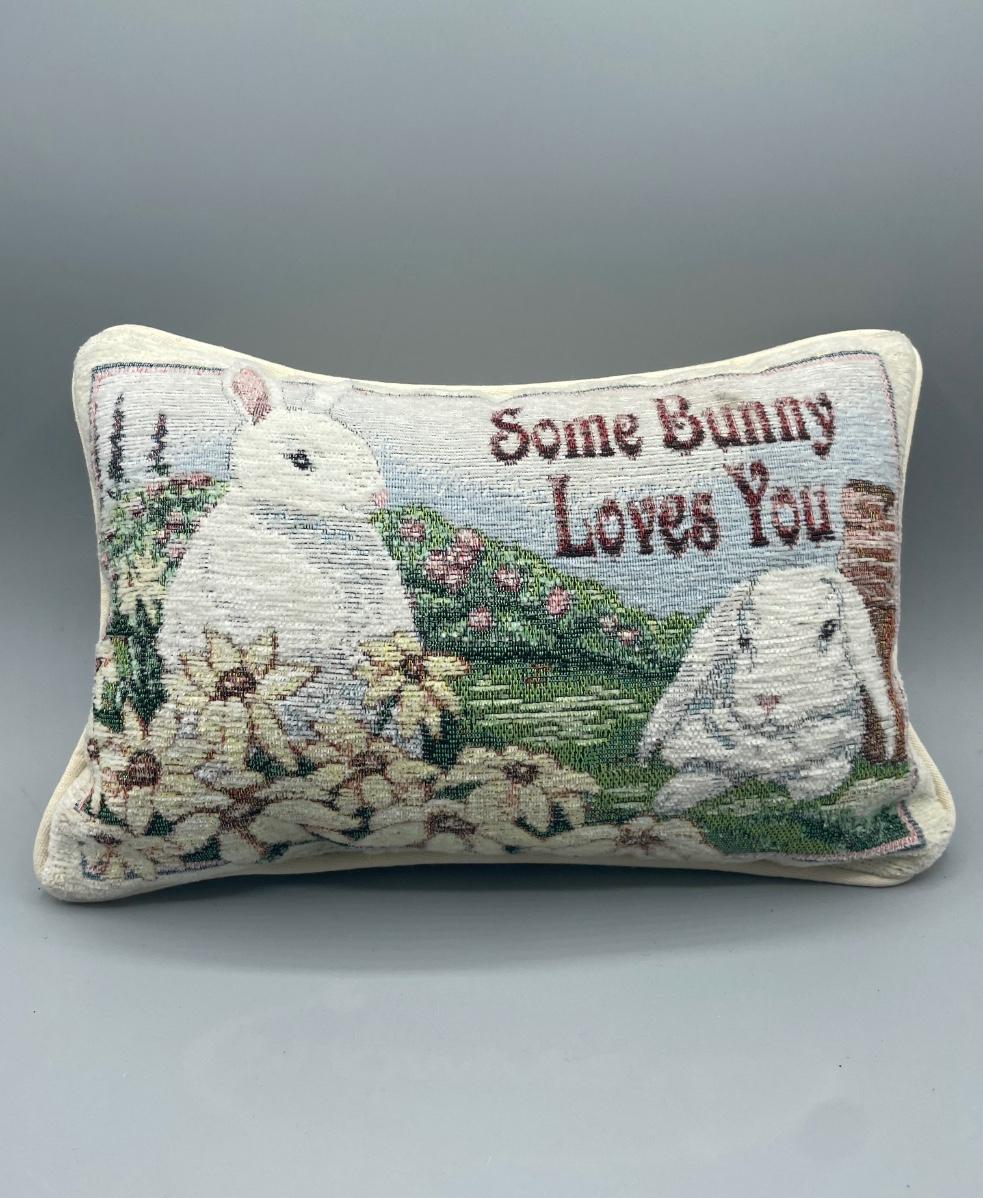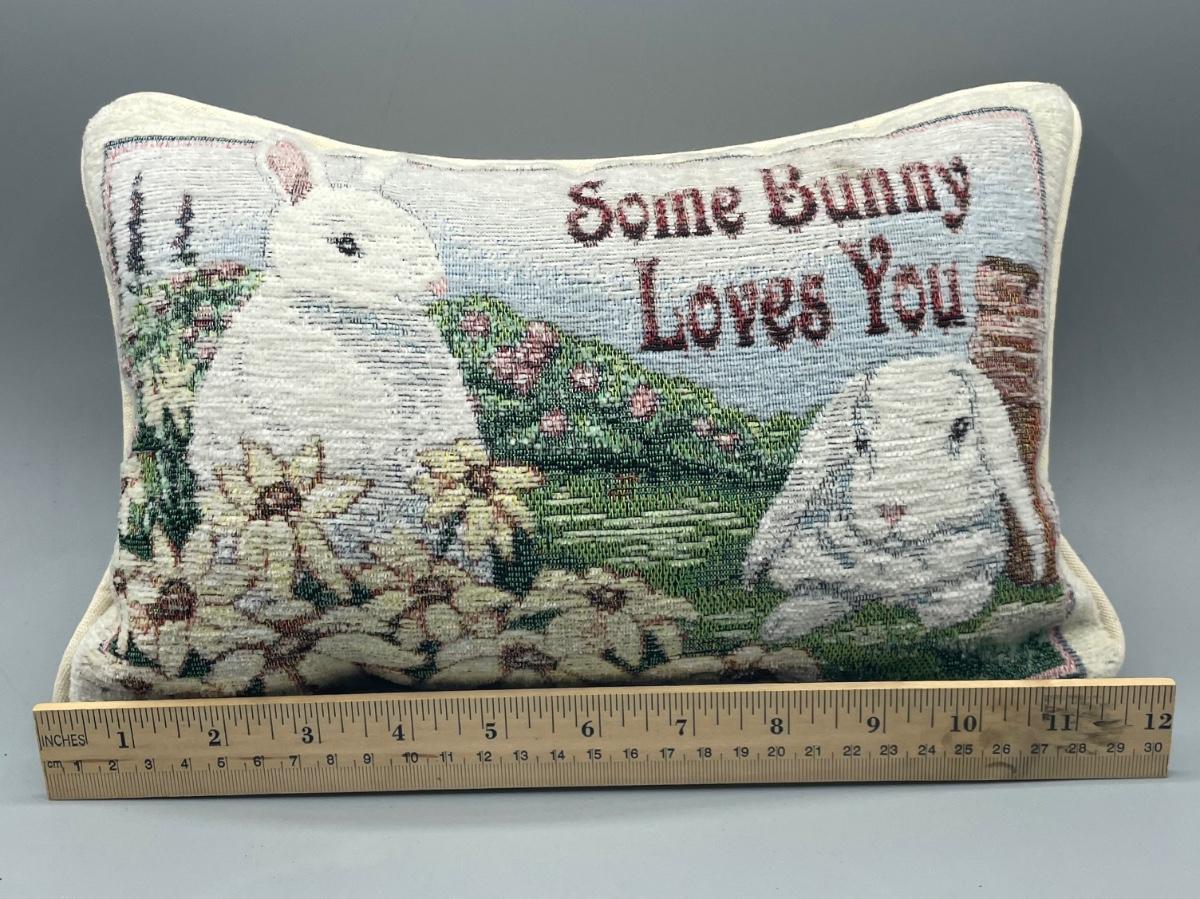 This throw pillow is in amazing condition and has no noticeable damages to it. The front reads: “Some Bunny Loves You.” It’s approximately 12” wide.