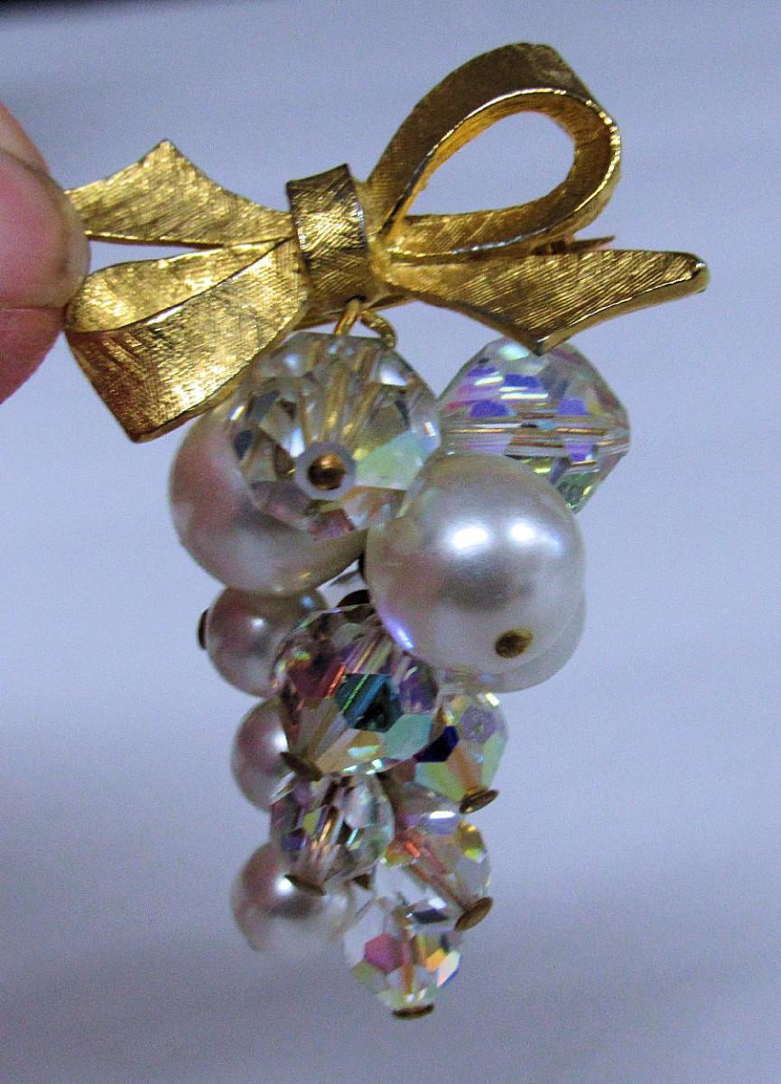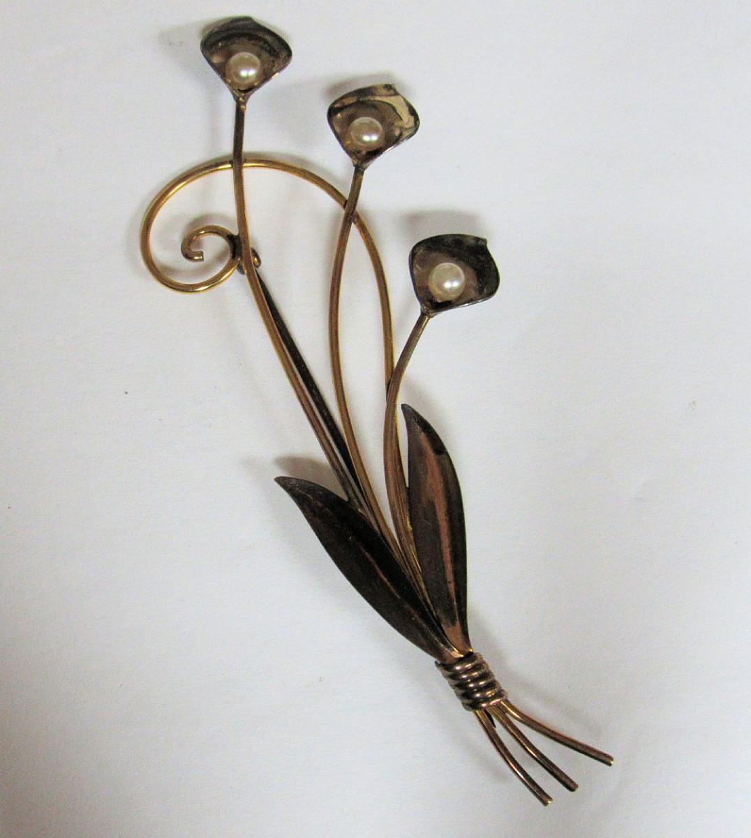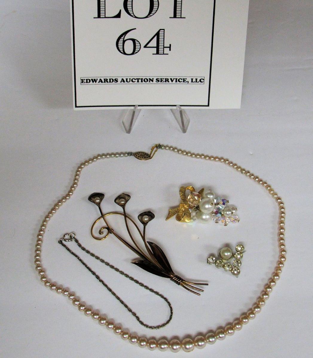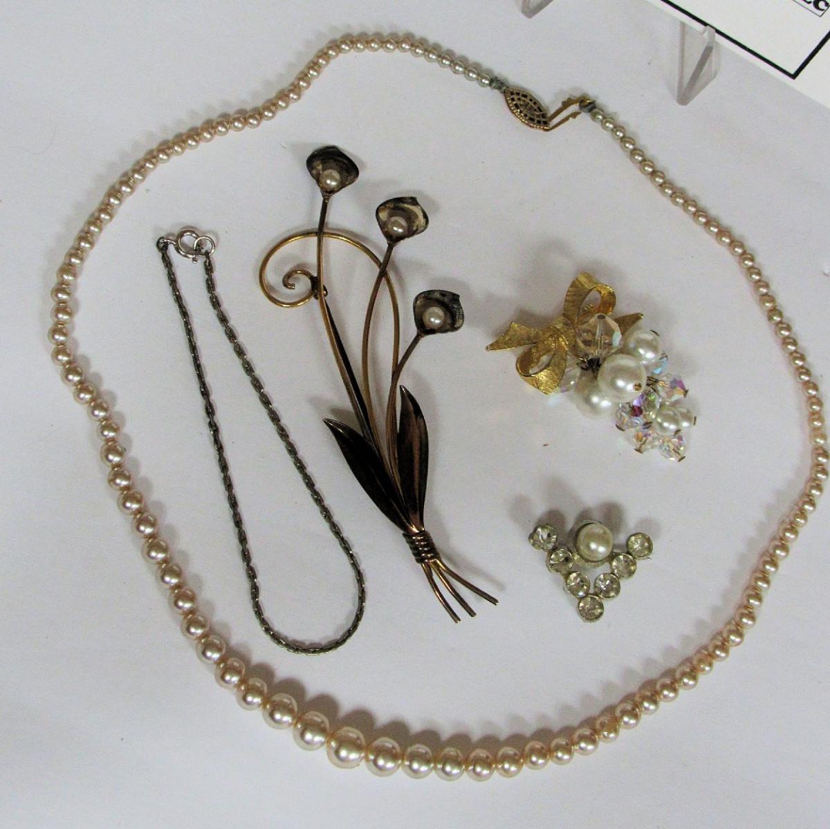 The pin is very pretty with faux pearls and I think it is marked Van Del, 1/20 12K GF on Sterling. The bracelet is silvertone 1/20 12K GF, the rhinestones are nice. Faux pearl necklace appears fine. Some jewelry needs a very good cleaning. We did not check stones for chips or looseness. Shipping is available at shipping cost plus $5.00 handling fee on one box, $10.00 handling fee on two boxes, $15.00 handling fee on 3 boxes. Helps cover shipping materials and labor cost.