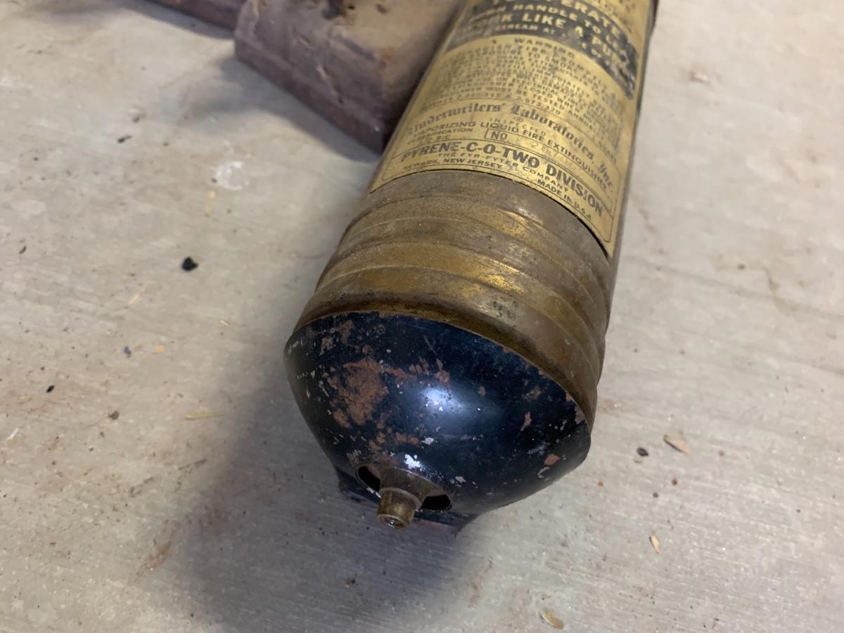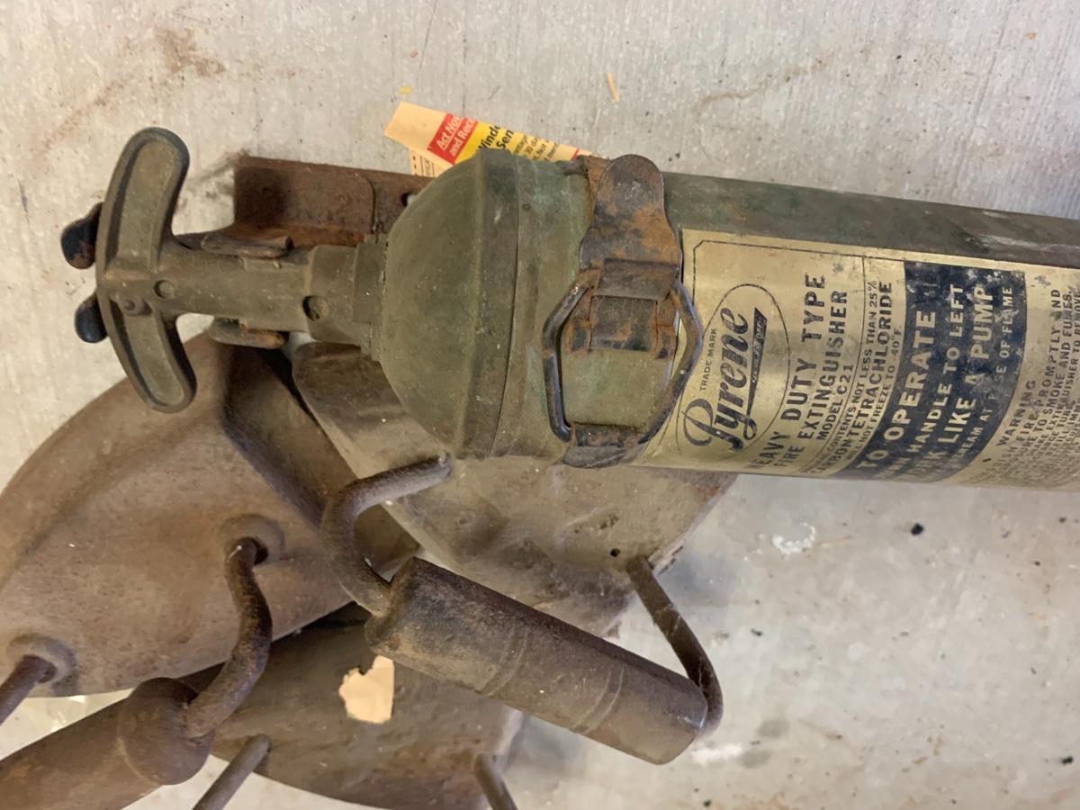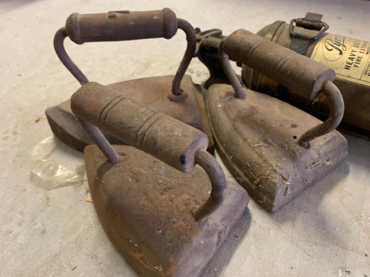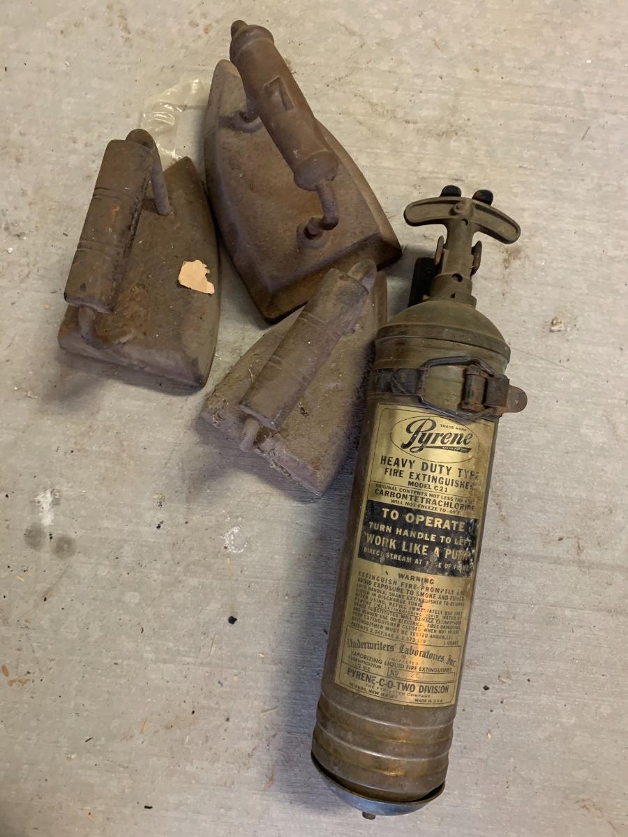 Lot includes 3 antique irons and a vintage fire extinguisher. All in great rusty condition!