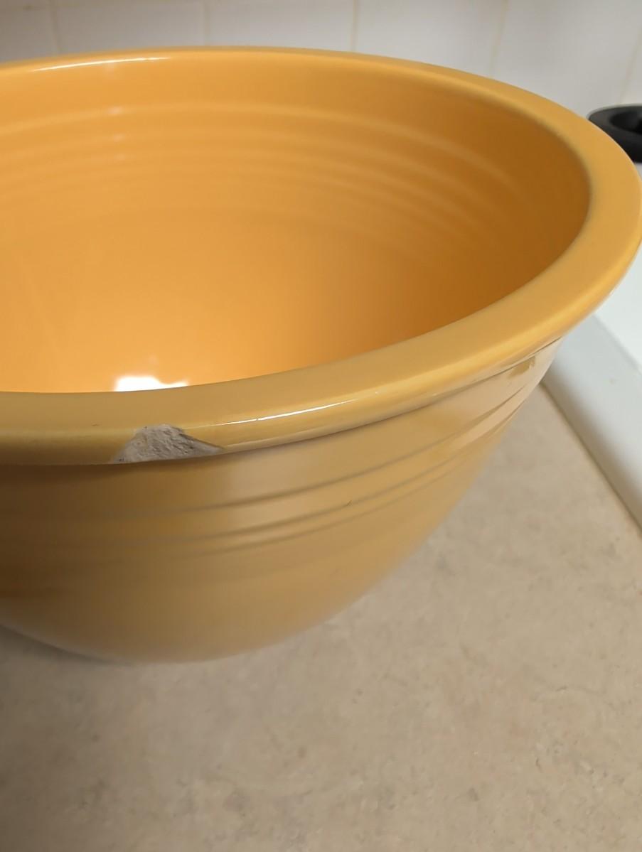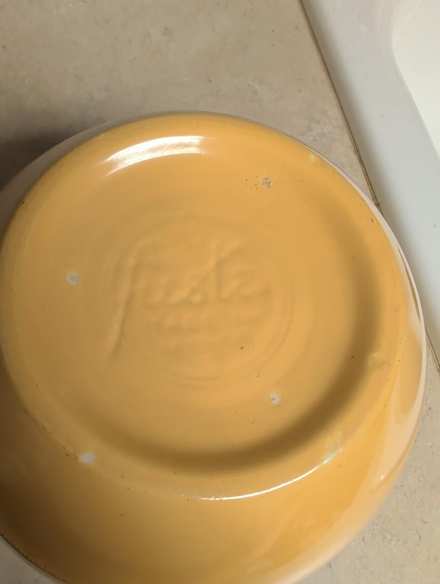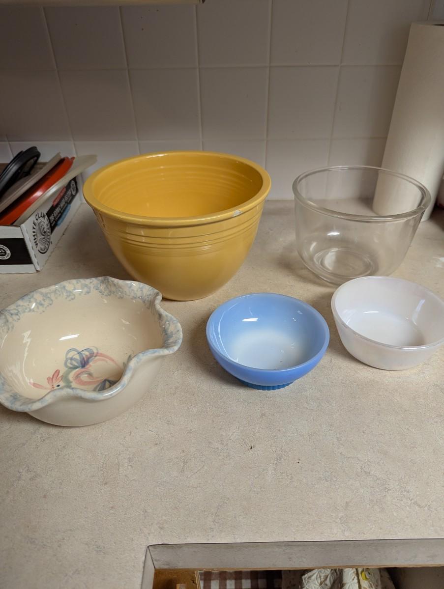 Fiesta gold, does have a chip, (look at pictures) heart bowl handcrafted pottery, clear glass mixing bowl, small blue Anchor Hocking, small iridescent bowl USA.
