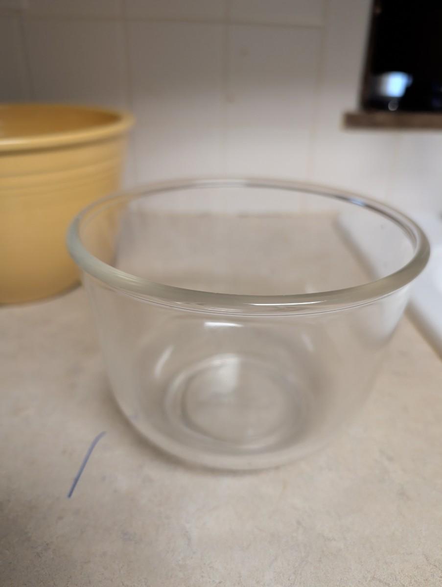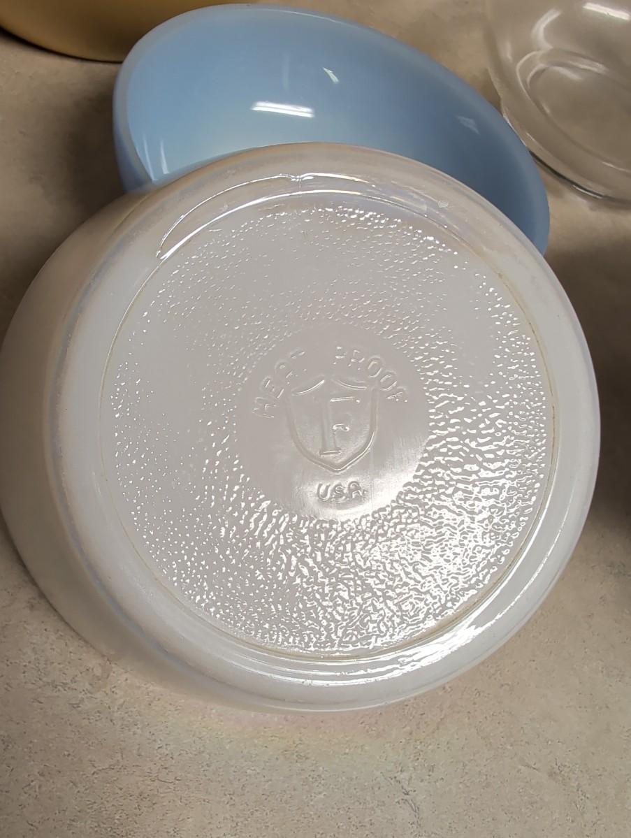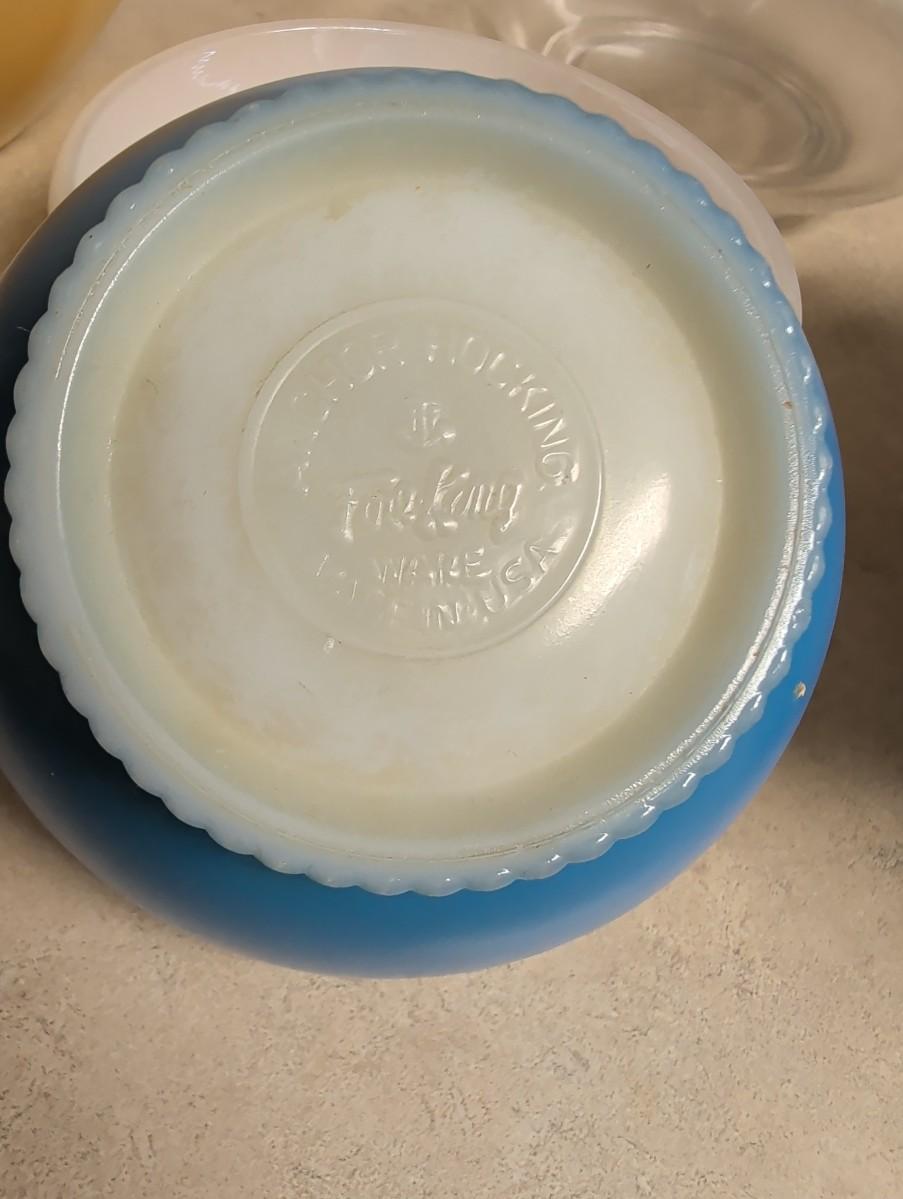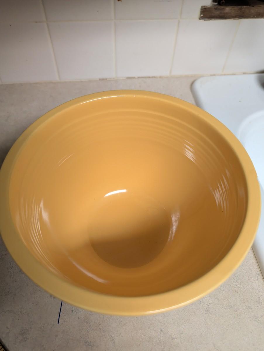 Fiesta gold, does have a chip, (look at pictures) heart bowl handcrafted pottery, clear glass mixing bowl, small blue Anchor Hocking, small iridescent bowl USA.