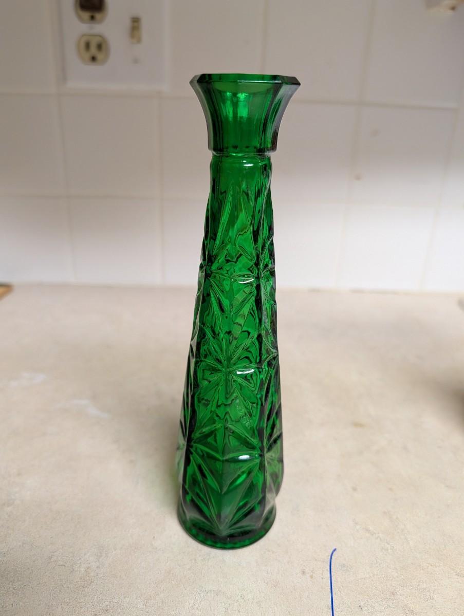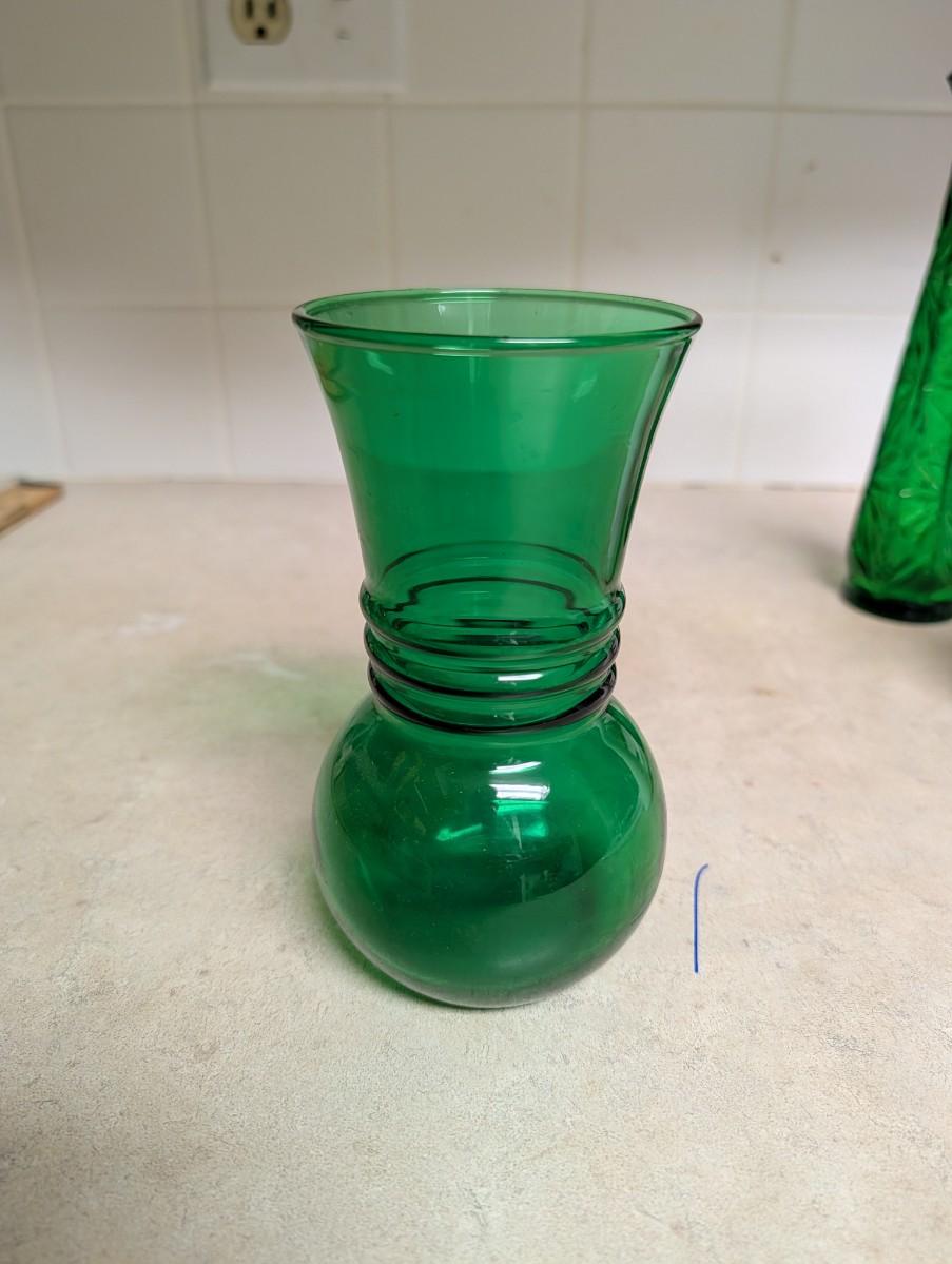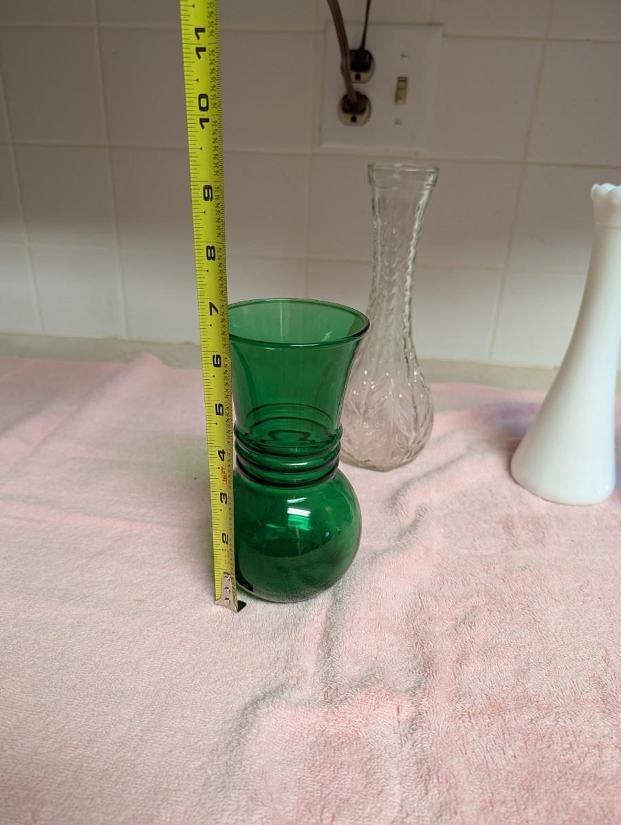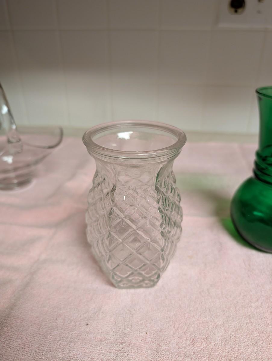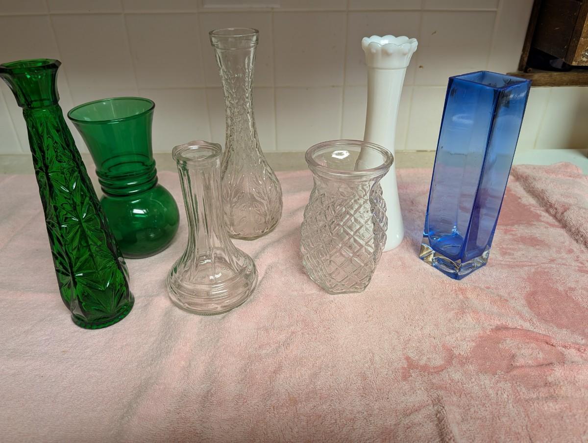 Milk glass bud vase, vintage green starburst vase, vintage green Anchor Hocking vase, clear molded pineapple short vase, CFG clear glass vase, FTD clear vase vine design, mid century blue square vase 1960's.