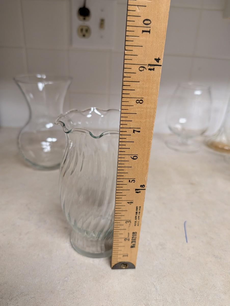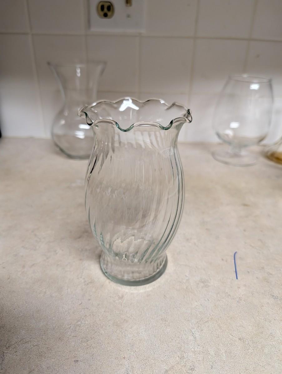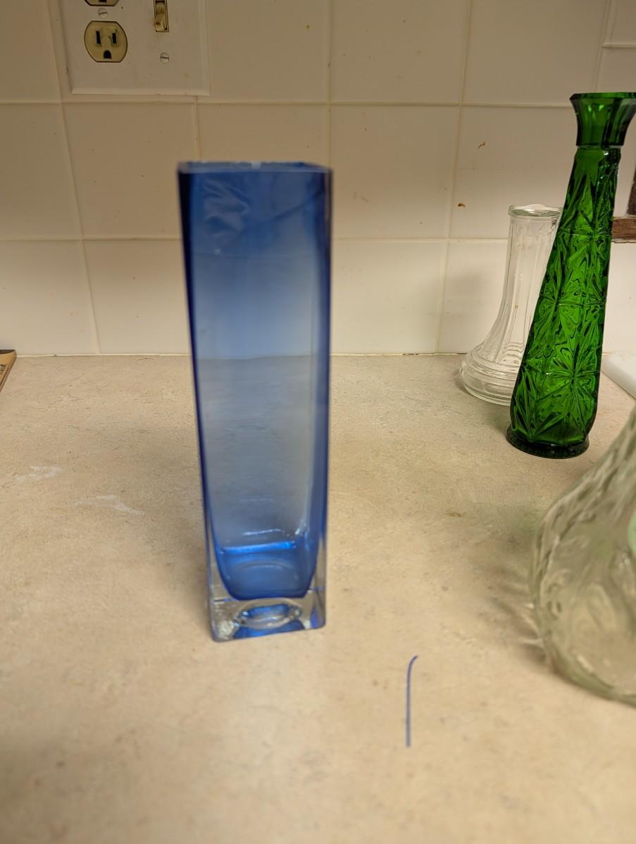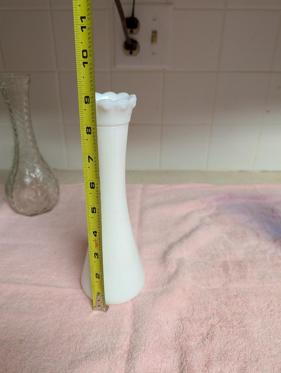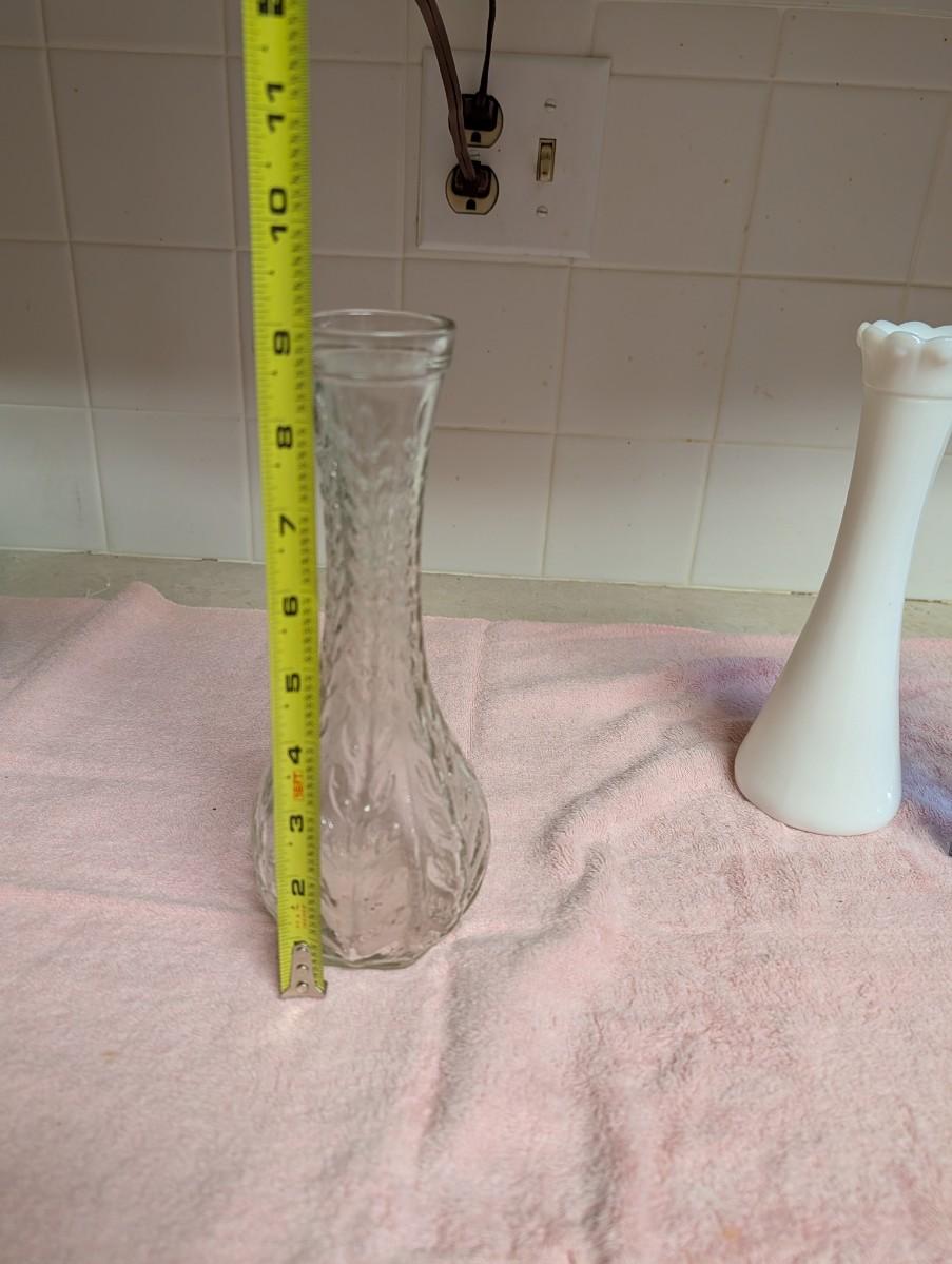 Milk glass bud vase, vintage green starburst vase, vintage green Anchor Hocking vase, clear molded pineapple short vase, CFG clear glass vase, FTD clear vase vine design, mid century blue square vase 1960's.
