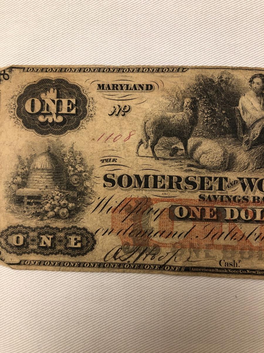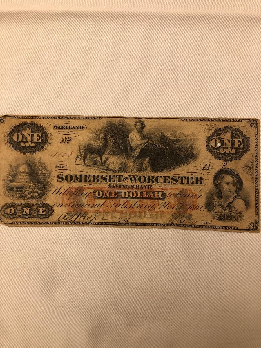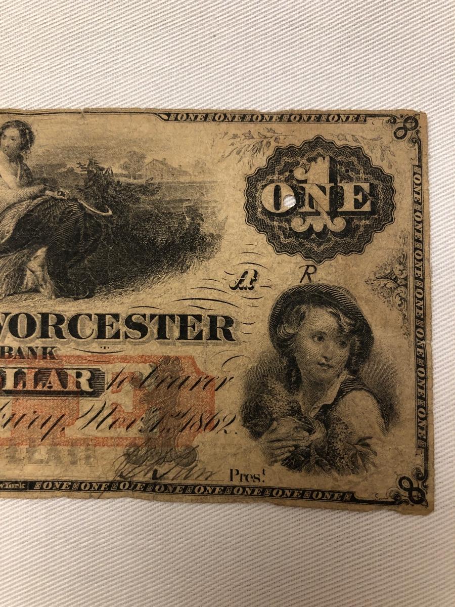 Civil War era paper $1 bill. Dated 1862, this bill is number 1108 with two ink signatures. Good condition.
