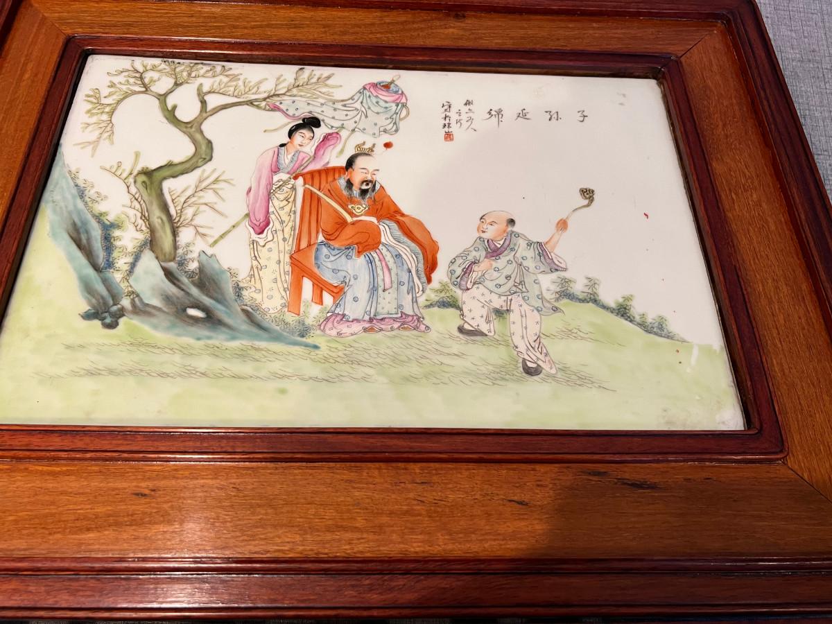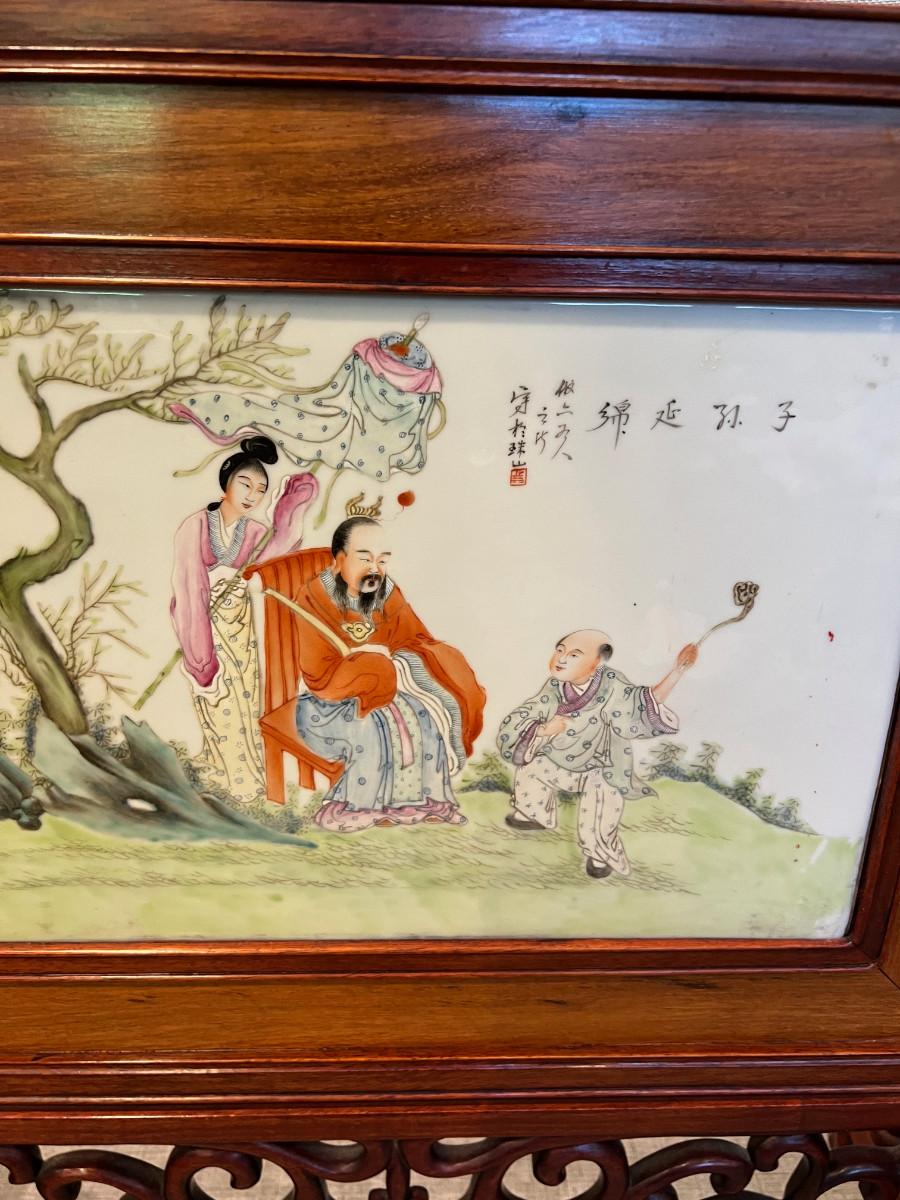 19th century antique Asian/Chinese tile screen. Excellent condition, no wear or damage. Hand made wood easel type frame, with tile set into it, fretwork design across bottom of stand. 19th century perhaps older, awesome piece. frame is 18" by 13". I was unable to translate the Chinese characters in the text, if you are able please let us know?