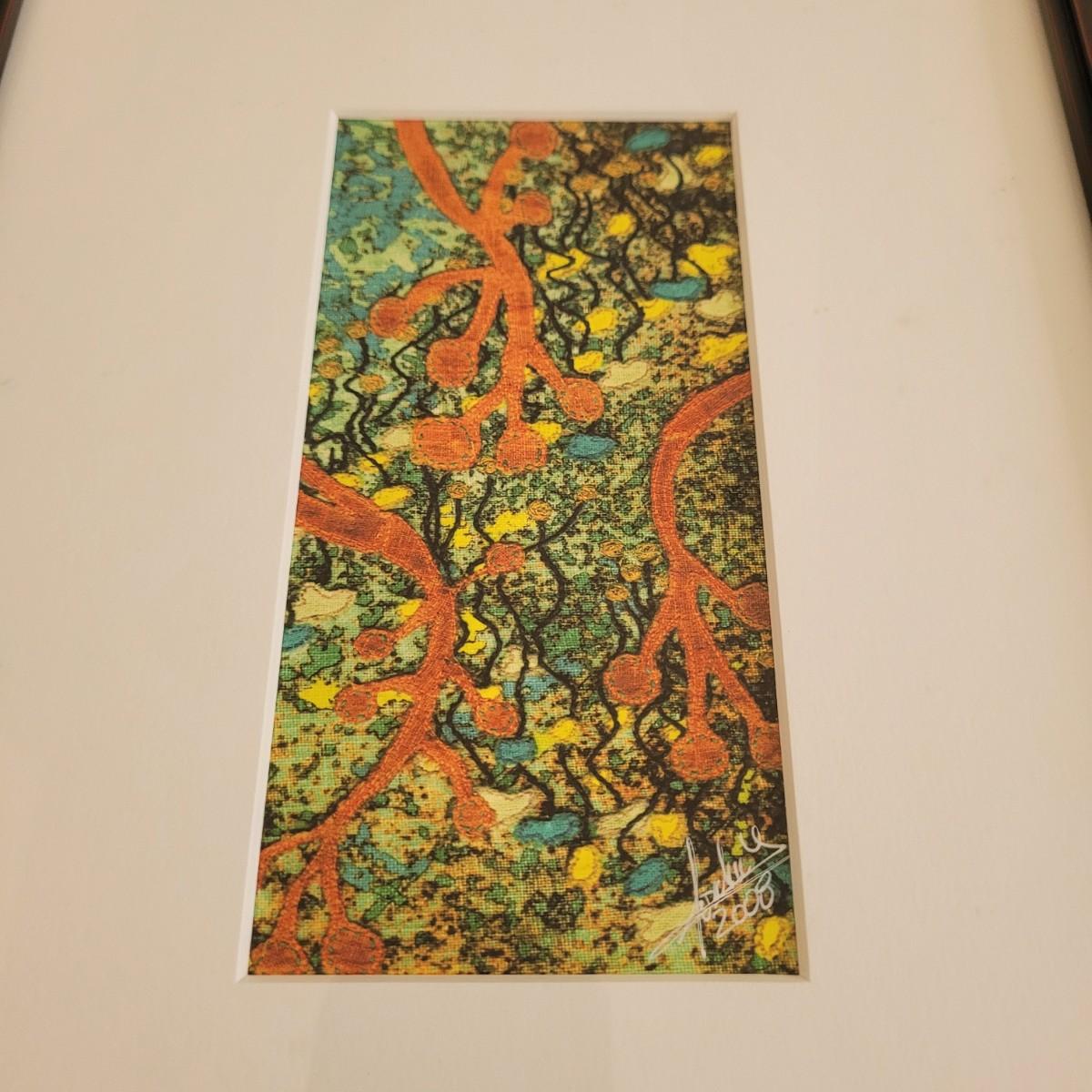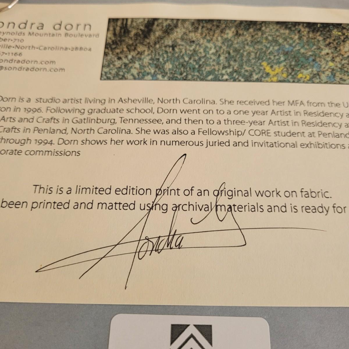This lot includes an original print of a piece by Asheville, NC local artist Sondra Dorn. Paperwork states it is a limited-edition print of an original piece on fabric. It is signed by the artist on the print itself and the certificate on the back. It is matted, under glass, and framed in wood. The frame measures 9" x 11".