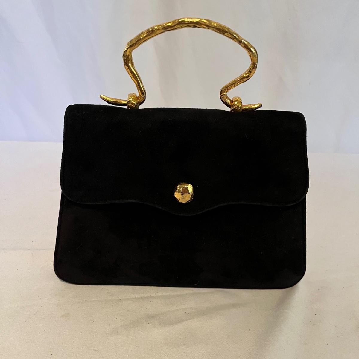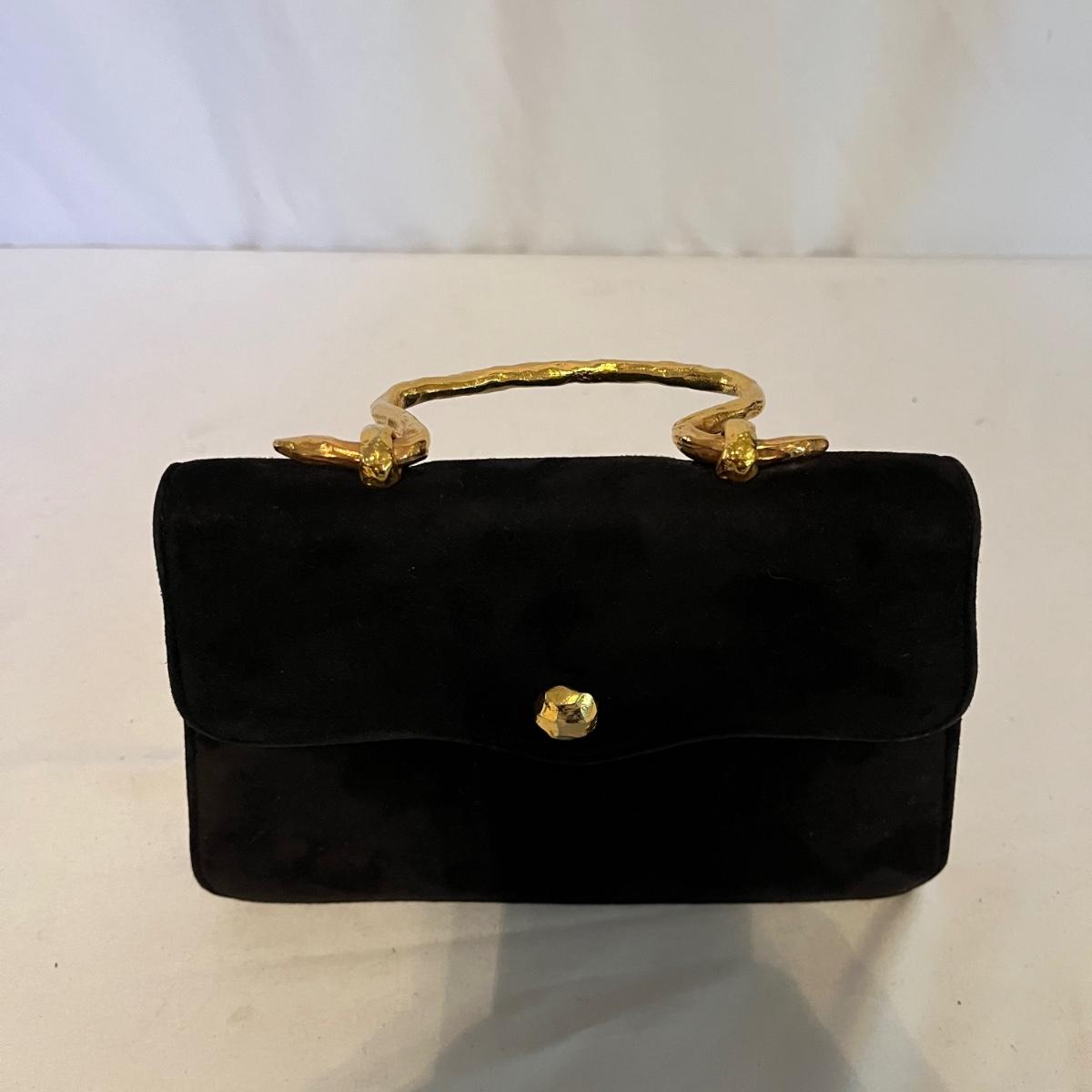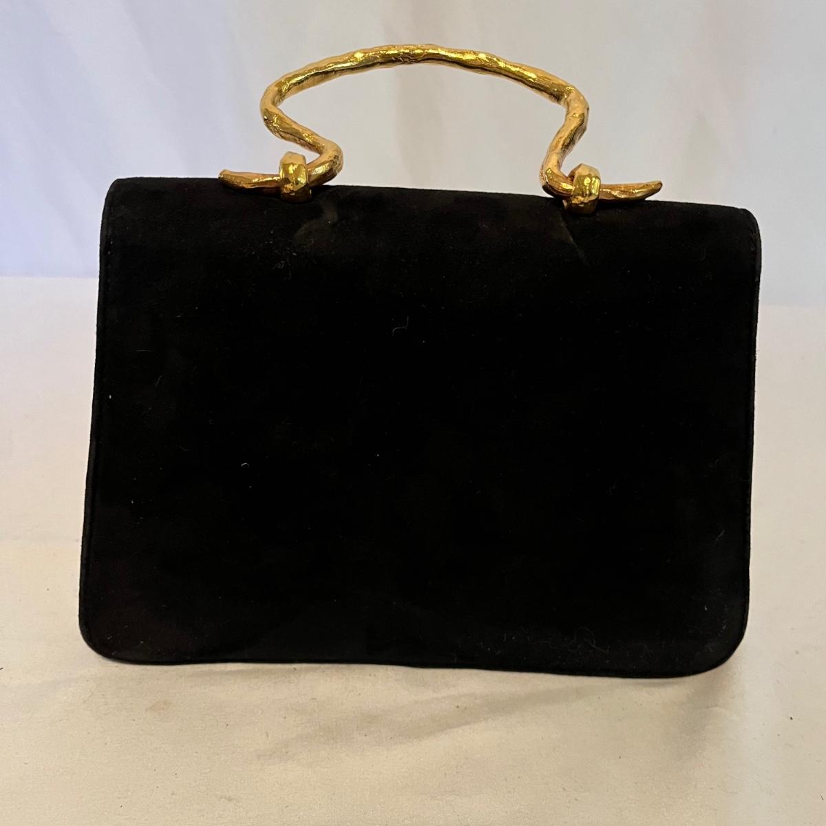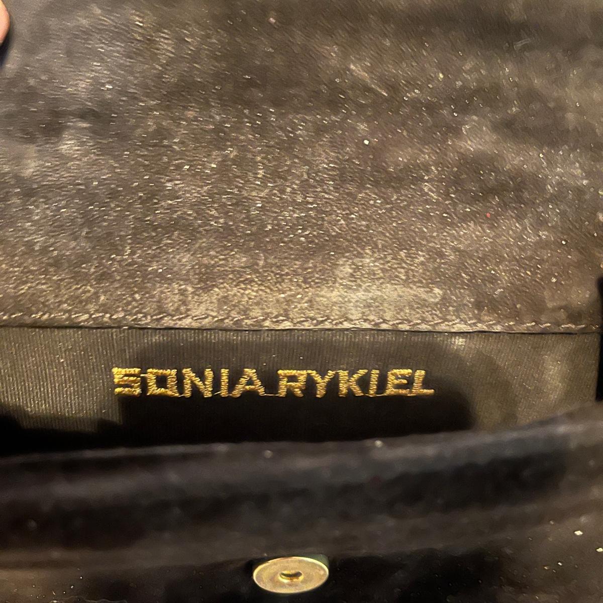 Lot includes a black suede Sonia Rykiel handbag with metal handle. Bag measures 1.5” x 8.75” x 6.5” not counting handle.