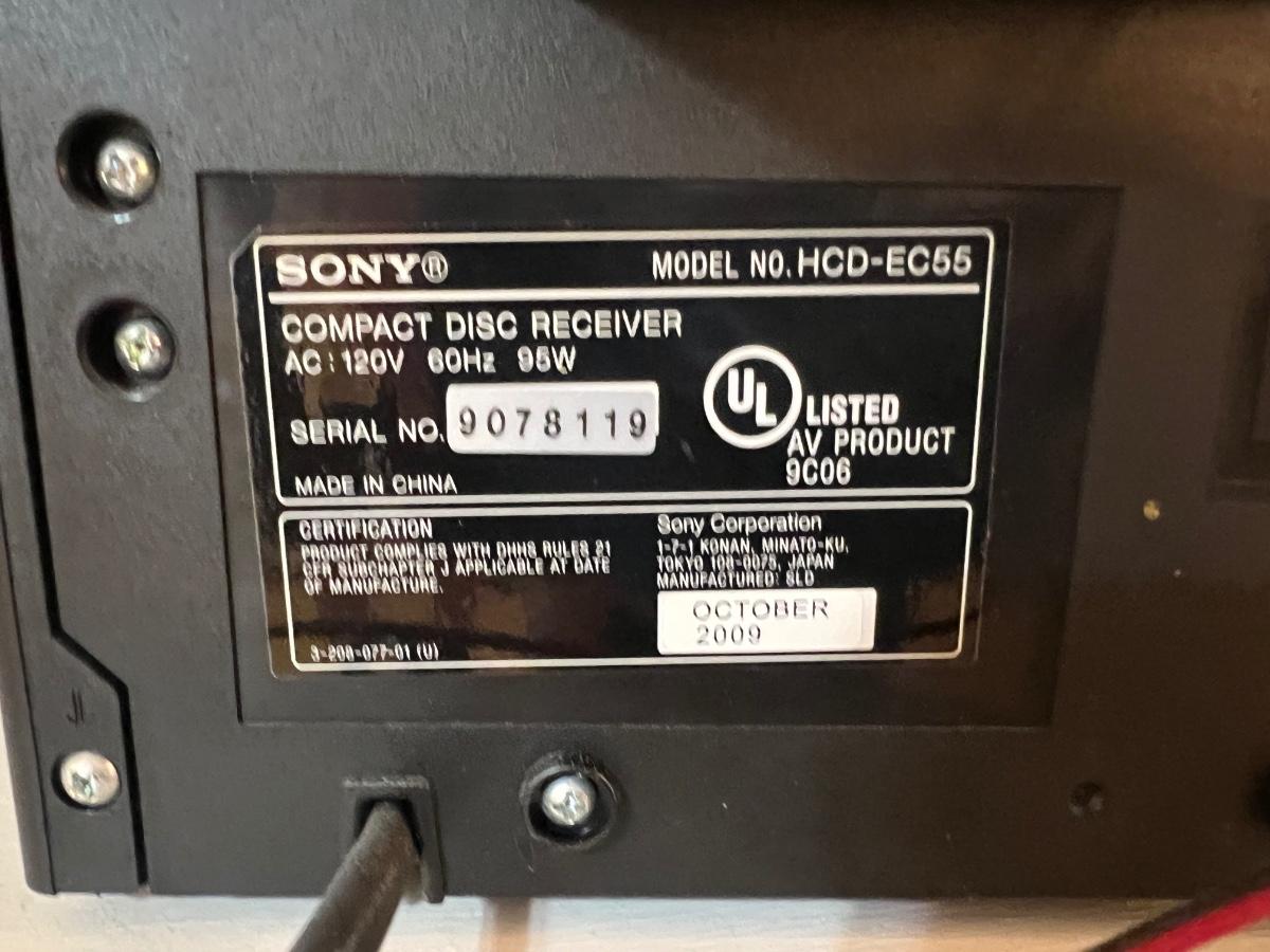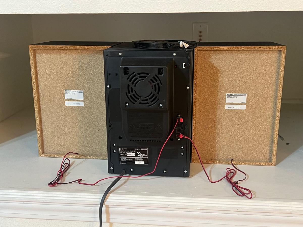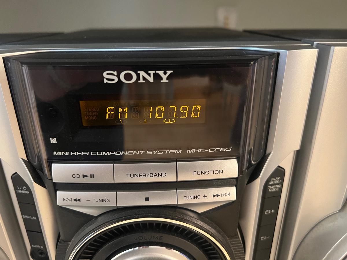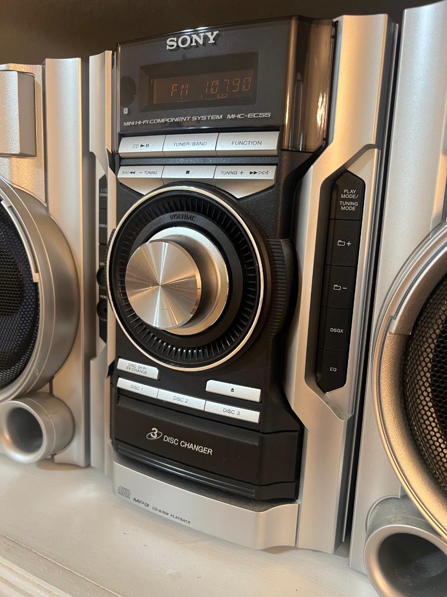 Model MHC-EC55. Tested and works as it should. 25in. wide and 12in. tall. Middle is 8-1/2in. wide and speakers are 8in. wide by each.