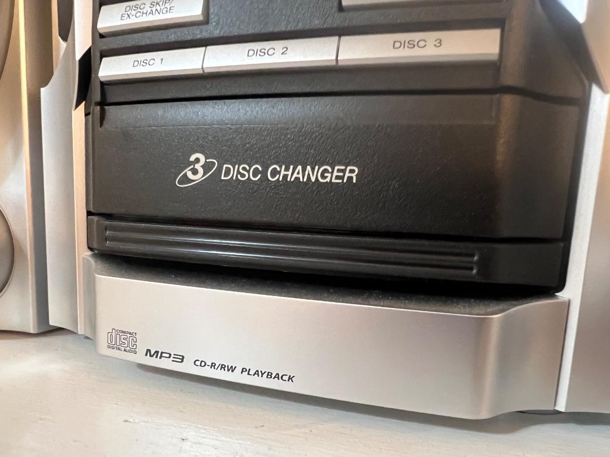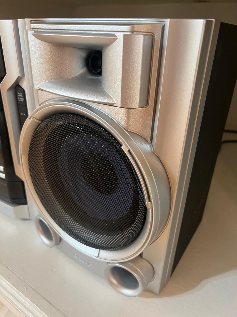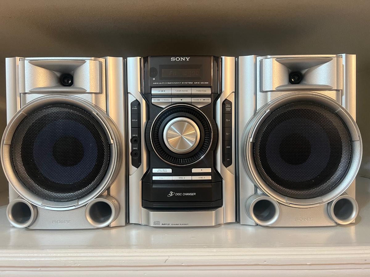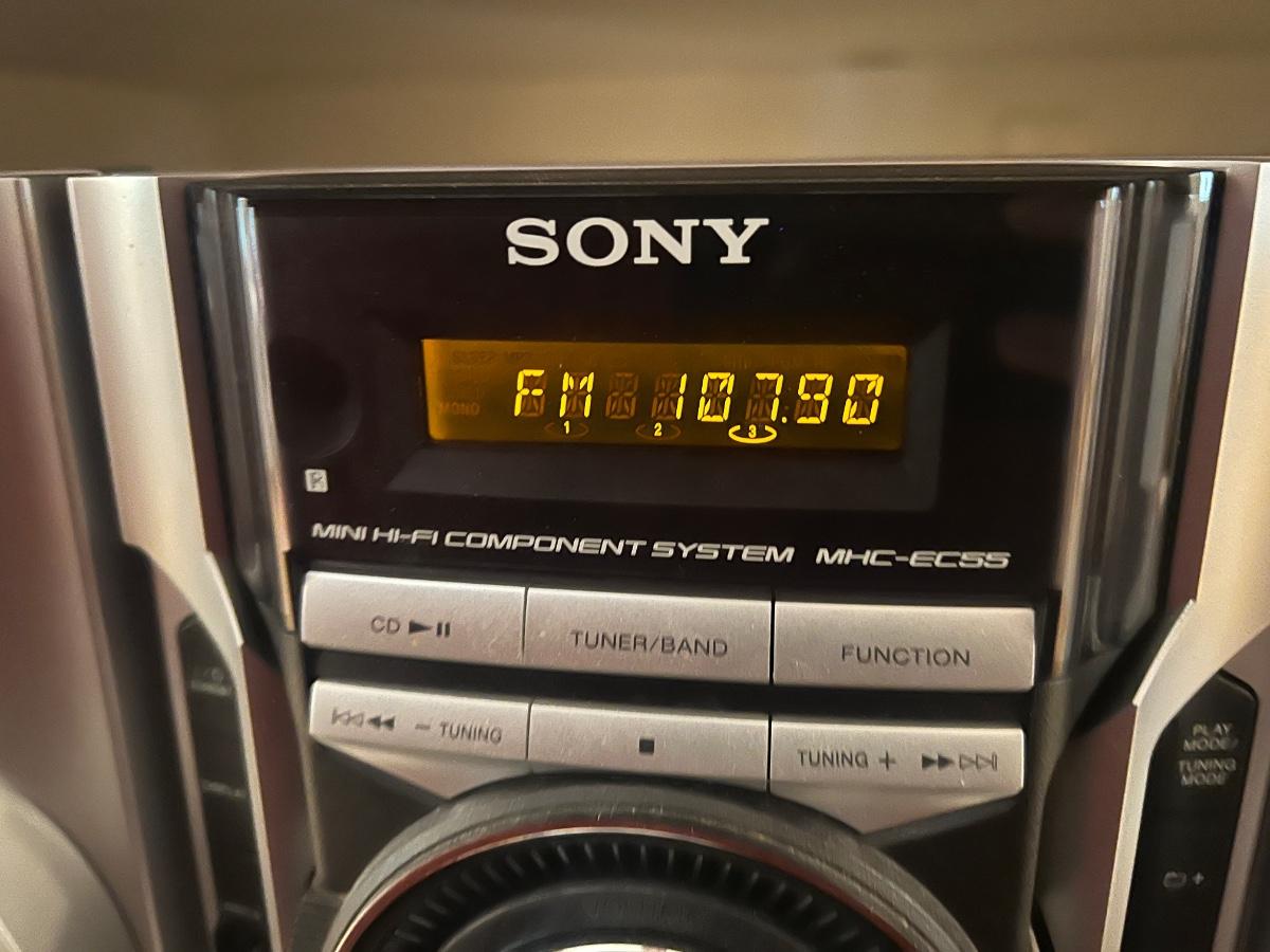 Model MHC-EC55. Tested and works as it should. 25in. wide and 12in. tall. Middle is 8-1/2in. wide and speakers are 8in. wide by each.
