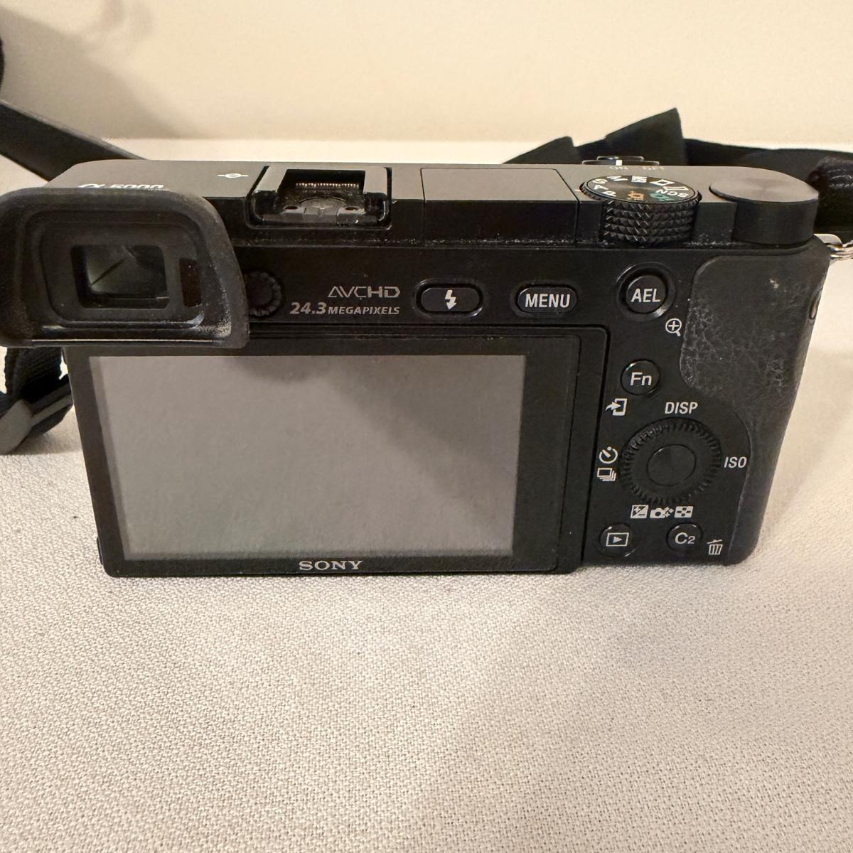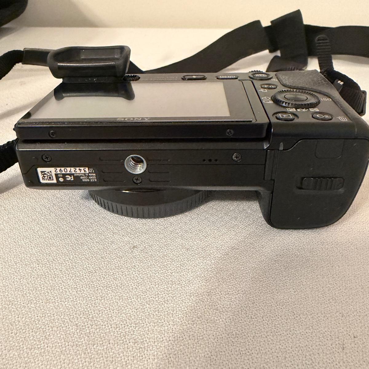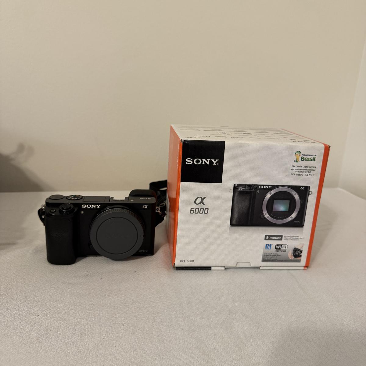Lot includes a Sony A6000 camera body with original box. Also includes Lowepro bag, flash, four batteries, charger, remote and more.