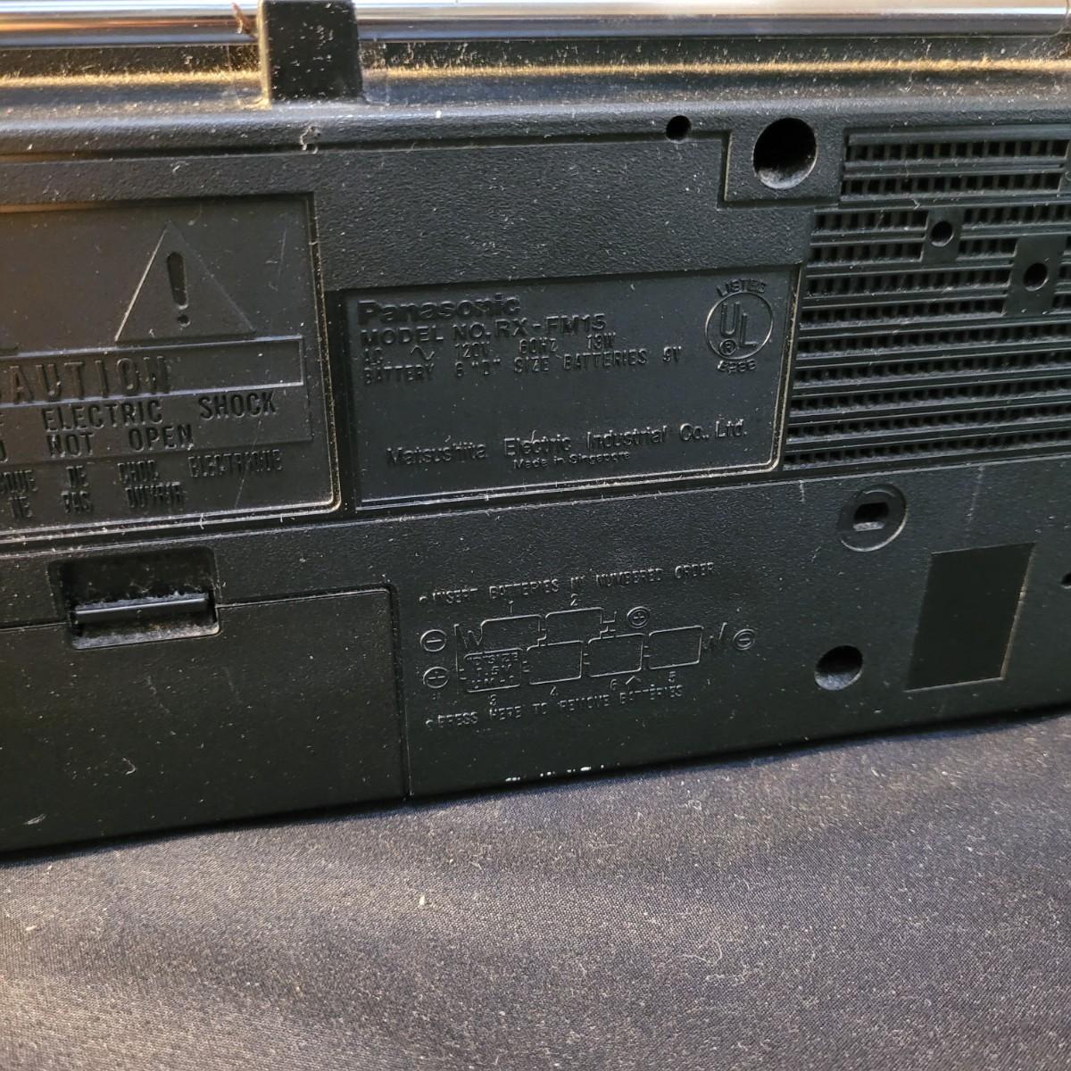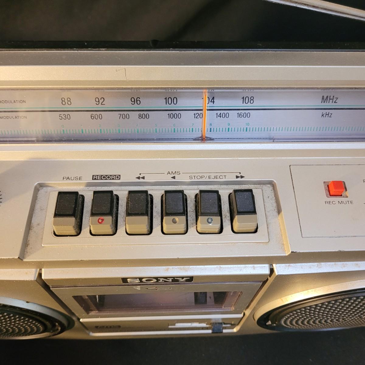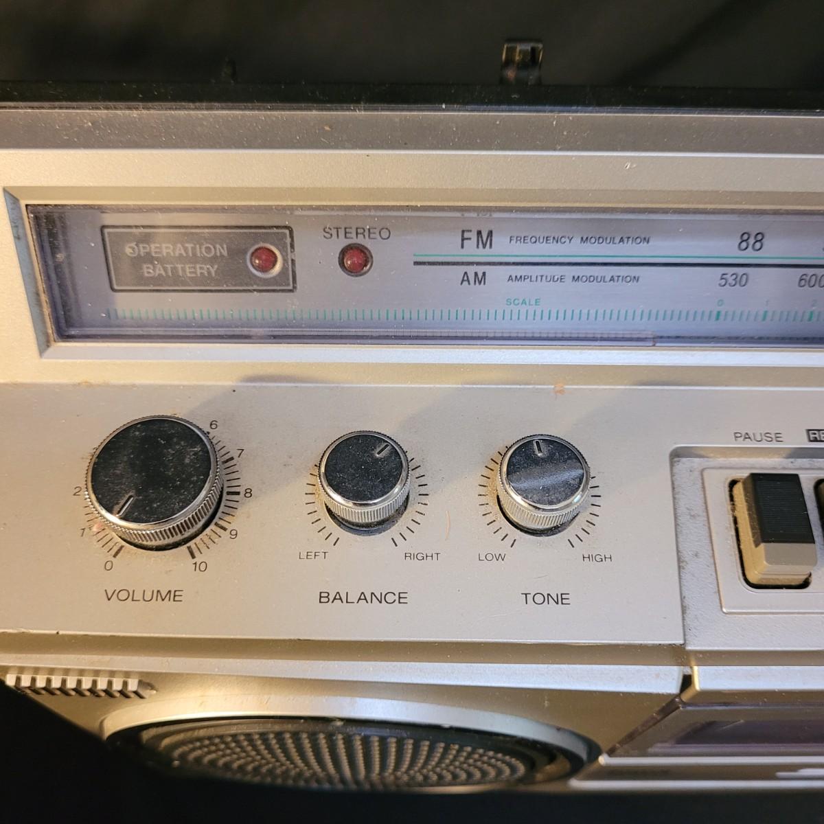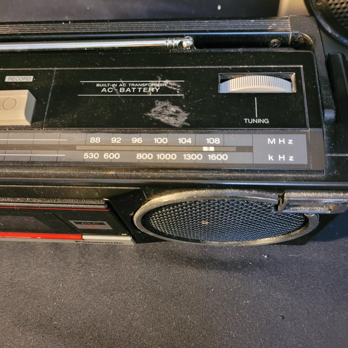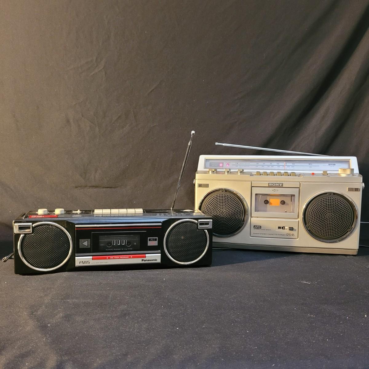 Two retro boomboxes by Sony and Panasonic. Radio played on both when powered on, but cassette players did not play when tested. Sony handle is damaged and does not stay on securely. Sony measures approximately 17” x 4.5” x 10”H, Panasonic 17” x 4” x 5”H. Some surface debris. Please see photos for details. Shipping available.